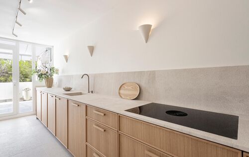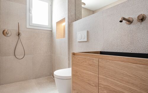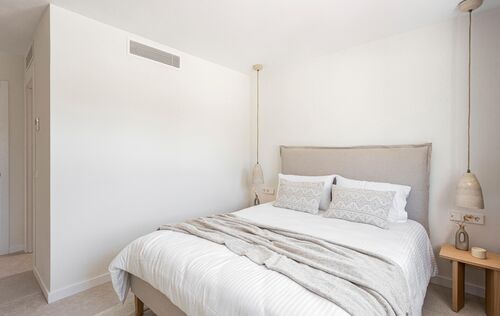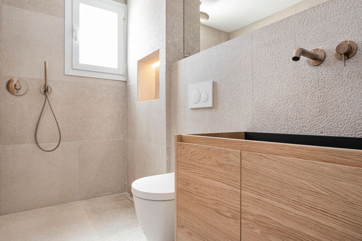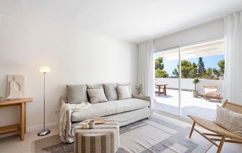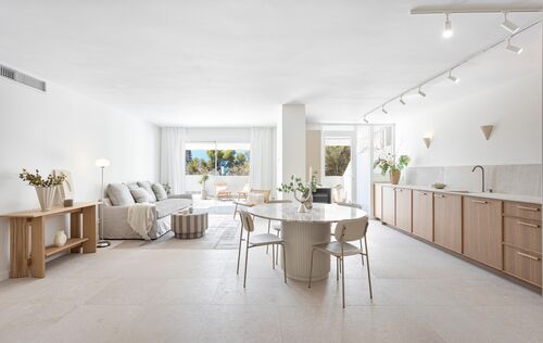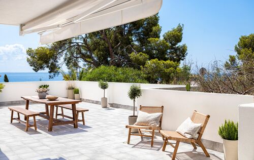 Diese Wohnung ist ein Diamant, der eine luxuriöse Innenausstattung, eine außergewöhnliche Terrasse und eine erstklassige Lage miteinander verbindet. Die Wohnung im Erdgeschoss verfügt über einen offenen Grundriss, der den Wohn- und Essbereich nahtlos miteinander verbindet und so eine harmonische und einladende Atmosphäre schafft. Die Designerküche, ein kulinarischer Traum für jeden Küchenchef, ist mit hochwertigen Gaggenau-Geräten, eleganten Eichenholzoberflächen und einer atemberaubenden Arbeitsplatte aus Binissalem-Marmor ausgestattet. Hochwertige Zarci-Natursteinböden ziehen sich durch die gesamte Wohnung und strahlen Eleganz und Langlebigkeit aus. Das Hauptschlafzimmer dient als privater Rückzugsort und verfügt über ein eigenes Bad und einen herrlichen Meerblick. Es gibt zwei weitere Gästeschlafzimmer, die sich ein Badezimmer teilen. Alle Zimmer sind durchdacht gestaltet, bieten viel Platz und sind hochwertig verarbeitet, um Komfort und Stil zu gewährleisten. Das wahre Highlight dieser Immobilie ist die 100 m² große Terrasse, die einen ungehinderten Meerblick und ein friedliches Ambiente bietet. Auf der Terrasse befinden sich ein Grillplatz sowie Ess- und Liegebereiche, die sich perfekt für Gäste oder ruhige Momente der Entspannung eignen. Zu den weiteren Annehmlichkeiten gehören ein großer Parkplatz innerhalb des Gebäudes, der Platz für zwei kleine Autos bietet, und ein großzügiger Abstellraum. Der direkte Zugang mit dem Aufzug vom Parkplatz zu Ihrer Wohnungstür bietet Ihnen Komfort und Privatsphäre. Ob Sie nun einen Hauptwohnsitz, ein Ferienhaus oder eine Anlageimmobilie suchen, es verspricht einen Lebensstil voller Eleganz und Gelassenheit.