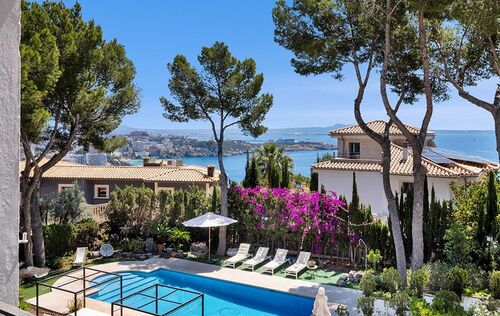 This excellent Mediterranean villa impresses with its very good location on a large plot ideal for families. It boasts perfect sun orientation, as well as high standards and very tasteful decoration. The villa is spread over 3 levels. The entrance is on the ground floor leading into a spacious hallway with a coat closet, a bright living and dining area with a fitted kitchen and plenty of storage. Also, on this level there is a double bedroom ensuite, a guest toilet, a laundry room and an additional maid´s bedroom with a separate entrance. From the living area you have access to the large covered terrace with a lounge area and outdoor dining space. The garden features a decked BBQ area on one side and a spacious lawn area on the other moreover a private boule court on the side of the villa. Few steps away you will find a large swimming pool with a great lounge and sunbed area. The middle floor offers 3 bedrooms, 2 with shared bathroom and the master bedroom ensuite with a large walk-in closet. All 3 bedrooms enjoy a wonderful sea view. At the top level of the house, you will find a cozy TV room leading out onto a small terrace, and the fifth bedroom with amazing sea views. Further features: garage with space for 2 large cars, air conditioning h/c, sauna, wine cellar, fitted wardrobes, large pool, alarm system and automatic irrigation system.
