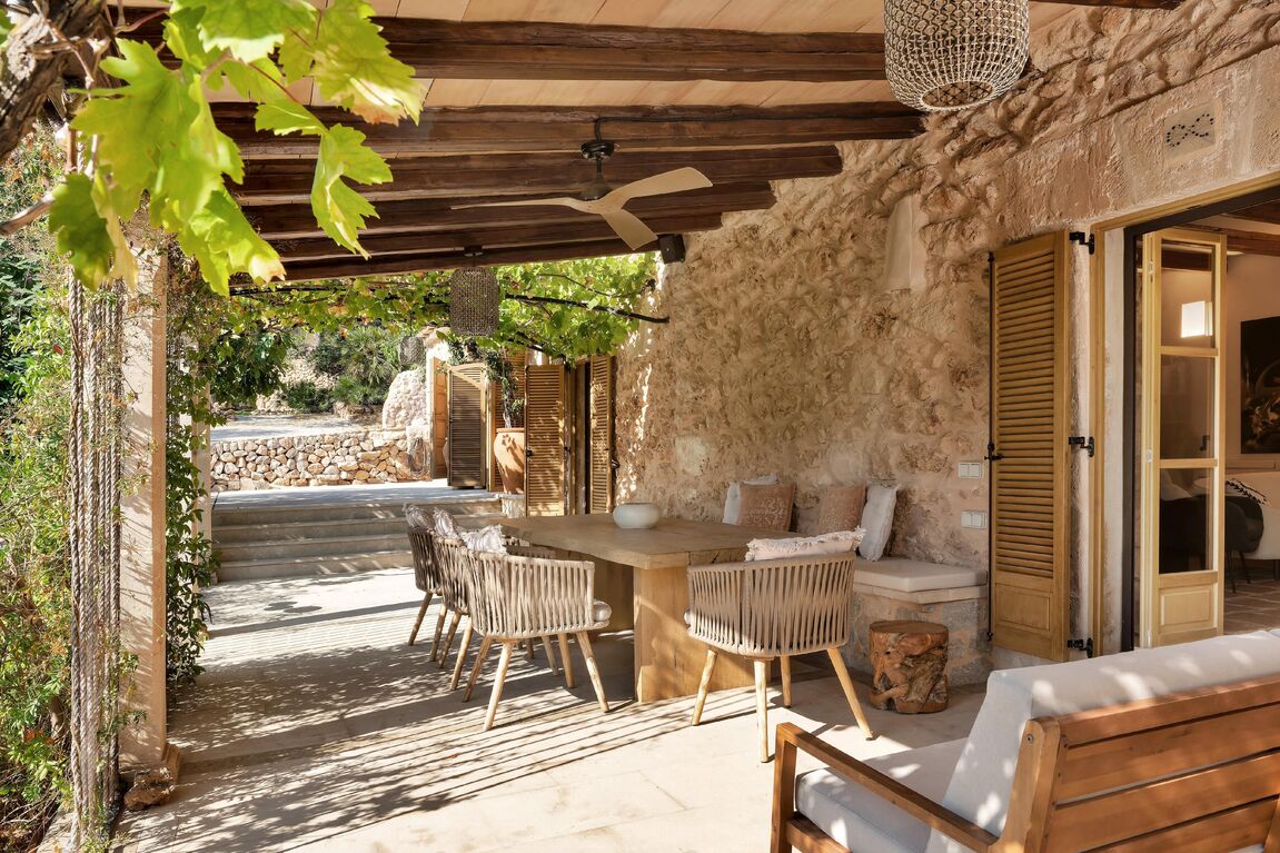 This exceptional country house in Mallorca combines authentic charm with contemporary living comfort and is a retreat for people seeking peace, privacy, and stylish restraint. The historic natural stone finca was renovated a few years ago with great sensitivity and attention to detail. Traditional elements such as exposed wooden beams, natural stone walls, and custom-made fixtures were harmoniously combined with modern accents such as clean lines, high-quality floors, elegant bathrooms, and a well-thought-out lighting concept. The result is a living environment that radiates warmth, comfort, and timeless elegance. The property is nestled in a green hilly landscape and offers picturesque views of the surrounding nature and mountains. The large, lovingly landscaped grounds offer numerous places to retreat: a harmoniously integrated pool area with a heated pool, shady pergolas with grapevines, an outdoor kitchen, and various outdoor dining areas. Almond and lemon trees underline the Mediterranean atmosphere. The technical equipment is also geared towards modern living comfort: a private well and cistern ensure the water supply, while central underfloor heating with a heat pump, air conditioning (hot/cold), and solar panels for hot water ensure sustainable energy efficiency. With its successful combination of traditional Mallorcan architecture, high-quality fittings, and idyllic location, this country house offers a retreat with soul—a place where you can enjoy the tranquility of nature and live in style at the same time.