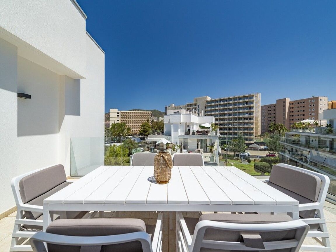 This modern penthouse is located in the heart of Palmanova only a few meters away by foot from the sandy beach, the long beach promenade with various cafés, restaurants, and all the necessary amenities. The property boosts three big terraces, making it perfect to spend as much time as possible outside throughout the year. When entering the penthouse, you will find a bright living area with access to two terraces, a fully equipped separate kitchen with its own breakfast terrace and three bedrooms with two bathrooms (one en-suite). The community itself offfers a clubhouse, a kids park and a bike rental office. Other extras of the property are: two underground garage parking spaces, air-conditioning w/c, alarm system and community pool.