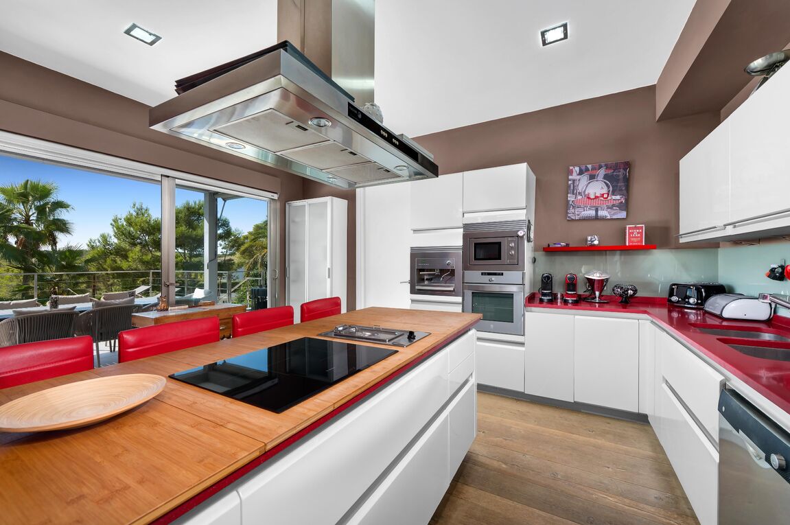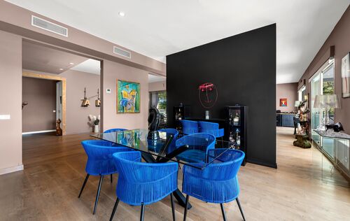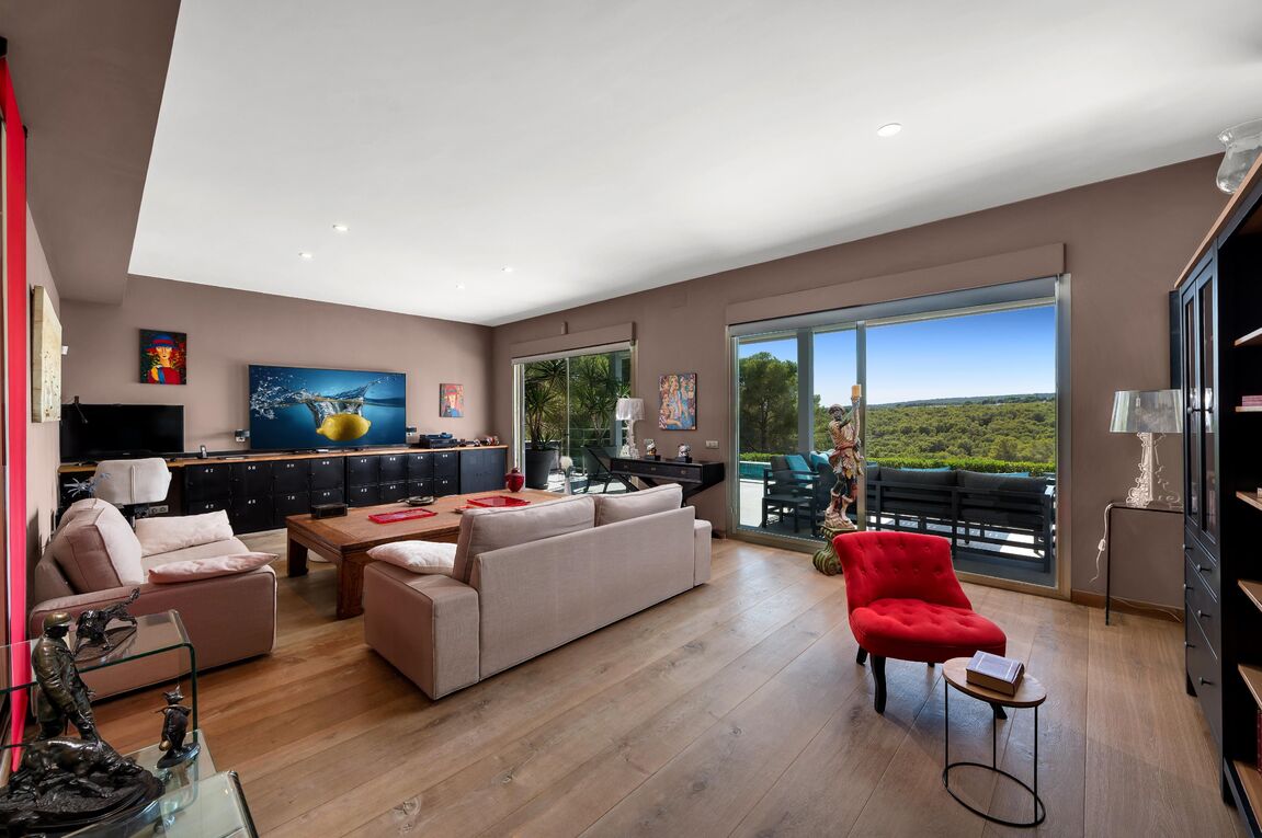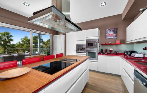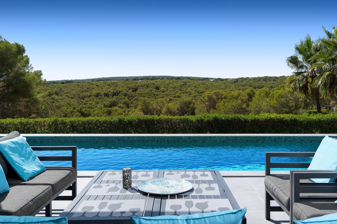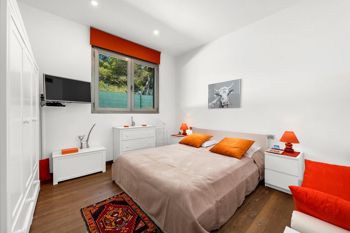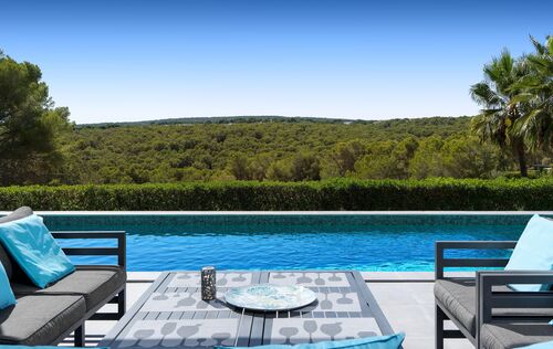 This cozy modern-style villa was built with noble and top-quality materials in 2007. It is located in the quiet luxury residential area of Cala Vinyas, just a few minutes' walk from Cap Falcó beach. The house is distributed on a single floor with a total of 232m2, offering great comfort. It is surrounded by vegetation and offers pleasant green and clear views. The daytime area consists of a spacious living and dining room with direct access to a large terrace, beautiful garden areas, and a 44 m2 water sheet pool. The property also includes a laundry room. It has two double bedrooms that share a full bathroom and a very spacious master suite, equipped with a dressing room, bathroom with jacuzzi, and access to a sunny terrace. It offers another full bathroom which, due to its location, can also be used as a guest toilet. Thanks to its southwest orientation, the house enjoys natural light throughout the day and spectacular sunsets. This is an ideal opportunity for those looking for a comfortable and bright home with lots of privacy in one of the most sought-after areas of southwestern Mallorca.