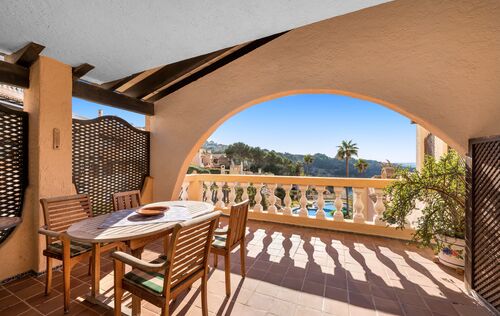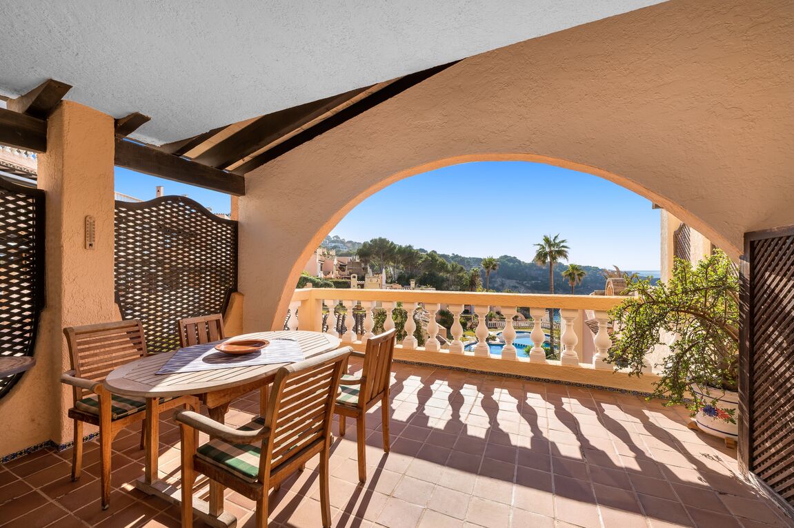 This cosy, sunny holiday apartment is located in one of the most popular residential complexes in Santa Ponsa, which is characterised by its unique location on the seafront and its beautiful pool and garden areas. The 78-square-metre apartment offers a bedroom, a bathroom, a kitchen and a living/dining area on the upper floor, with a large balcony offering a magnificent view over the pool to the sea. A spiral staircase leads to the lower floor, which has a spacious bedroom, a bathroom and a toilet. The property offers great potential and is ideal as a holiday home.