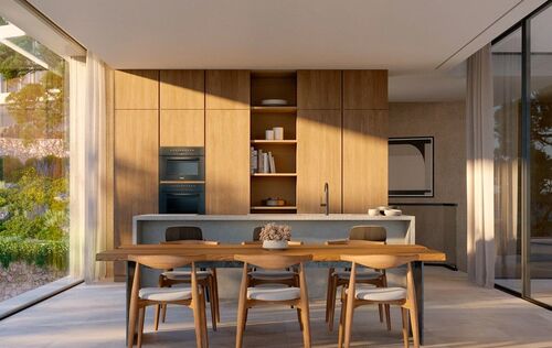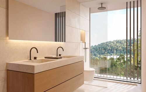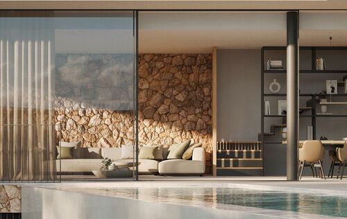 The villas feature 3-4 bedrooms and uniquely blend modern luxury with Mediterranean charm. They have been designed to provide residents with ample comfort and stylish living. The architecture is inspired by Mallorcan tradition and is reflected in the warm colors, natural stone floors, and traditional stone walls. The interior furnishings are of high quality: open kitchens with cooking islands and Miele built-in appliances, Gris Zarci natural stone floors, Iconico fittings, air conditioning, and underfloor heating with a heat pump, and more. Large windows with floor-to-ceiling aluminium frames from Technal allow plenty of natural light into the interiors and offer breathtaking views of the surrounding nature and the Mediterranean Sea. The open floor plans create a sense of spaciousness and generosity, while cozy living areas and elegant bedrooms with ample built-in wardrobes create a comfortable atmosphere. The private pool and outdoor terraces invite for sociable evenings outdoors or relaxed moments under the warm Mallorcan sun. Each villa also comes with a private underground garage or outdoor parking spaces on the property.