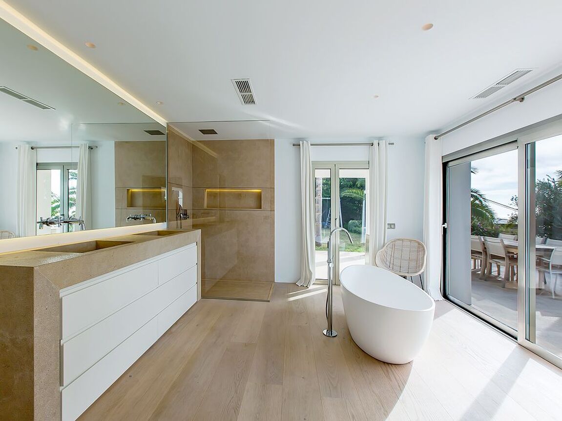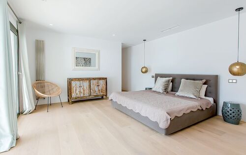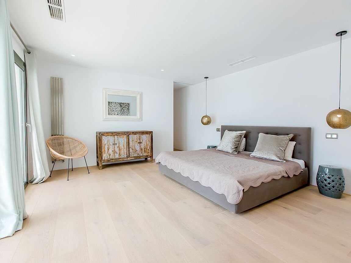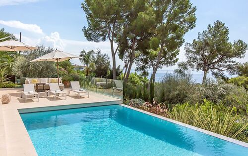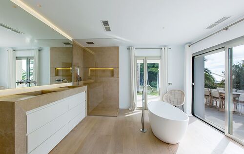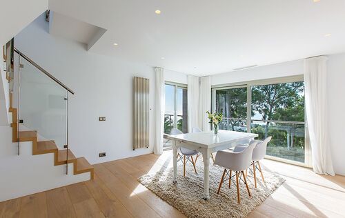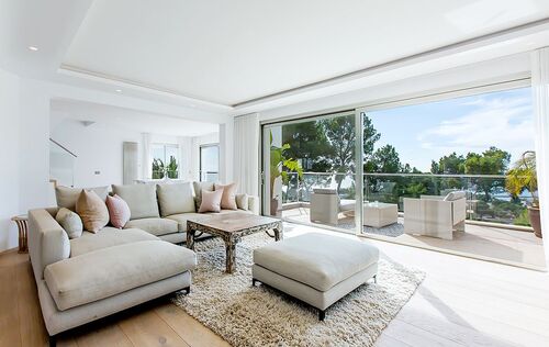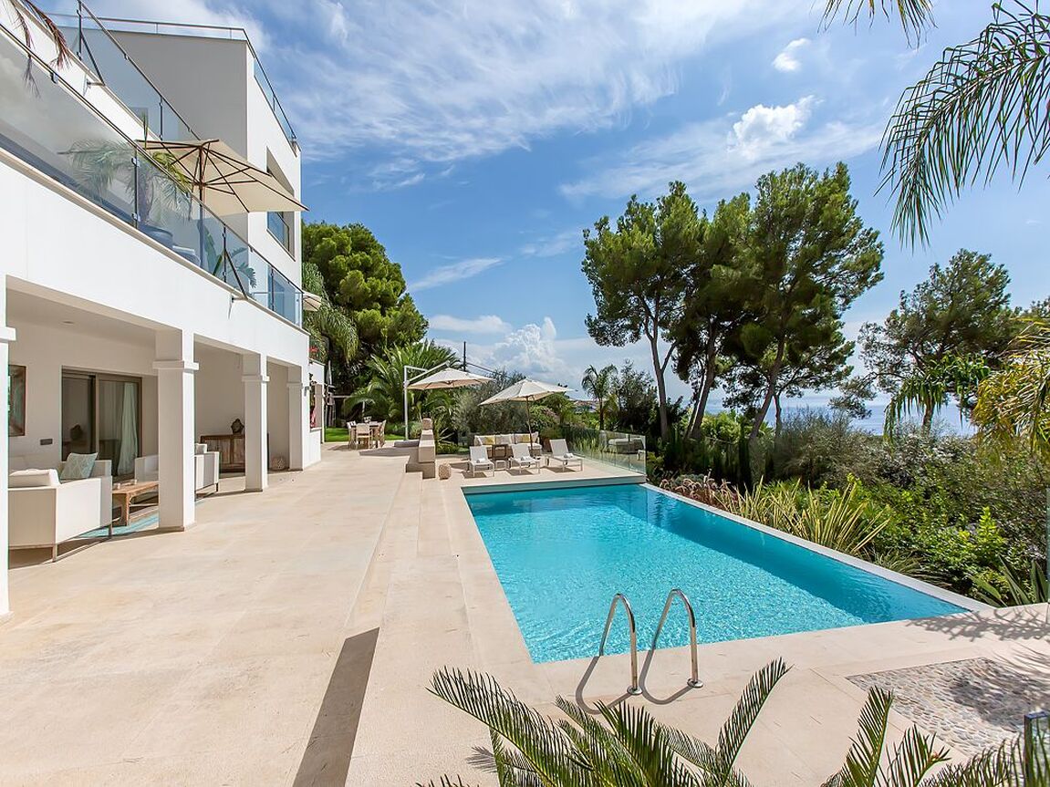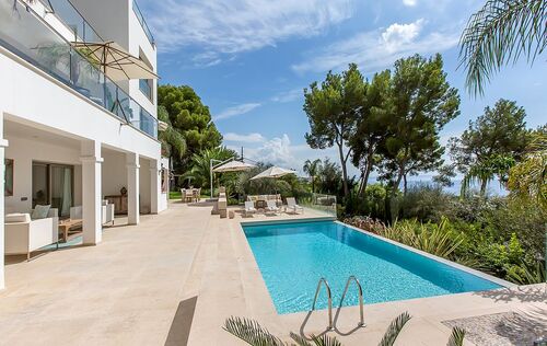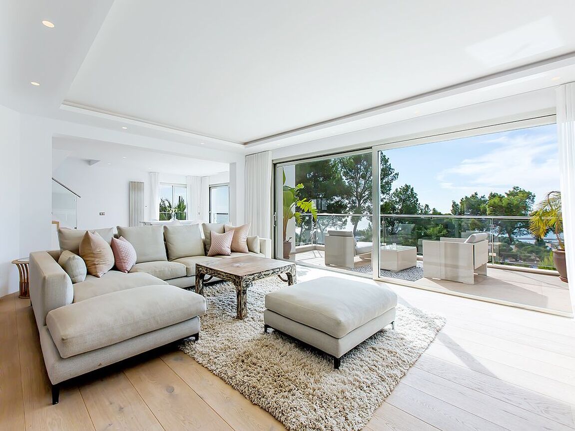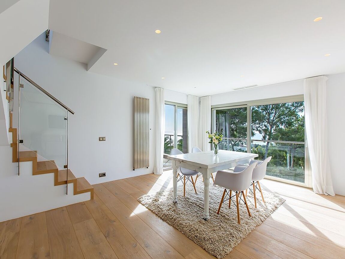 This contemporary villa, designed in a sleek, minimalist style, boasts breathtaking sea views and an exclusive location in a tranquil residential area above the prestigious Puerto Portals yachting harbor. Spanning three levels, the main floor features an elegant entrance leading into a spacious living and dining area, where floor-to-ceiling windows frame the spectacular Mediterranean scenery. An ultra-modern open-plan kitchen, a guest bathroom, and two en-suite bedrooms complete this level. The lower floor offers three additional en-suite bedrooms, a separate laundry room, and a generous gym area, all with direct access to the pool terrace and beautifully landscaped Mediterranean garden. The top floor presents a second living area that opens onto a stunning sun terrace, perfect for relaxing while enjoying panoramic sea views. Recently upgraded with top quality materials and high-end finishes, the villa seamlessly blends comfort and sophistication. Multiple terraces, a swimming pool integrated into the lush lawn garden, a double garage, and two outdoor parking spaces enhance the property’s appeal. Whether as a holiday retreat or a year-round residence, this exceptional home offers an unparalleled living experience.