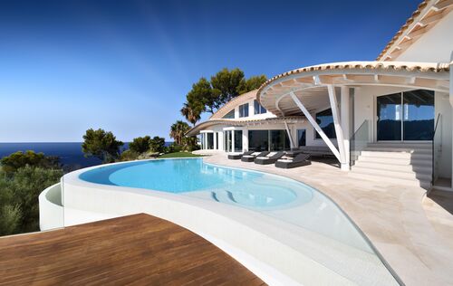 This modern villa, known as a ‘seagull’, is located in an elevated position in the sought-after urbanisation of Cala Marmacen, above Port Andratx, with expansive views over the bay and the surrounding hills. The surroundings are characterised by tranquillity, a mature neighbourhood and plenty of privacy – a rare combination near the harbour. The approximately 1,168 m² plot borders a green area on two sides and guarantees undisturbed hours outdoors. The architecture focuses on clean lines, open spaces and large windows that bring Mediterranean light into every room. On the ground floor, the living area flows seamlessly from the entrance hall to the spacious terraces, accompanied by a dining area, kitchen, TV room and three bedrooms. Each room faces the outside, allowing life to shift almost automatically to the terraces with views of the greenery or the water. The upper floor offers two further bedrooms, an additional living room and a garage with direct access to the house – ideal for families or guests who want their own space. With a total area of around 588 m² spread over three levels, the villa offers plenty of space for private life, guests, a home office or studio. The pool, with a water surface area of almost 67 m², is a central feature of the outdoor area – nestled in natural stone, flanked by sun loungers and surrounded by palm trees and bougainvillea. Equipped with air conditioning, underfloor heating, natural stone floors and smart home technology, the house meets modern living standards without compromising on its Mediterranean character. The villa was extensively renovated in 2023. It is more than just a second home and offers the opportunity to enjoy Mallorca to the fullest in every season – quiet, light-filled and with the feeling of having arrived.