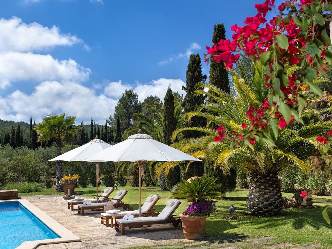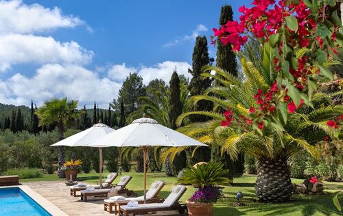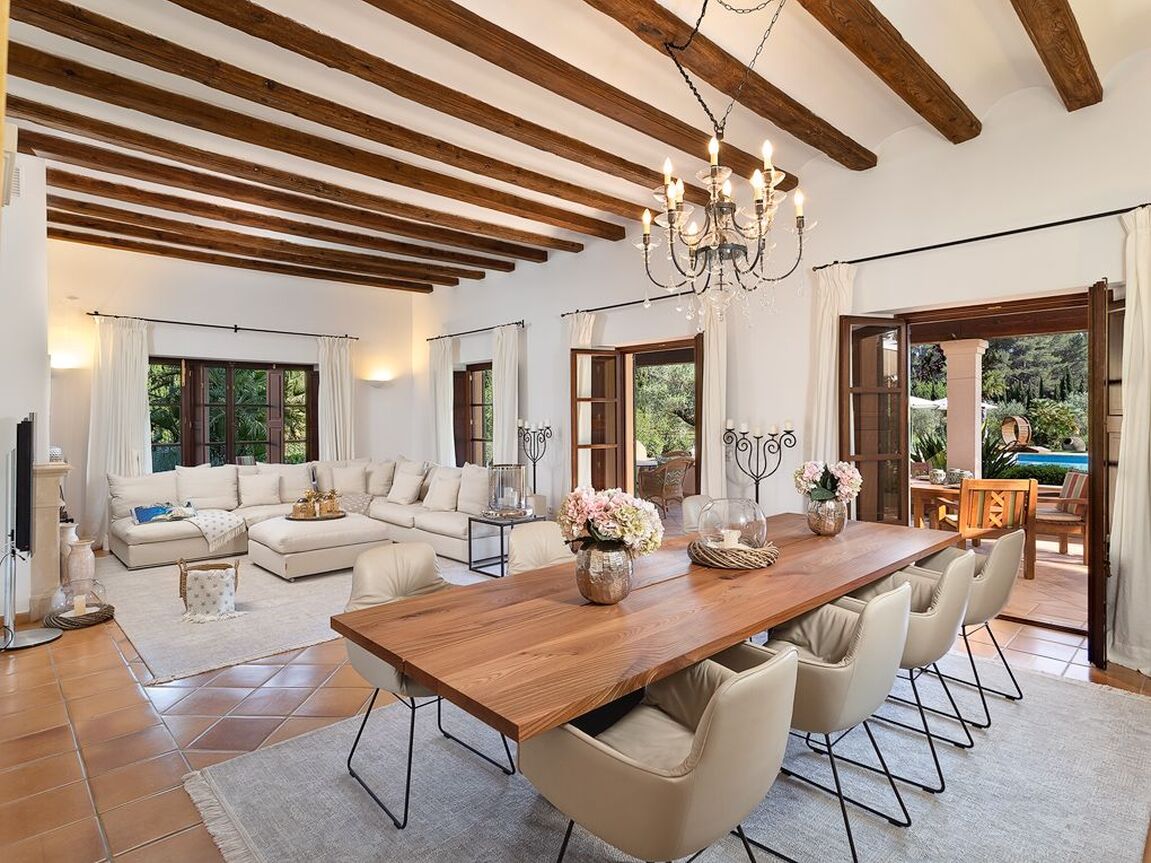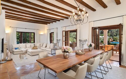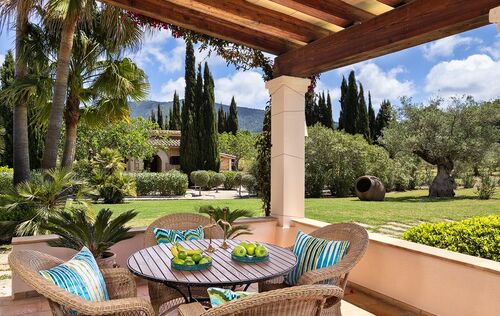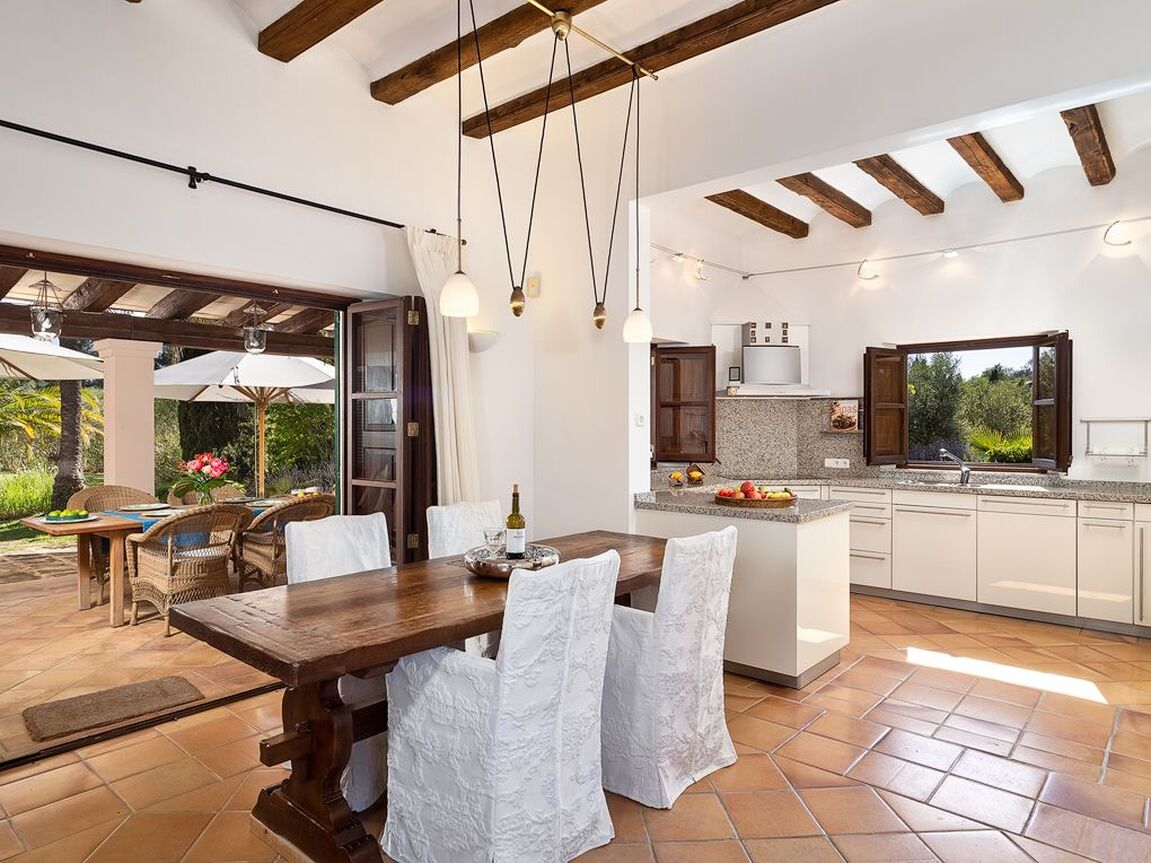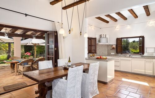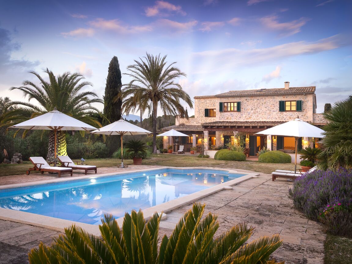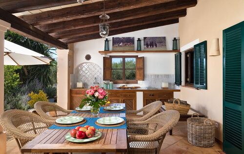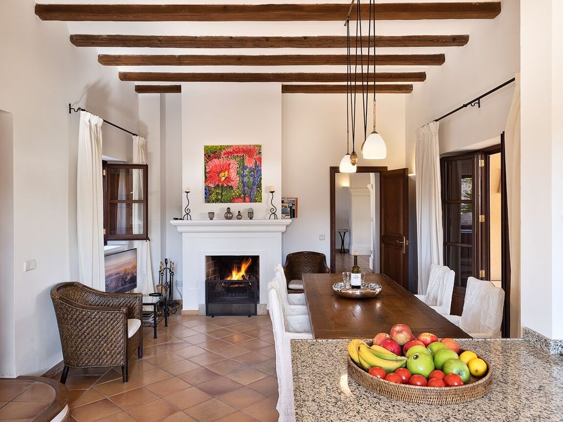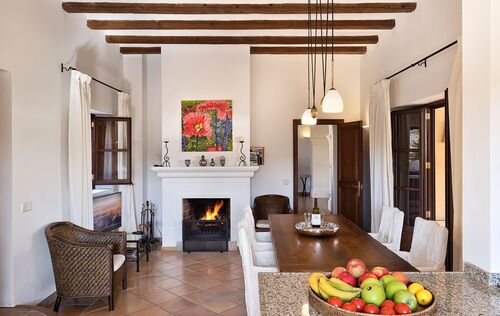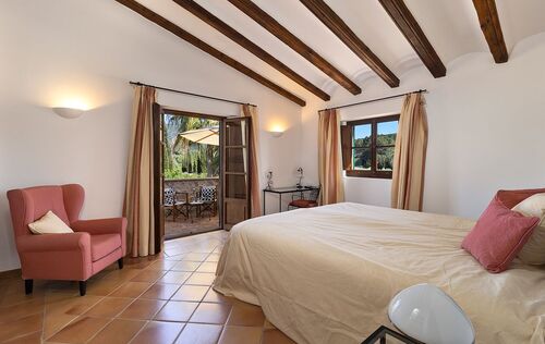 Nestled in the beautiful countryside of the small village of Calviá, this finca surrounded by blue lavender, palm trees swaying in the light breeze, twisted olive trees and the pink bouganvillas. The finca, built in 2001, itself looks as if it has been painted into the landscape - with its stone façade. A traditional front courtyard - the patio - forms the welcoming entrance to this gem. On this level of the finca, in addition to the spacious living room with dining area, you will find the open-plan kitchen with wood-burning fireplace - a place where the family likes to get together. The adjoining large covered terrace overlooking the pool, is home to the outdoor kitchen and is the perfect place for social evenings with family and friends. This is also the perfect place to serve your own grown red wine - about 300 litres a year are produced from the finca´s own vineyards. Furthermore, there are two bedrooms on this level, each with their en-suite bathroom. On the upper floor there are two further bedrooms, each with en suite bathroom, one of which is the master suite with dressing room - a fireplace is pre-installed here. Each of the bedrooms has its own terrace and thus offers perfect places of retreat. Let off some steam on the private beach volleyball court or do some refreshing laps in the pool. Another special feature of this exceptional property is its own olive oil production - the olive trees yield about 350 litres of oil. A small organic garden provides fresh vegetables and the citrus fruits all year long. A well supplies most of the water for this. Other features of the property: air conditioning in the bedrooms, electric underfloor heating, 3 fireplaces, carport, absolute privacy.