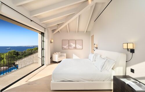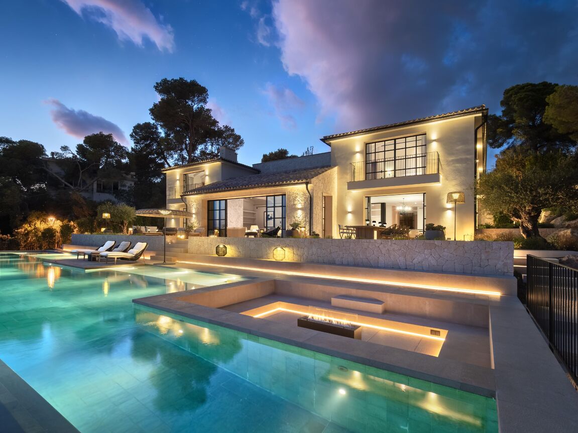 This elegant and cosy villa is located in the luxurious urbanization of Old Bendinat. The house is located adjacent to the park of Bendinat and captivates with breathtaking views of the coast, the open sea, all the way to the island of Cabrera and Illetas and surrounded by a beautifully landscaped garden. Only the best materials are used to complete this unique property and the Mediterranean style meets a touch of elegant modernity. The result is a unique property that will fascinate and beguile you at first sight. The high-quality and sophisticated oak wood flooring and the elegant natural beams, together with the combination of the white walls, convey a very special ambience that combines elegance and comfort. The large windows allow you to enjoy the panoramic view from every room. The property has hot/cold air conditioning, underfloor heating, solar panels, satellite TV and an integrated sound system. Furthermore, there is garaging for 4 cars, with additional secure parking, a pool of 26 metres to name just a small part of the amenities of this property. The centre of Palma is only 10 minutes away and the port of Puerto Portals and the Sailing Club of Calanova only 5 minutes by car.