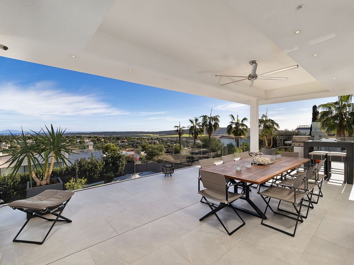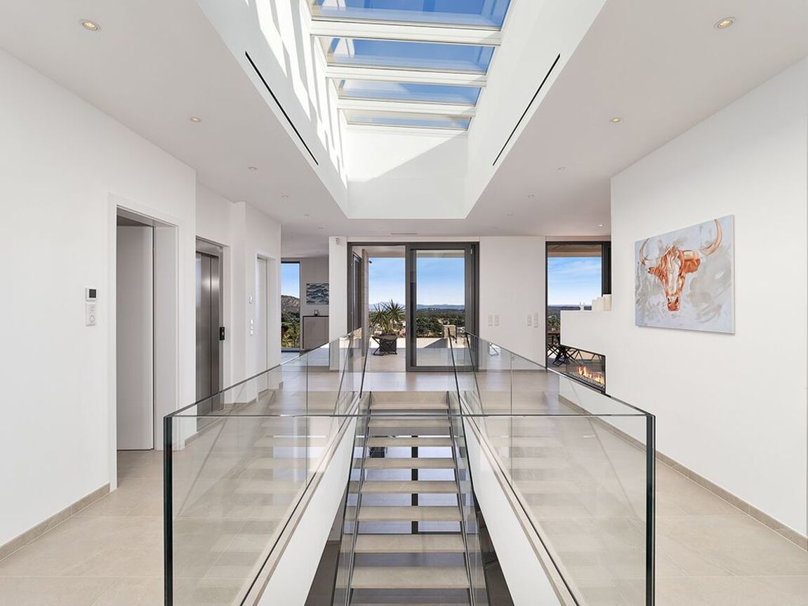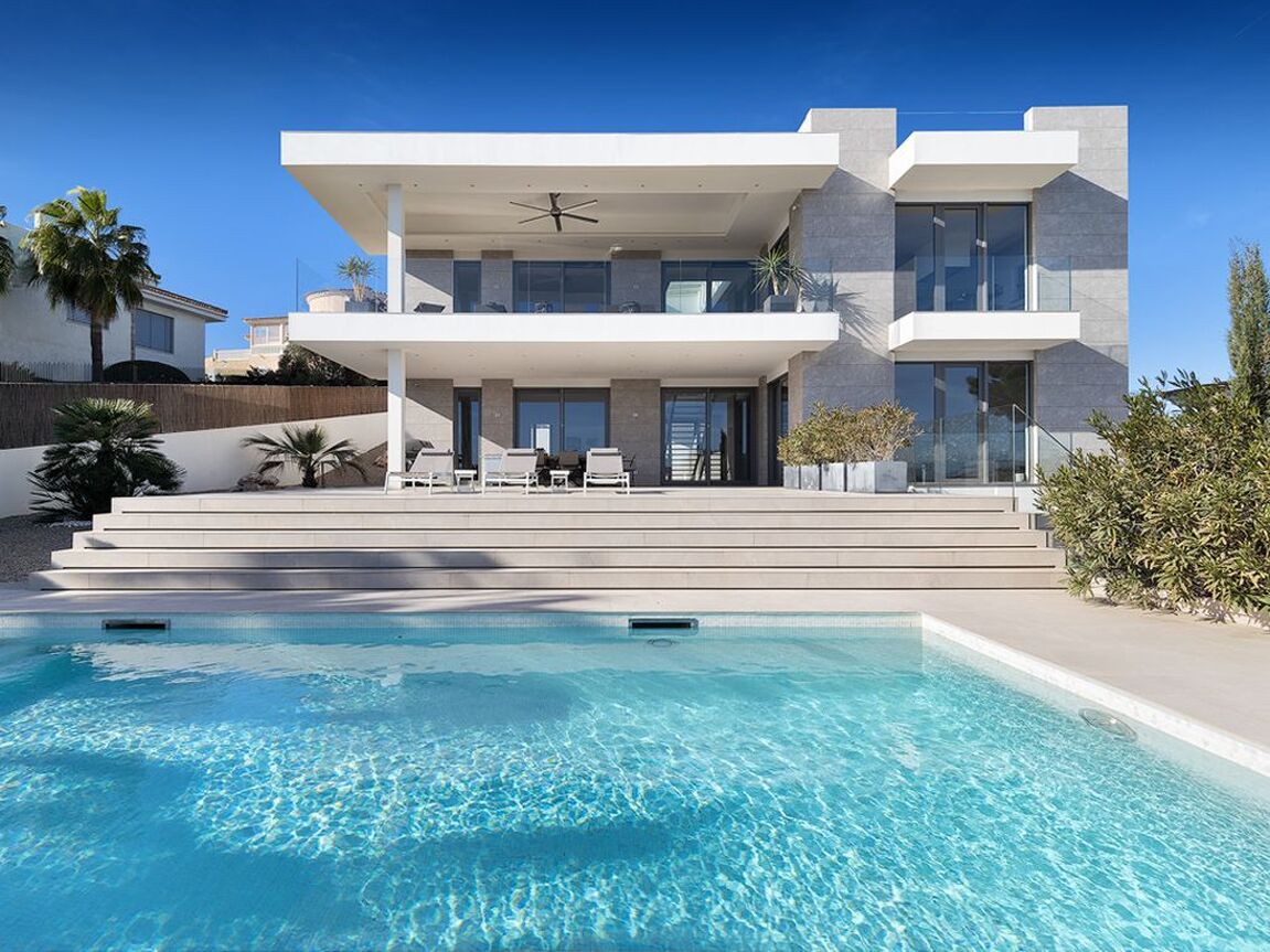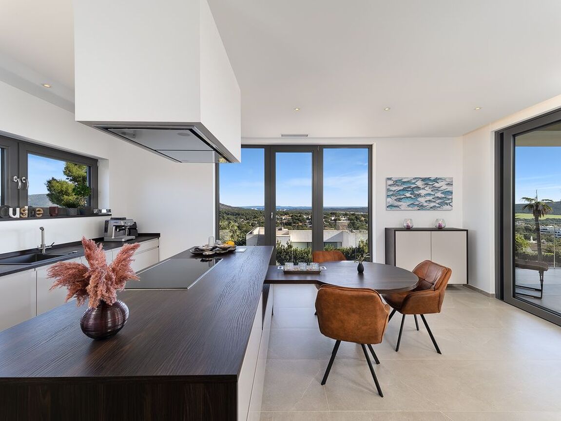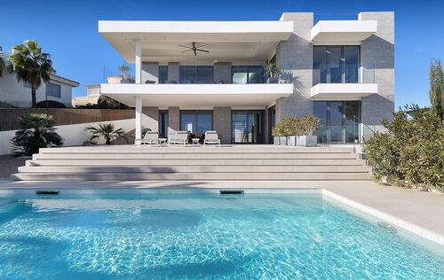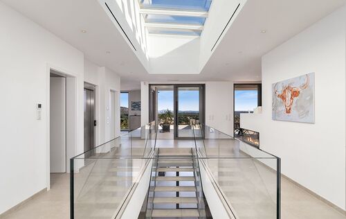 Space and light, both inside and outside, are the main axis of this exceptionally stylish villa. Built on an elevated plot in one of the most desirable locations in Nova Santa Ponsa, its elevated position offers breathtaking panoramic views of the surrounding countryside, the Tramuntana mountains and the Bay of Palma. The linear architecture, designed by Mallorcan architect Alejandro Palomino, and the spacious and open living and outdoor areas make this property unique and impressive. Built with only the best materials and first class technology, the house offers pure luxury and comfort. The light-flooded entrance area with a skylight roof gallery and the iconic staircase are eye-catching. The elegant designer fireplace serves as a further highlight and room divider. The open-plan living area with designer kitchen, dining and living room as well as a guest room extend onto the spacious covered outdoor terrace. The master bedroom with en suite bathroom and a large dressing room, two double bedrooms, bathroom and utility room are located on the lower level, the partly covered pool terrace invites to enjoy comfortable seating and sunbathing. Here there is access to the outdoor area and a flat Mediterranean garden. The spacious pool and the partly covered outdoor terraces invite friends and family to lounge and relax. Extras: Lift, underground garage for 5 cars, air conditioning, hot water supported by a solar system, electric shutters, alarm system with surveillance camera and smart home system, year of construction 2021, security front door, Velux Skylights roof gallery with automatic shading, ceramic facade cladding.