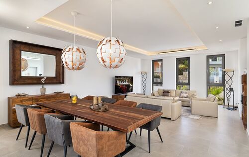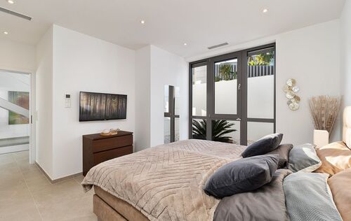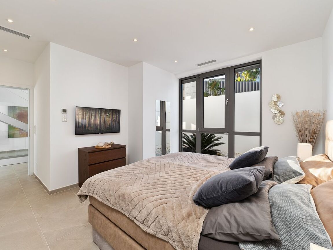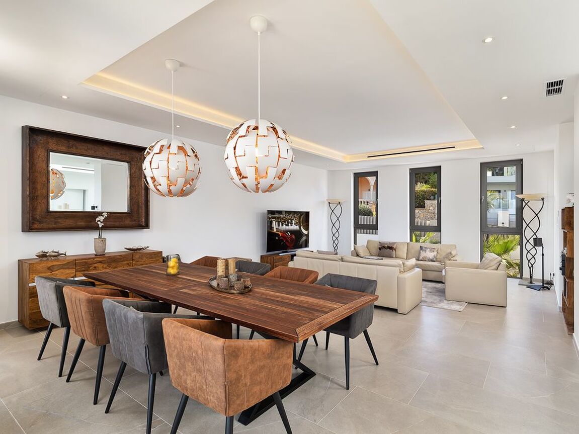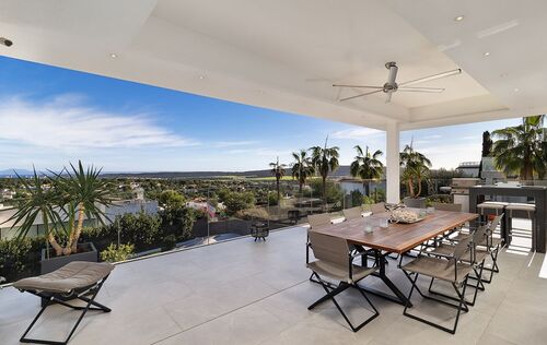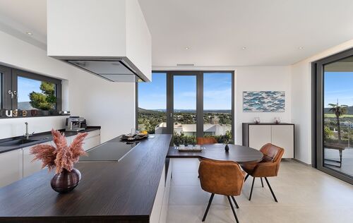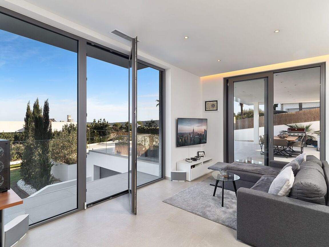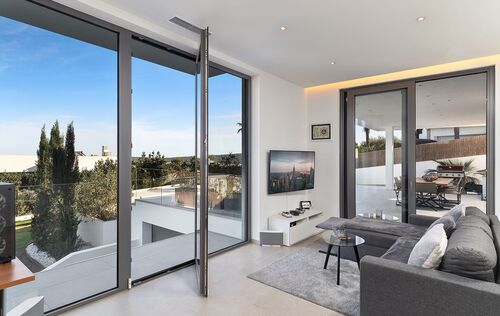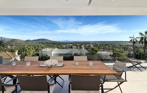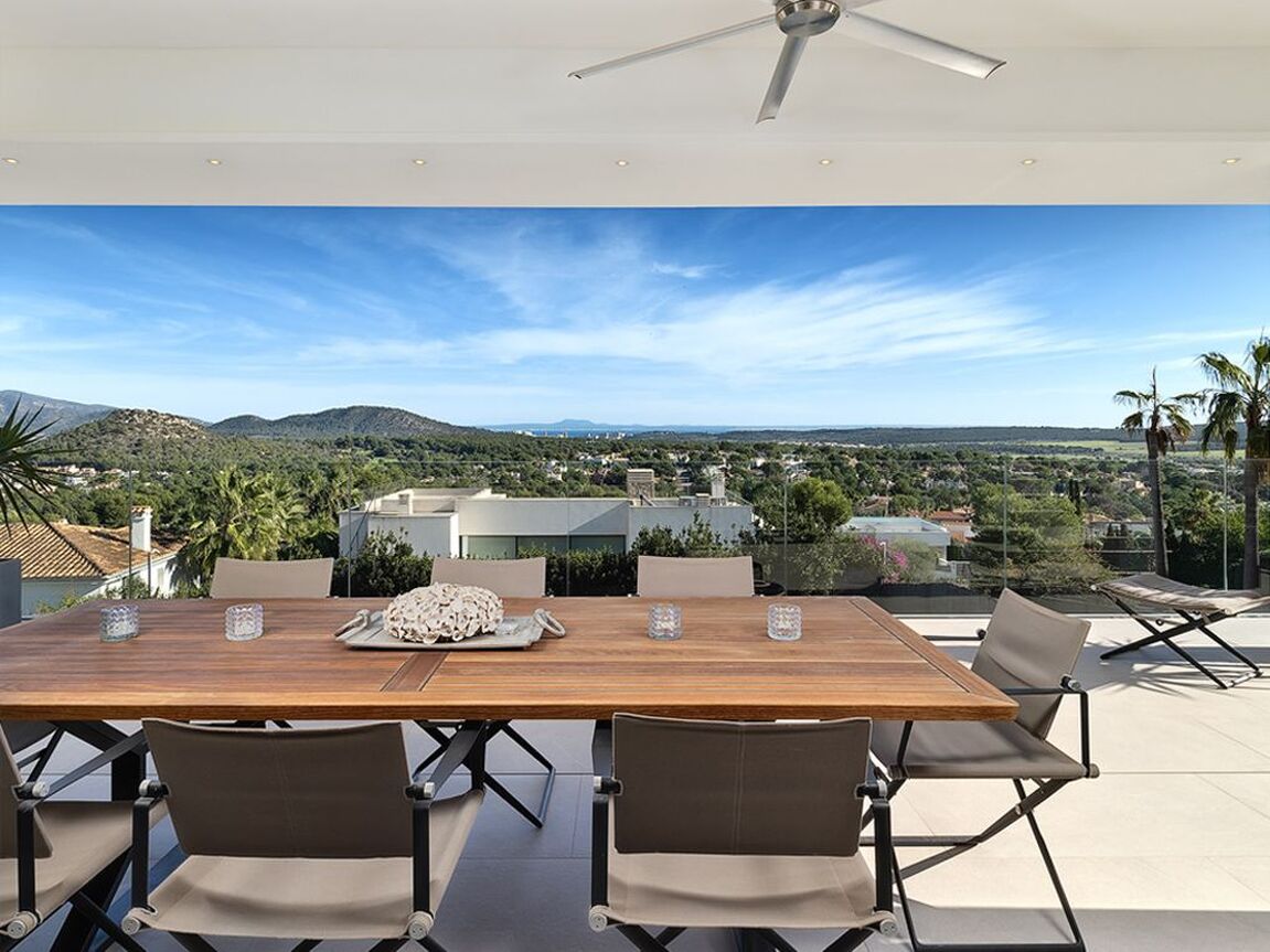 Space and light, both inside and outside, are the main axis of this exceptionally stylish villa. Built on an elevated plot in one of the most desirable locations in Nova Santa Ponsa, its elevated position offers breathtaking panoramic views of the surrounding countryside, the Tramuntana mountains and the Bay of Palma. The linear architecture, designed by Mallorcan architect Alejandro Palomino, and the spacious and open living and outdoor areas make this property unique and impressive. Built with only the best materials and first class technology, the house offers pure luxury and comfort. The light-flooded entrance area with a skylight roof gallery and the iconic staircase are eye-catching. The elegant designer fireplace serves as a further highlight and room divider. The open-plan living area with designer kitchen, dining and living room as well as a guest room extend onto the spacious covered outdoor terrace. The master bedroom with en suite bathroom and a large dressing room, two double bedrooms, bathroom and utility room are located on the lower level, the partly covered pool terrace invites to enjoy comfortable seating and sunbathing. Here there is access to the outdoor area and a flat Mediterranean garden. The spacious pool and the partly covered outdoor terraces invite friends and family to lounge and relax. Extras: Lift, underground garage for 5 cars, air conditioning, hot water supported by a solar system, electric shutters, alarm system with surveillance camera and smart home system, year of construction 2021, security front door, Velux Skylights roof gallery with automatic shading, ceramic facade cladding.