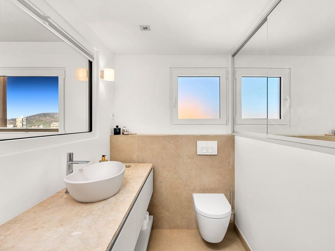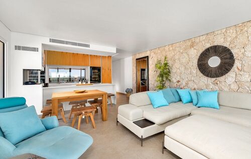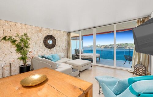 For sale: a unique apartment in a prime first-line location, offering the ultimate Mediterranean lifestyle. Situated on the upper floors of a well-maintained residential complex which was built in 1965, the spacious L-shaped terrace provides breathtaking panoramic views of the deep blue Mediterranean – perfect for breakfast in the sun or an evening glass of wine. The complex features a private pool and direct access to the sea, making it the ideal place to relax and enjoy the crystal-clear waters of Mallorca. Recently fully renovated, the apartment combines modern comfort with authentic Mallorcan charm. An original stone wall adds a stylish accent and a warm, inviting atmosphere. With two bedrooms and an additional room that is perfect as an office or guest room, the apartment offers flexibility for any lifestyle. Modern air conditioning, a stylish gas fireplace, and underfloor heating ensure year-round comfort. This apartment is perfect for anyone looking to live the dream of a home in Mallorca right by the sea – whether as an exclusive holiday retreat or a permanent residence. Don’t miss this unique opportunity!