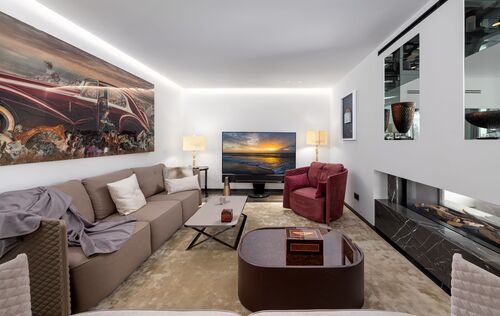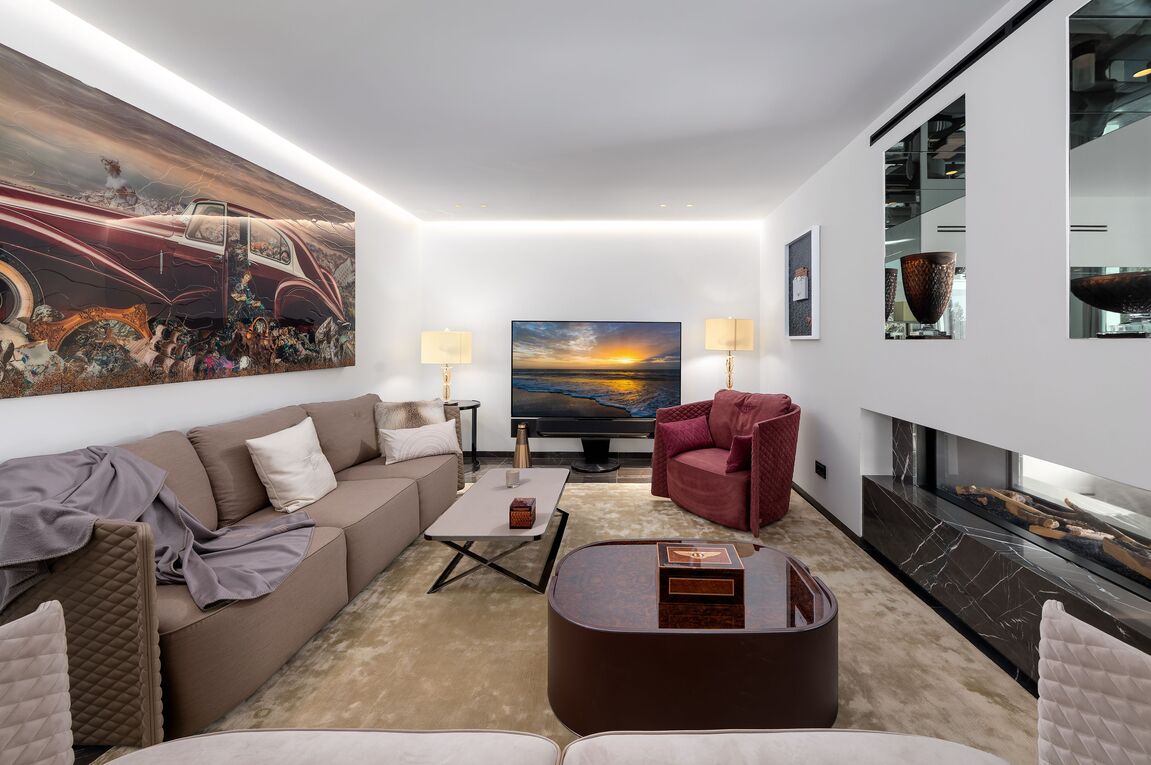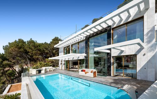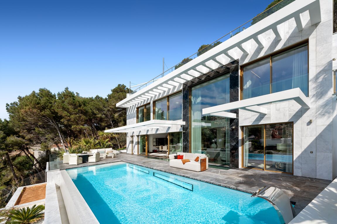 Set on a privileged hillside in Cala Llamp, one of Mallorca’s most exclusive residential locations, this exceptional designer villa stands as an architectural statement of timeless elegance and modern luxury. With unobstructed views of the open Mediterranean and spectacular sunsets, this residence combines the utmost privacy with a unique quality of life. The clean, minimalist architecture is characterised by generous, floor-to-ceiling glass fronts that seamlessly blend indoor and outdoor spaces, making the sea the central design element. Light-filled rooms, open-plan layouts and fluid transitions create a sense of spaciousness and lightness. The interior has been realised to the highest standards of design and quality. Renowned designers have shaped the décor, with much of the furnishings in the characteristic style of Fendi Casa, lending the property an unmistakable, international touch of luxury. High-quality materials, bespoke fittings and finely coordinated details underline the exclusive character of this villa. The villa features four spacious bedrooms and five elegant bathrooms, guaranteeing the highest level of comfort. The open-plan living and dining area with an integrated fireplace forms the heart of the home and opens directly onto the spacious sun terrace with an impressive infinity pool that visually merges with the horizon. A private home cinema complements the exclusive living space and creates a retreat for special moments. The outdoor areas have been designed as a private oasis of well-being, with spacious terraces, stylish lounge areas and covered chill-out zones, enabling year-round outdoor living of the highest standard. This property combines an exclusive location, outstanding architecture and world-class facilities, and is aimed at discerning buyers seeking something truly special.
