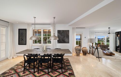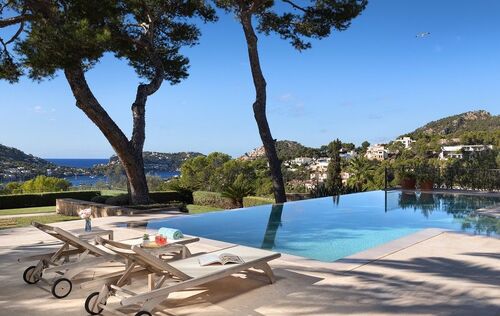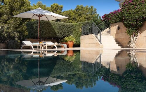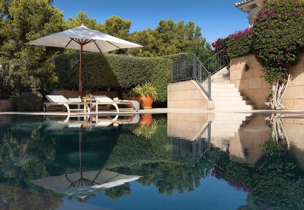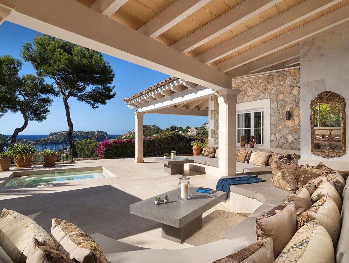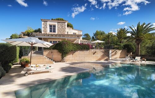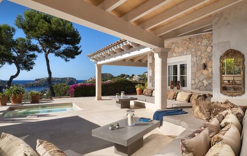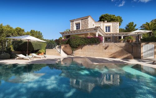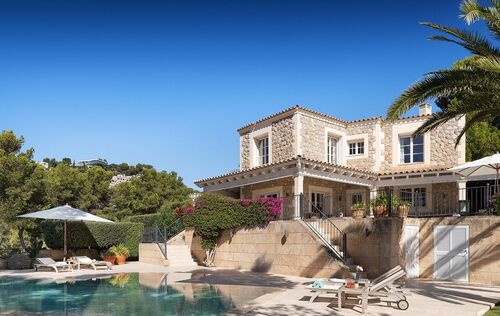 This exceptional family villa in best location is situated on a flat plot with harbour and sea views. High-quality stone walls and facades give the house a Mediterranean and elegant appearance. The flat plot offers much space for several sun terraces, pool as well as planted and unplanted garden areas. The main house is separated in a living area with kitchen and dining room with fireplace on the ground floor and a sleeping area with 3 bedrooms and 3 bathrooms on the upper level. The adjoining guest house comprises an open, fully equipped kitchen, 3 bedrooms and 3 bathrooms on two storeys. The property has a garage for one car and a carport for a second vehicle. The whole villa has been completely refurbished and tastefully furnished. The outdoor area provides roofed and free terraces, a barbecue area, Jacuzzi, pool and garden. The whole plot offers wonderful sea and harbour views and absolute privacy and tranquility. Further features are heating, air condition, alarm system and electric shutters. The harbour and the centre of Port Andratx are only a 5 – 10 minute walk away.