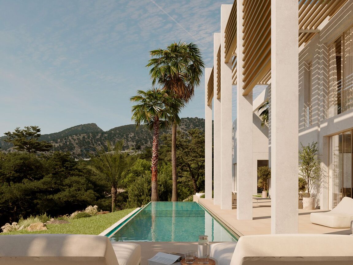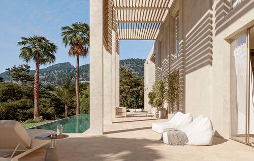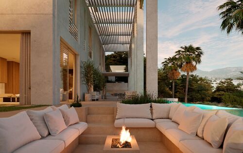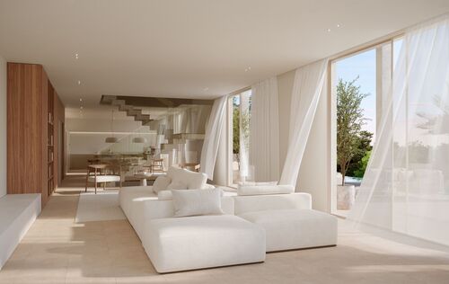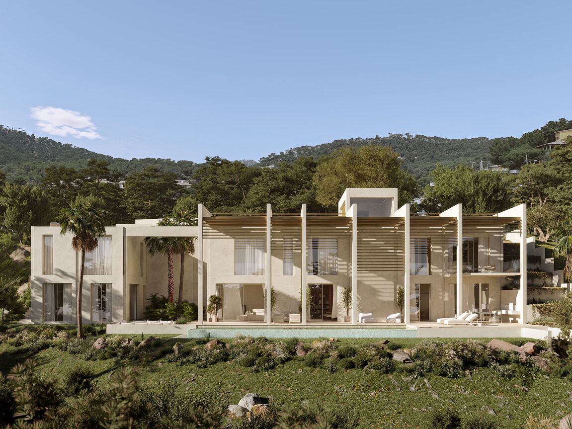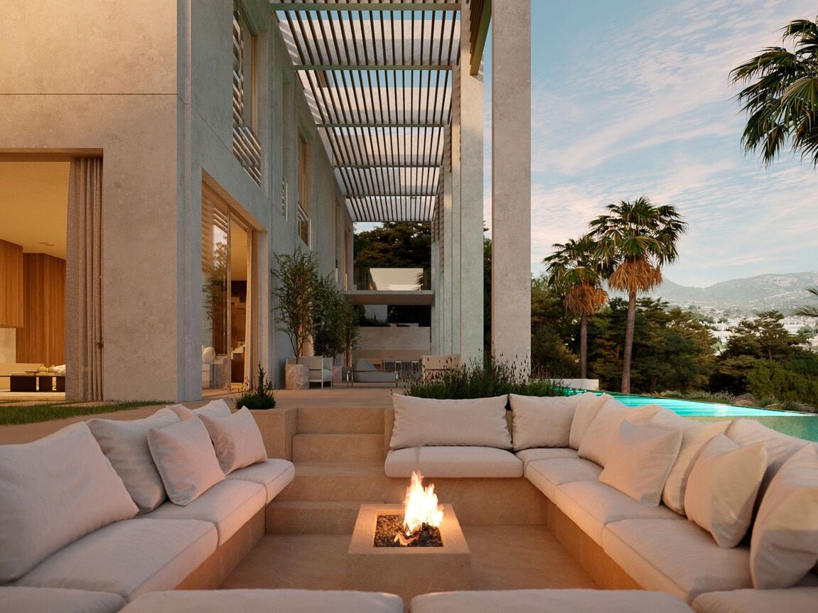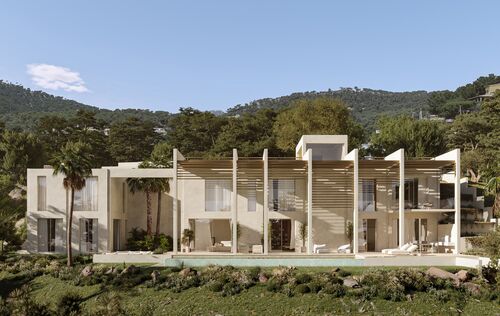 This exceptional newly built villa is located in one of the most exclusive areas of south-west Mallorca and offers a perfect combination of luxury, comfort and privacy thanks to its design and layout. The front area impresses with a spacious entrance with a private paved driveway and parking for three vehicles. A foyer leads to an external staircase, an internal staircase and a lift connecting all floors. The upper floor houses the master bedroom with a large en-suite bathroom, a dressing room and a private terrace that invites you to relax. Two further bedrooms, each with their own en-suite bathroom and balconies, offer privacy and comfort. In addition, there is another duplex guest room, which is only accessible via a separate staircase. This room also has its own bathroom and a balcony, making it the perfect retreat for guests. On the ground floor is the spacious living room with adjoining open-plan kitchen by the prestigious Bulthaup brand, equipped with high-quality appliances by Gaggenau. All rooms have direct access to the partially covered terrace, which leads to the elegant swimming pool and combines maximum comfort indoors and outdoors. Also on this floor is the lower level of the duplex guest room with its own living room and dining room, offering guests complete independence. The laundry and technical rooms are located in the basement. Further features include: outdoor fire pit, 4-person jacuzzi, patio, lift to all levels, Pool of 17m length and an external guest apartment.