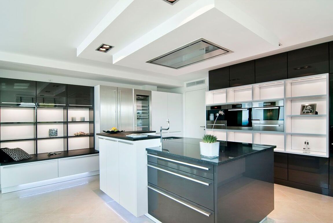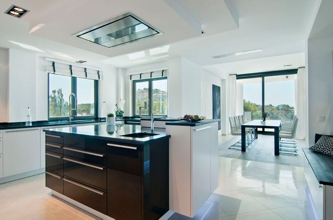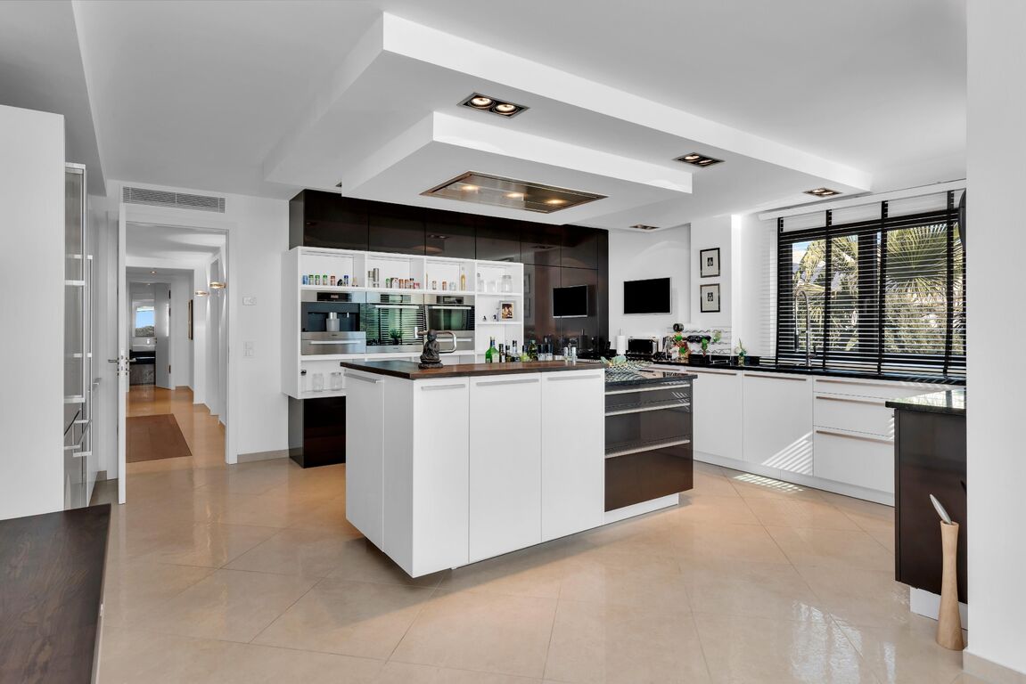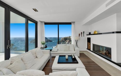 This stylish sea-view villa in a Mediterranean-modern design is located in a prime position in Santa Ponsa, in immediate proximity to the sea, and offers breathtaking panoramic views over the bay and the coastline. The unobstructed sea view creates a special living atmosphere at any time of day and unfolds into a fascinating play of lights, especially in the evening. The villa impresses with a well-thought-out layout, light-filled rooms, and a harmonious combination of modern architecture and Mediterranean lifestyle. Spacious, open-plan living areas with a modern open kitchen form the heart of this sea-view villa, while a fireplace provides a cozy atmosphere during the cooler months. On the main living level, there is also an office, a guest WC, and a comfortable bedroom with an en-suite bathroom. An elevator ensures a high level of living comfort and makes the property ideal for people with reduced mobility. On the upper floor, you will find two bedrooms with en-suite bathrooms as well as the generous master suite with walk-in wardrobe and elegant bathroom – all bedrooms offer spectacular sea views in Santa Ponsa. A special highlight is the pool level with a very large covered terrace, which provides a pleasantly cool place to relax even on hot summer days. The fully equipped outdoor kitchen with BBQ is perfect for sociable evenings with family and friends. The property is complemented by a separate guest apartment with two bedrooms and en-suite bathrooms, offering a high degree of privacy. Underfloor heating (air-source heat pump), hot/cold air conditioning, two garages, and the proximity to golf courses, marinas, beaches, and international schools make this exclusive villa in Santa Ponsa an ideal year-round residence on Mallorca.