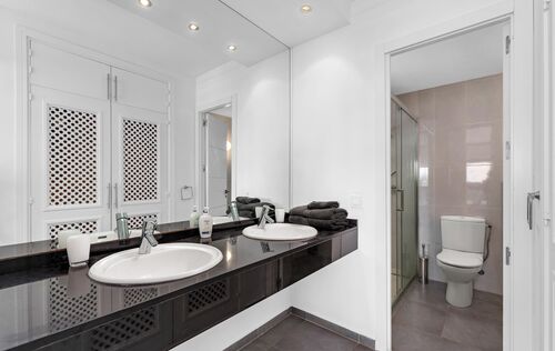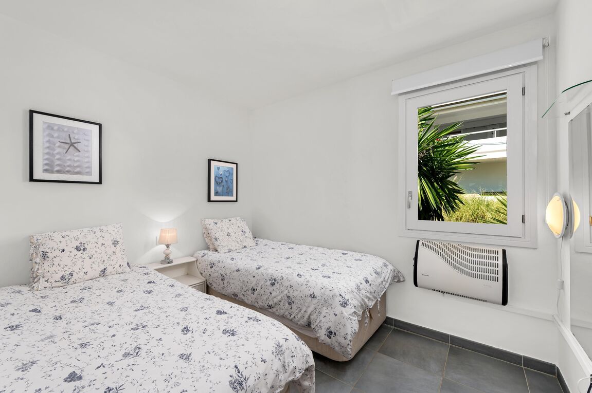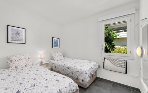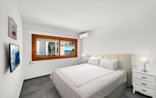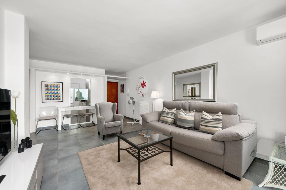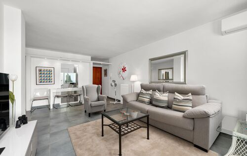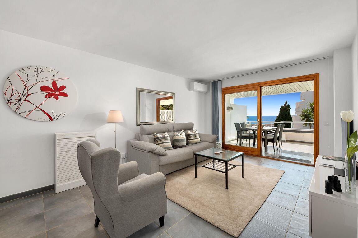This sea views holiday apartment is located in the prestigious residential complex Las Terrazas, just steps away from the renowned Puerto Portals marina, one of the most exclusive and vibrant destinations on the southwest coast of Mallorca. The apartment boasts a bright living and dining area with a fully equipped kitchen, all oriented to take full advantage of the beautiful sea views. Floor-to-ceiling sliding doors lead to a generous, covered terrace, perfect for al fresco dining, sunbathing, or simply enjoying the gentle sea breeze and stunning sunsets. The master bedroom has a fitted wardrobe and an en-suite bathroom. For guests you have a smaller bedroom and a separate bathroom. The property also includes a private parking space, an added convenience in this popular area. Residents of Las Terrazas enjoy access to a beautifully maintained communal pool surrounded by sun loungers and lush greenery. The complex also offers direct access to the marina, placing you within walking distance of everything from fine dining and trendy bars to boutique shopping and yachting services. Whether you are looking for a stylish holiday retreat, a seasonal getaway, or a solid investment in one of Mallorca’s prime locations, this apartment is the perfect choice.
