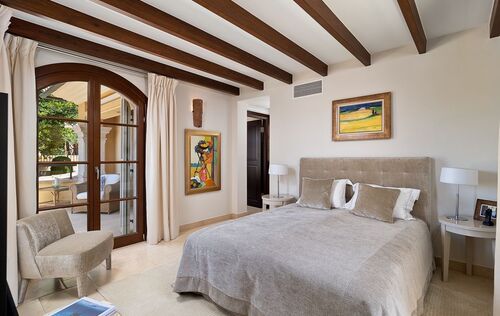 This large Mediterranean villa with lots of privacy is one of the outstanding properties in Puerto Andratx. Thanks to its location, the villa has a sensational view of the harbour and the open sea, which can also be reached on foot in a few minutes. The property is of the highest quality and technically up to date, including camera surveillance and domotic system. The villa consists of three buildings all with two levels, a main house with three bedrooms and a large, representative living room, TV room and library, a guest house with three bedrooms and a further guest - or employee house with a studio flat. The villa has two entrances and a garage for two cars. A well-maintained garden and several covered and open terraces offer plenty of space to spend time outdoors. On the pool level there is a fully equipped outdoor kitchen with large terrace, fitness room and sauna with full bathroom. Upstairs is the guest flat with two bedrooms with en-suite bathrooms and a living/dining room with kitchenette. The house has been completely renovated in 2021 and furnished with Italian furniture. The house technology is up to date. Creston system for the house domotics, home cinema by Bang&Olufsen, music system, PC server, intercom and much more.