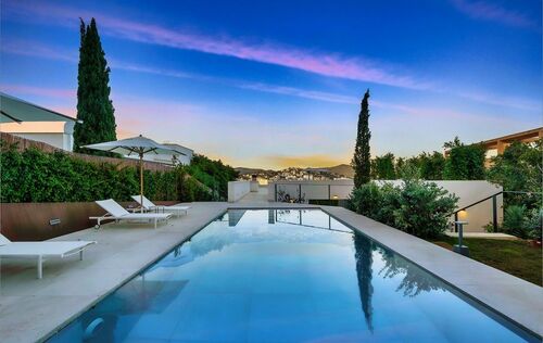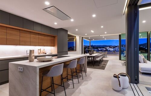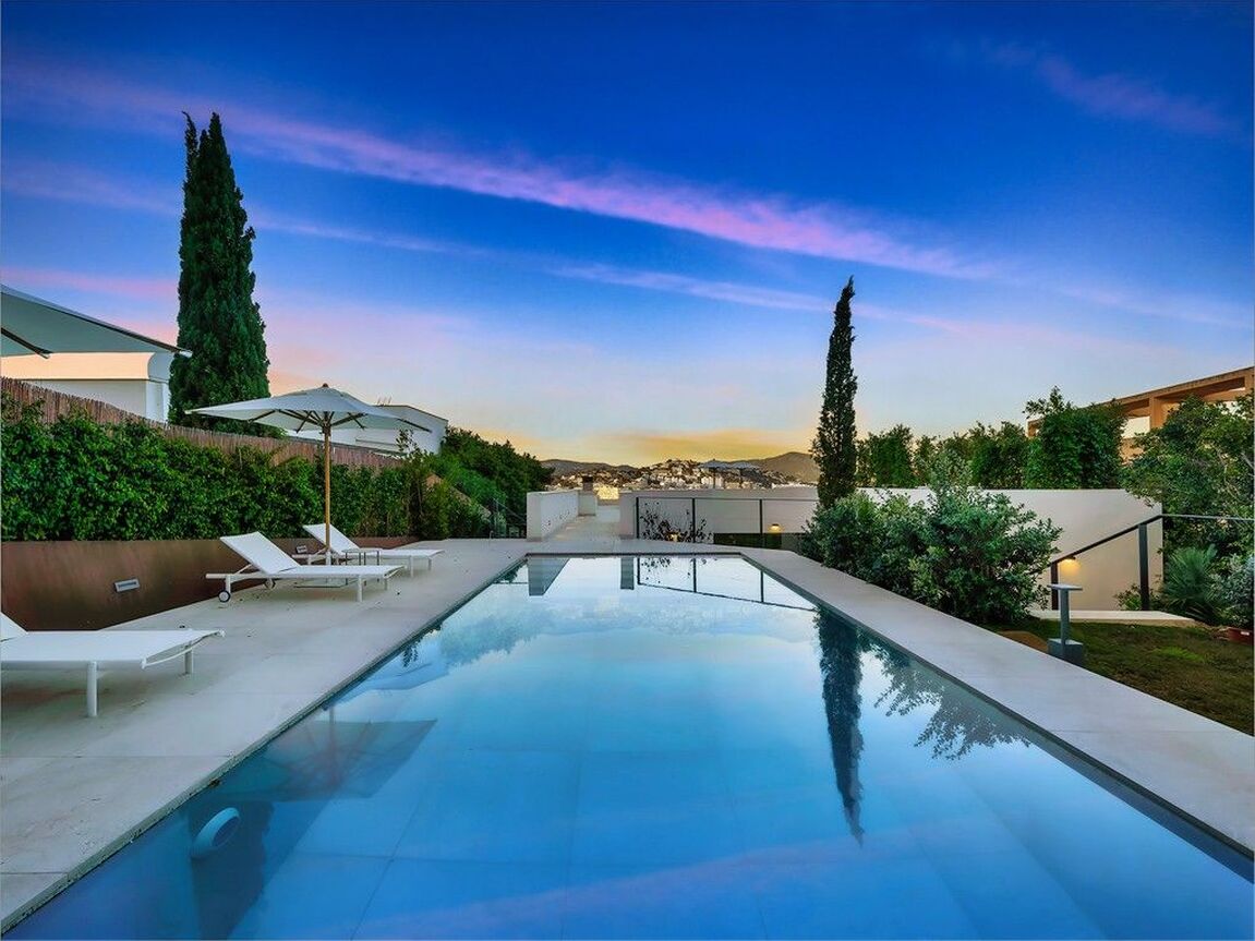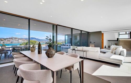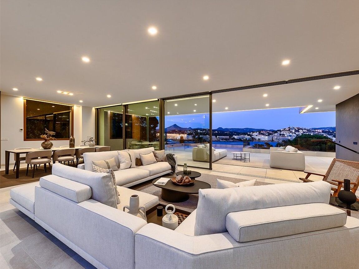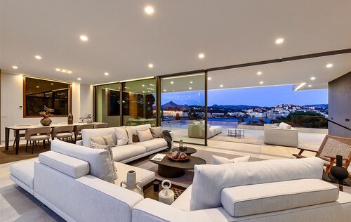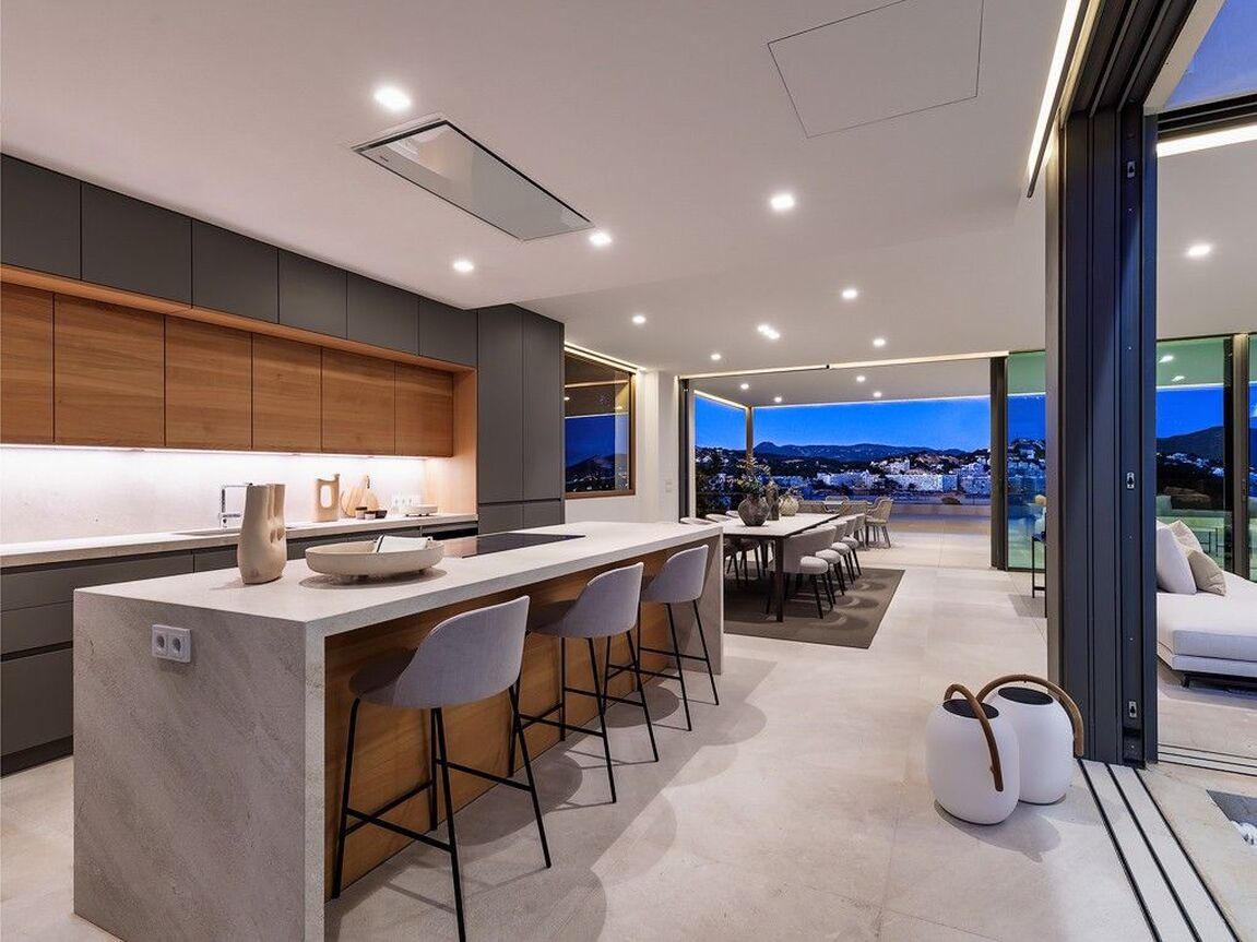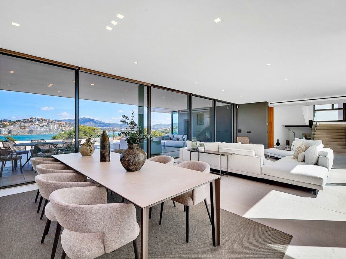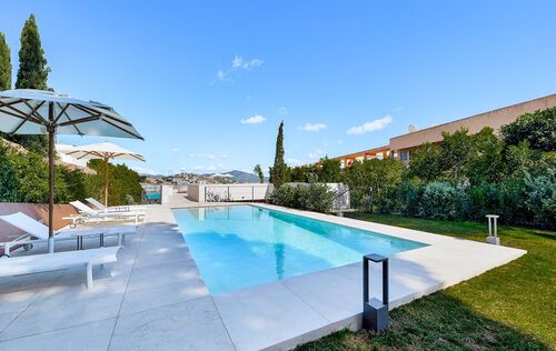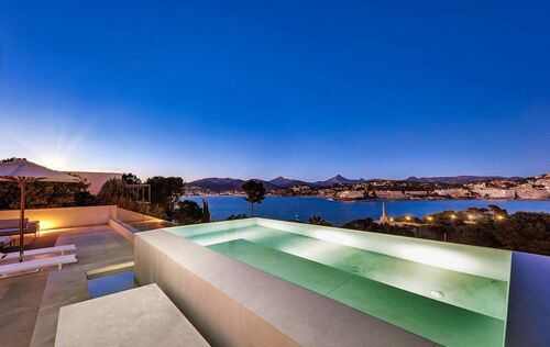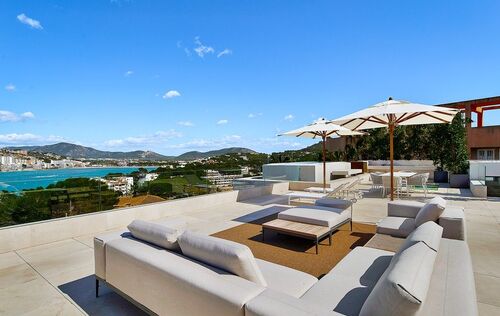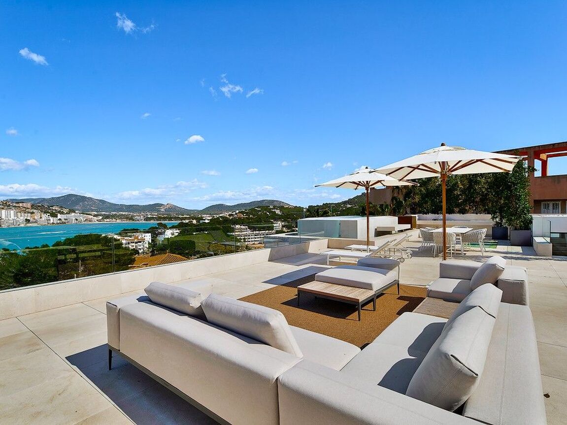 This recently completed new-build villa is located in a popular residential area in Santa Ponsa and offers fantastic sea views thanks to its elevated position. The concept of this high-quality villa has been perfectly adapted to the 1,450m2 plot to optimise privacy, ideal views and sunlight. Mediterranean elements have been skilfully combined with modern living comfort and design to create a bright and open living ambience. In addition to the master suite with dressing room and en suite bathroom, there is a further bedroom with en suite bathroom on the living level. On the lower level there are a further three bedroom suites and an office, which could easily be converted into a further bedroom with bathroom, making a total of six bedrooms available. A lift connects the levels from the large garage to the living level, so that even people with limited mobility can enjoy the property to the full. Another highlight of the villa is certainly the roof terrace with barbecue area, as well as a plunge pool with a charming view of the sea and the coastline of Santa Ponsa. Another pool is available for swimming and frolicking, while a Mediterranean-style garden will make children's hearts beat faster. Those looking for a change of pace will be spoilt for choice between the numerous Santa Ponsa golf courses, the country club with its ATP tennis courts, the charming Santa Ponsa marina and the chic Port Adriano, designed by Philippe Starck, with its numerous restaurants and cafés.