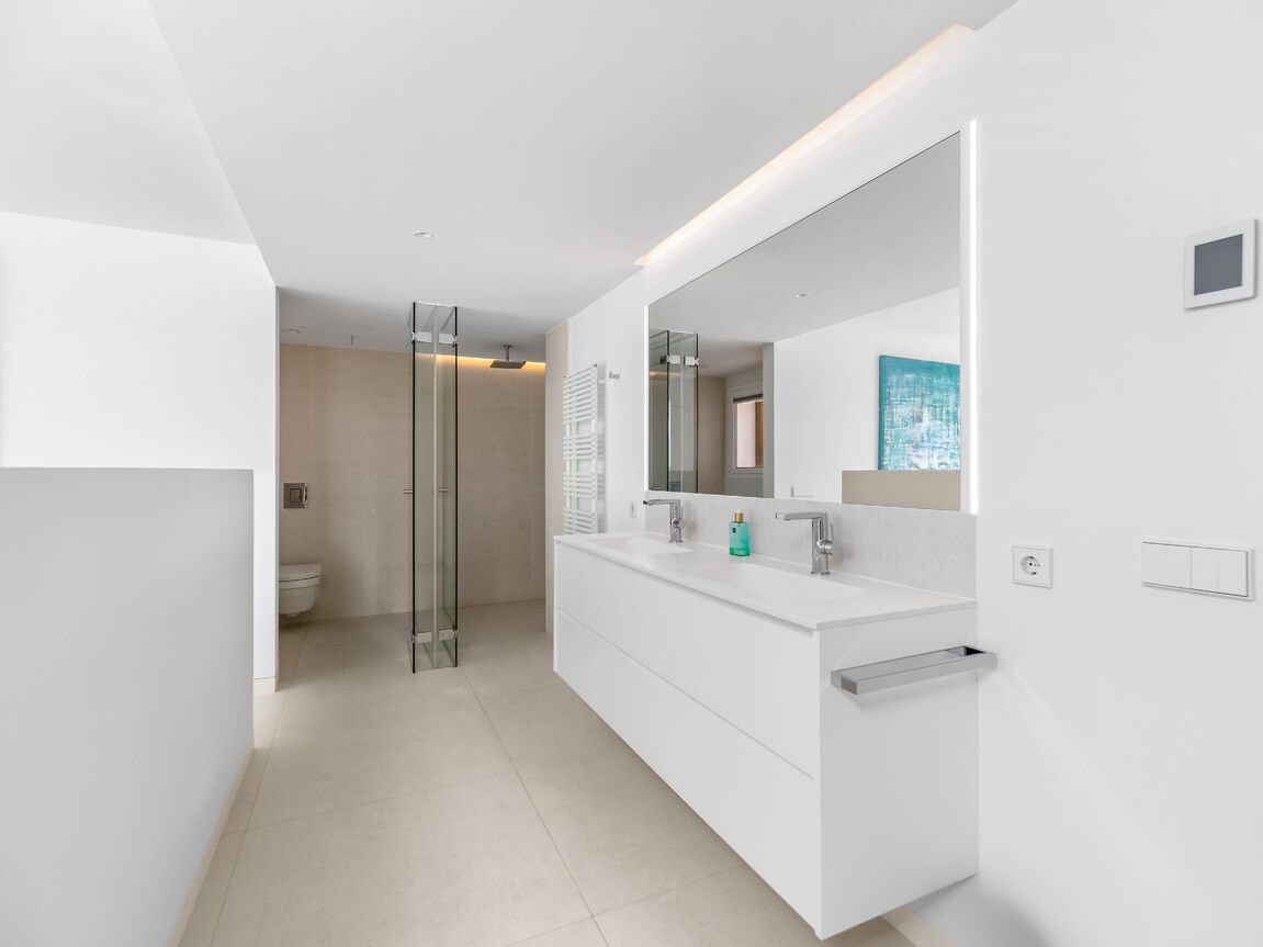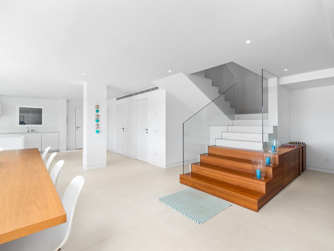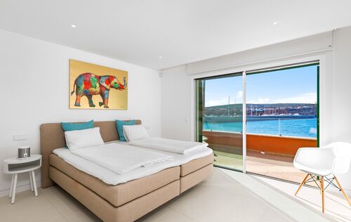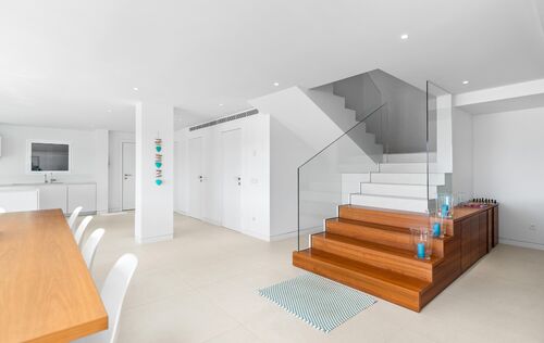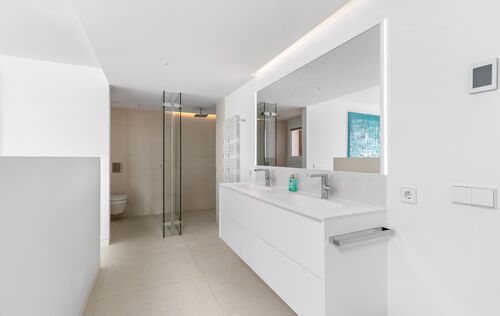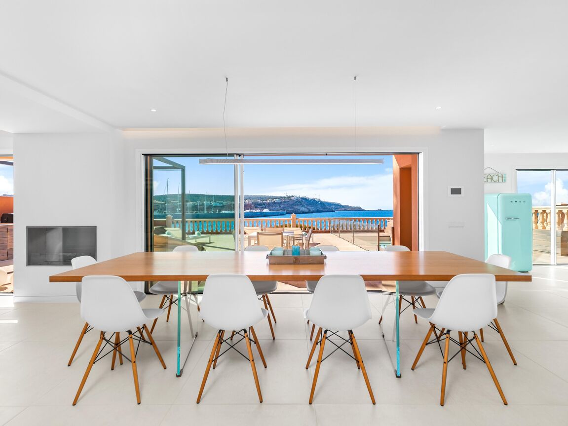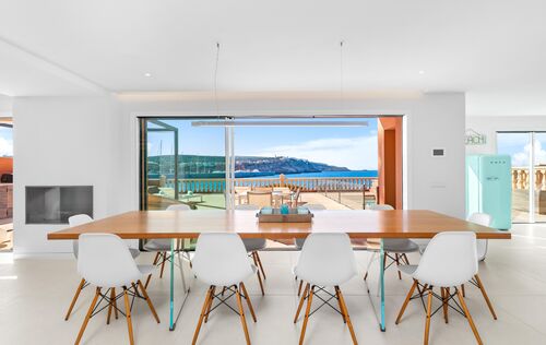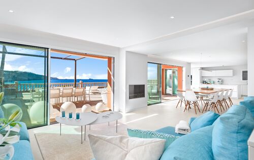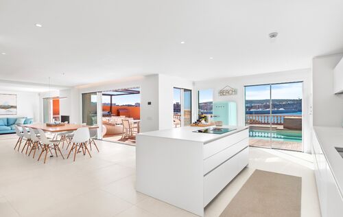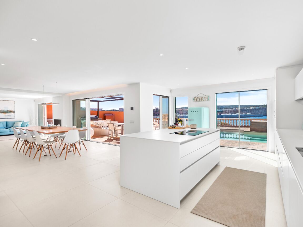This exclusive, recently refurbished duplex flat is situated in an absolute top location in the south-west of Mallorca, directly on the 1st sea line of Nova Santa Ponsa, and offers the highest level of living comfort with its generous size and a living area of over 300 m². The stylish maisonette flat impresses with an open-plan living area that flows seamlessly into the dining area and the high-quality kitchen. Floor-to-ceiling windows let in plenty of natural light and offer breathtaking views of the open sea and the harbour of Port Adriano. The spacious terrace, which is partially covered, is a real highlight and features a private pool and a high-quality outdoor kitchen - perfect for enjoying the Mediterranean climate. With four spacious double bedrooms and a further single bedroom that can be used as an office, this property offers plenty of space for family and guests. Five stylish bathrooms, three of which are en suite, ensure maximum comfort and privacy. The south-facing orientation allows you to enjoy sunlight throughout the day, while the modern underfloor heating and reversible air conditioning (hot/cold) ensure a pleasant living climate all year round. For added convenience, there are two parking spaces in the garage. The location is ideal - restaurants are within walking distance and the exclusive Port Adriano marina is just a few minutes away. Despite the generous living space, the maintenance costs remain extremely low, making this luxury flat the perfect choice for discerning buyers looking for an exclusive, low-maintenance property in a prime location. This exceptional property combines sea views, design and maximum living comfort - a true gem on Mallorca's coast. Arrange a viewing today and let yourself be inspired!