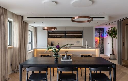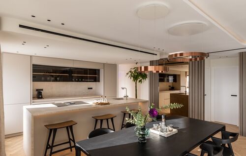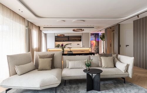 The equipment was uncompromisingly focused on quality: Exclusive designer brands such as Occhio, Flos, Cortizo, Liu-Jo Living, Santa, Siemens, Bora, and Grohe stand for aesthetics, durability, and function at the highest level. Particularly impressive: the floor-to-ceiling windows that direct the view unobstructedly to the panorama while also bringing plenty of daylight into the rooms.