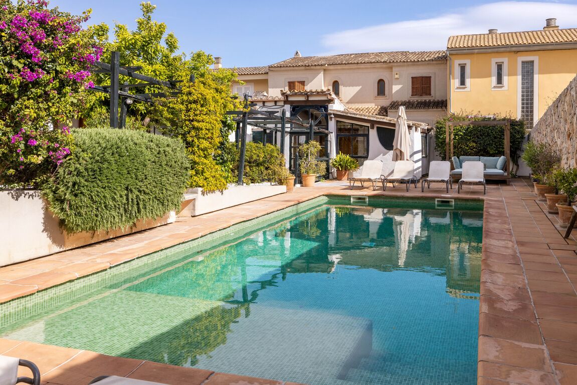 Located in the highly sought-after area of Son Espanyolet, just steps from Santa Catalina and the Port of Palma, this exceptional property combines the charm of authentic 1940s Mediterranean style with enormous investment potential. Set on a large plot of approximately 689 m², the villa offers a total of 333 m² of built area distributed among the main residence, an independent guest apartment, and several bungalow-style bedrooms, all with en-suite bathrooms. The property features 8 spacious double bedrooms and 8 bathrooms, accommodating a total of 16 beds, thus providing a high level of comfort for guests. One of its greatest highlights is its valuable and rare ETV tourist rental license, making it a unique opportunity for both private use and holiday rental operation. The main residence has four bedrooms, three of them en suite, plus an additional bathroom. The bright living room connects directly to the south-facing terrace and garden, creating a perfect setting to enjoy the Mediterranean lifestyle. The outdoor area is simply exceptional: a large garden with swimming pool, several chill-out areas, a cozy interior patio with dining area and a fully equipped outdoor kitchen, as well as a large rooftop terrace ideal for sunbathing and enjoying pleasant evenings. The property also includes a wine cellar, leisure area, and multiple spaces designed for comfort and entertainment. As an added value, there is the possibility of creating a parking area at the rear of the plot. A unique property in one of Palma’s most in-demand locations, standing out for its character, spaciousness, and exclusivity.