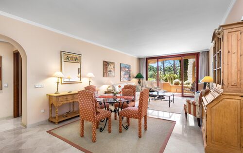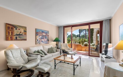 This charming apartment is located in a beautiful Mediterranean residential complex in Santa Ponsa, nestled in a green, quiet area. It has two spacious bedrooms and two bathrooms – ideal both as a holiday home and as a year-round residence. The highlight of the apartment is the spacious terrace with views of the greenery – the perfect place for relaxing evenings or convivial dinners with friends and family. Thanks to the thoughtful design, you will enjoy maximum privacy here. The residential complex offers a wonderful communal pool area surrounded by well-maintained gardens that invite you to relax. In addition, an underground parking space and an additional outdoor parking space are available – comfort and security are therefore guaranteed. Here you can experience pure Mediterranean living – in a quiet location, yet close to all the amenities of Santa Ponsa, such as beaches, golf courses, restaurants and shopping facilities.
