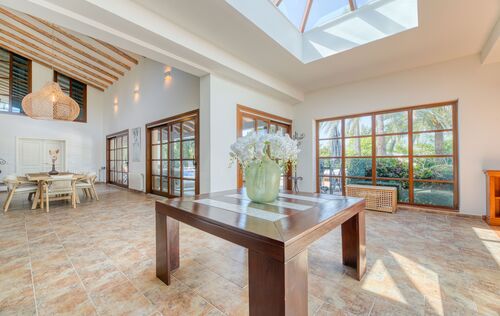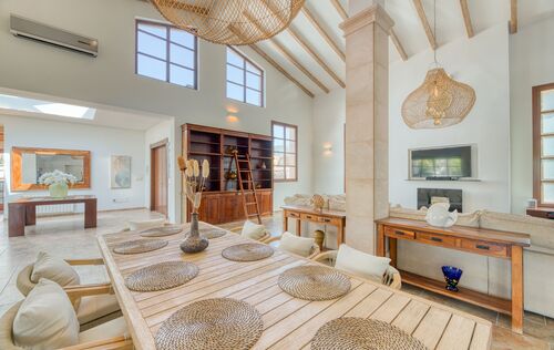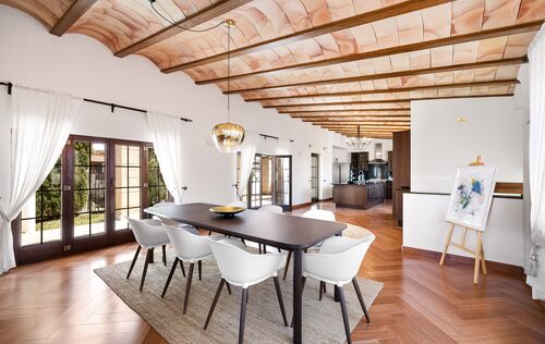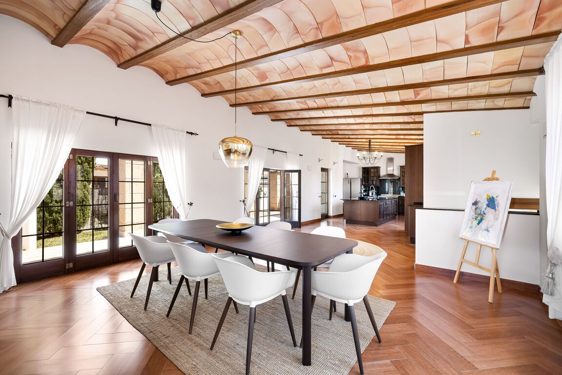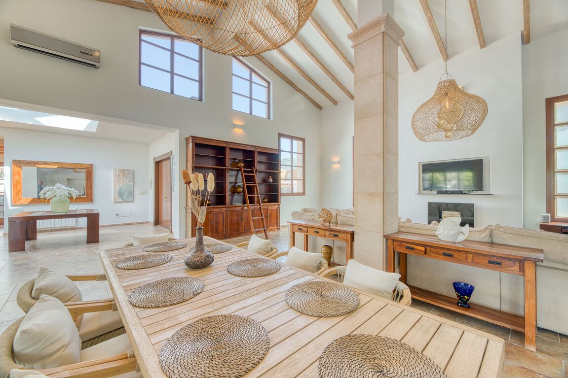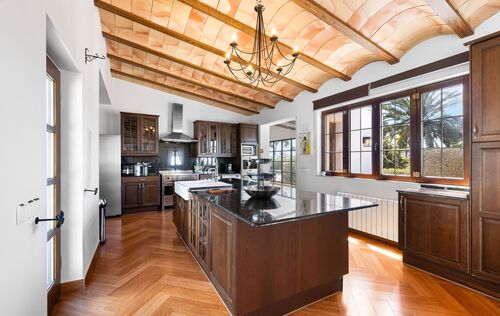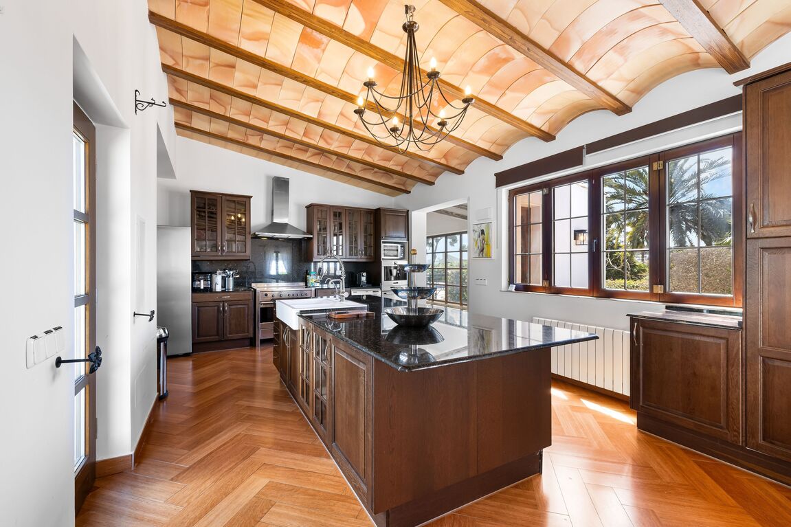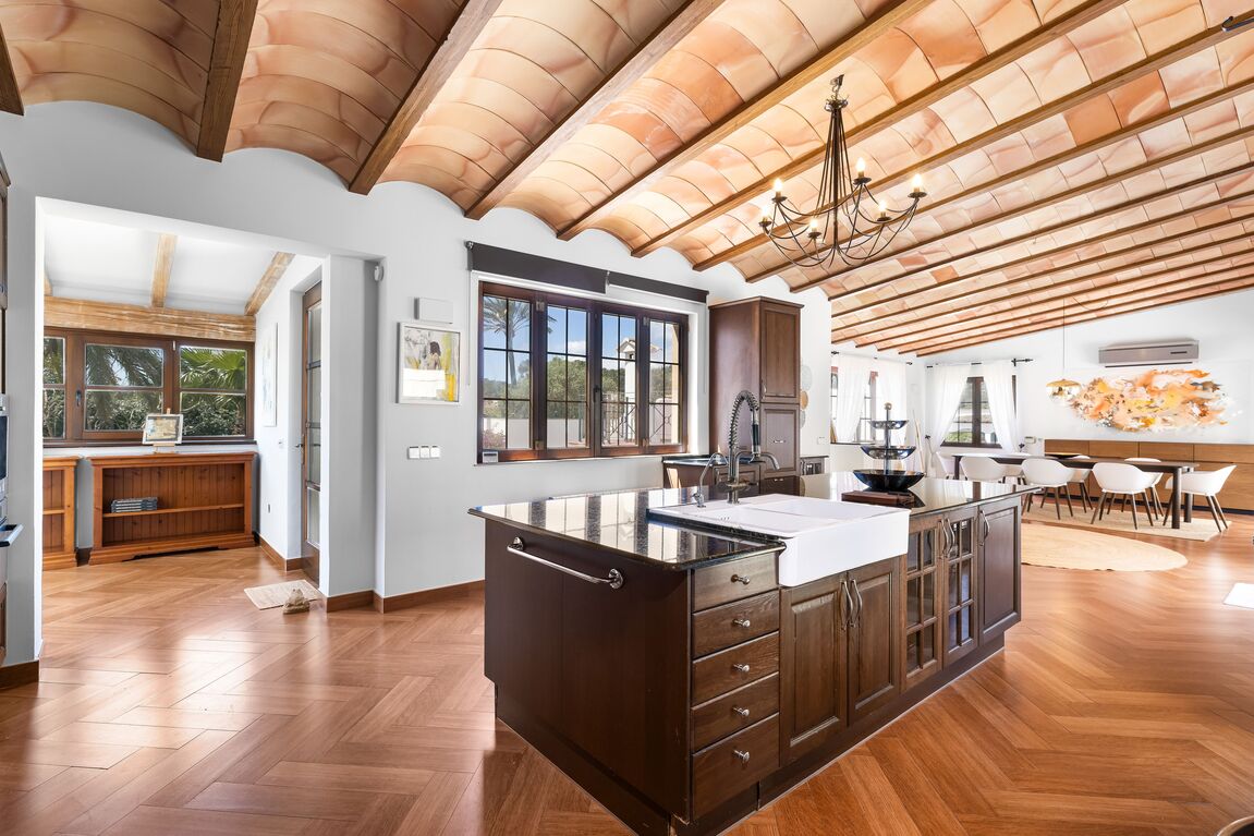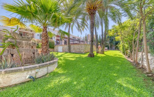 This unique villa in Palmanova seamlessly blends classic Mallorcan architecture with the serenity of a private retreat, all while being just a short stroll from pristine beaches and local amenities. The property is defined by its expansive, level Mediterranean gardens—a rare find in this area—featuring majestic mature palm trees, a large swimming pool, and an integrated Jacuzzi. Numerous sun-drenched and shaded terraces provide the perfect setting for alfresco dining and year-round outdoor living. For added convenience, the property includes ample secure parking for four cars. Inside, the ground floor reveals an elegant, light-filled living and dining area characterized by high ceilings and a fireplace. The spacious, fully-fitted kitchen and adjacent laundry room offer direct access to the terraces for effortless entertaining. The main residence comprises two generous en-suite bedrooms on the ground floor, while the first floor is dedicated to an impressive master suite featuring dual walk-in wardrobes. The lower level provides a private guest suite alongside a dedicated gym and wellness bathroom. Enhancing the villa’s versatility is a self-contained guest apartment with its own living area, kitchen, and en-suite bedroom—ideal for staff, a professional home office, or a creative studio. An added bonus is that there is another 80m2 that can be built on the property if more accommodation is needed. With its proximity to international schools and superb infrastructure, this villa is a premier choice for both an idyllic vacation retreat and permanent family residency.