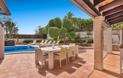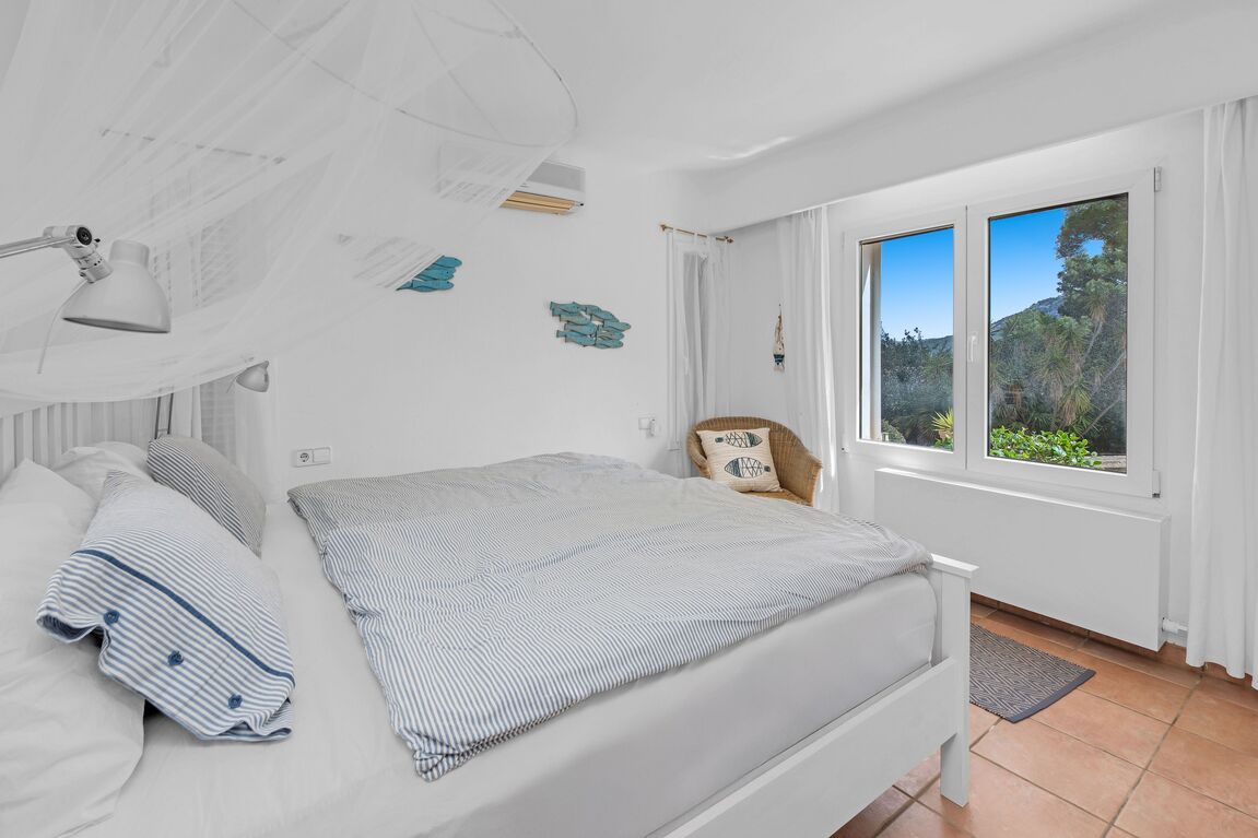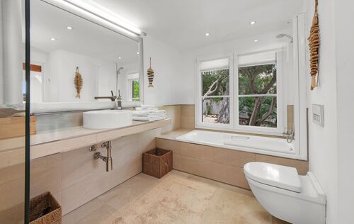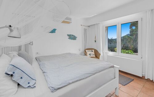 This charming Mediterranean villa combines privacy, spaciousness, and authentic style at the highest level. Nestled in a quiet and secluded location, it offers stunning panoramic views of the surrounding mountains along with partial views of the harbour. The property features a separate guest apartment and various open and covered terraces, creating inviting spaces to relax and enjoy the sun throughout the day. The beautifully landscaped garden with a swimming pool and integrated counter-current system forms a private oasis for leisure and well-being. Presented in very well kept condition, the villa captivates with its authentic Mediterranean architecture and timeless charm. Its thoughtful layout makes it ideal for large families or hosting guests, offering multiple private retreat areas. High-quality features ensure comfortable year-round living, enhancing the exclusive character of this exceptional property. The famous harbour promenade, with its wide range of restaurants, bars, shops and more, is just a few minutes’ drive away. Further features are: central heating, air conditioning (heating and cooling), a fireplace, a storage room, a utility room, a guest toilet, an outdoor kitchen, a swimming pool with a counter-current system, a sauna, a garage for one car plus two additional open parking spaces.