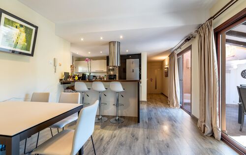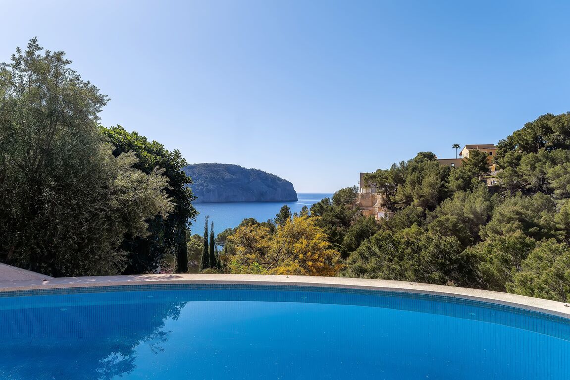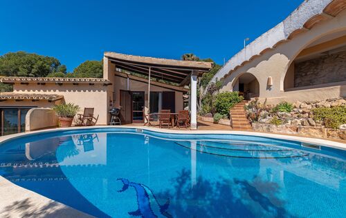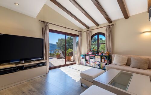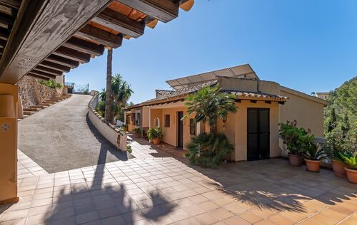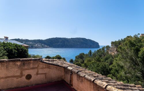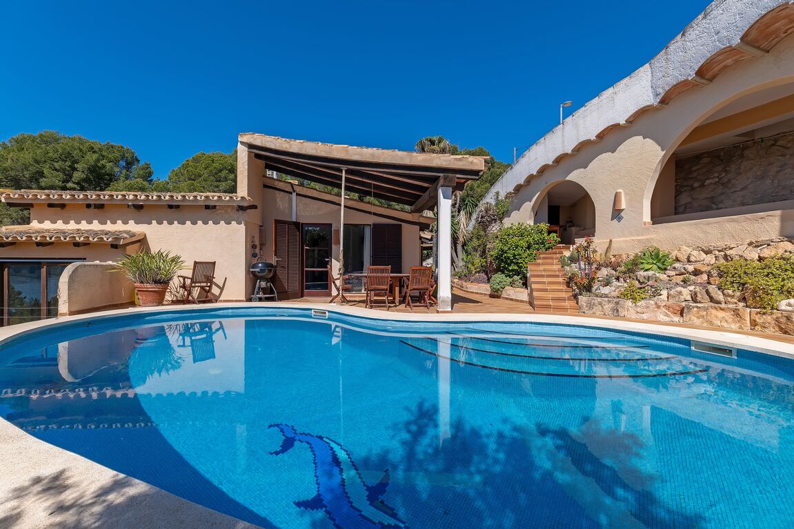 This charming property is located in one of the most exclusive residential areas of Camp de Mar, nestled in a quiet community with first-class neighbourhood buildings and an upscale ambience. The property not only impresses with its privileged location, but also offers excellent potential as a plot for a new project – a demolition and the realization of a modern new villa are easily possible here. The existing house was built in 1988 and recently modernized. It combines a rustic Mediterranean exterior with a stylish, contemporary interior. On the entrance level, there is a spacious living room with an adjoining dining area and a fully equipped, open-plan kitchen in American style – all with direct access to several sunny terraces with BBQ and chill-out zones. Also on this level: a guest toilet and two bedrooms with en-suite bathrooms. The dreamlike pool area, surrounded by terraces and with stunning sea views, invites you to relax. The lower level offers a separate guest apartment with a large living area, bar, fitted kitchen, guest toilet and a spacious bedroom or office with an en-suite bathroom. In addition, there is a separate studio apartment with its own bathroom – perfect for guests or staff. The property is surrounded by lovingly tended, Mediterranean gardens and offers numerous retreats in absolute tranquility. The facilities include: double-glazed windows, satellite TV, internet/telephone, air conditioning (hot/cold), solar panels with 8 kW output and a spacious parking lot for several vehicles. Just a few minutes' walk away is a small bay with crystal-clear water, as are the beach and the popular golf course of Camp de Mar. An extremely comfortable family home with a wide range of uses – whether as a ready-to-move-in vacation residence or as an ideal property for a sophisticated new construction project in a top location.