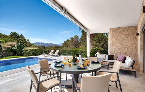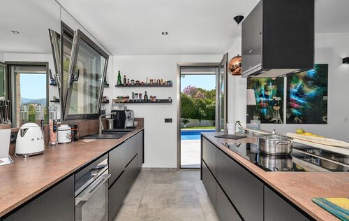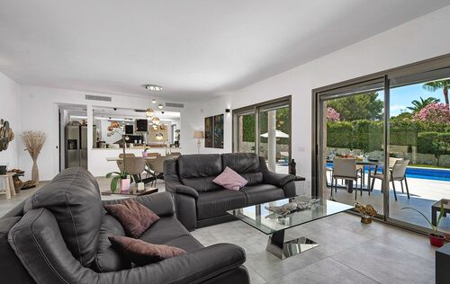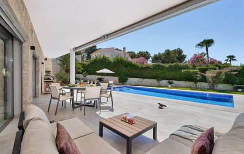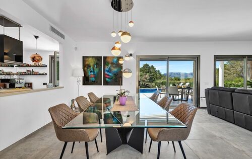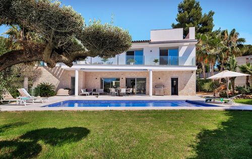 This spacious family villa in Nova Santa Ponsa is in a very good condition and offers plenty of space for the family. On the ground floor there is a large living- and dining area with kitchen and storage room. From the lower floor you have access to the garden and pool area, continue on this level, a guest toilet, 2 bedrooms and a bathroom. On the upper floor you can find 3 more big bedrooms each with en suite bathroom and an office. This modern property, which also has a beautiful saltwater pool in the nice outdoor area, offers plenty of space to relax and enjoy. From the terrace on the first floor, you can enjoy a wonderful view to the bay of Santa Ponsa. Other features include: air conditioning hot / cold, underfloor heating, air source heat pump, garage and carport, among others.