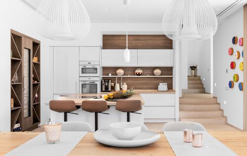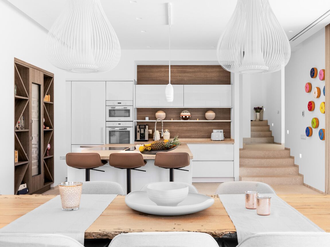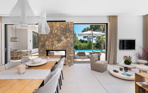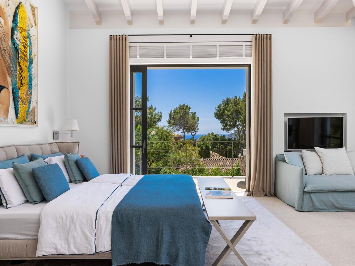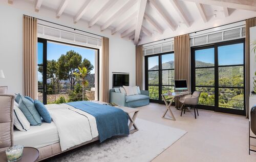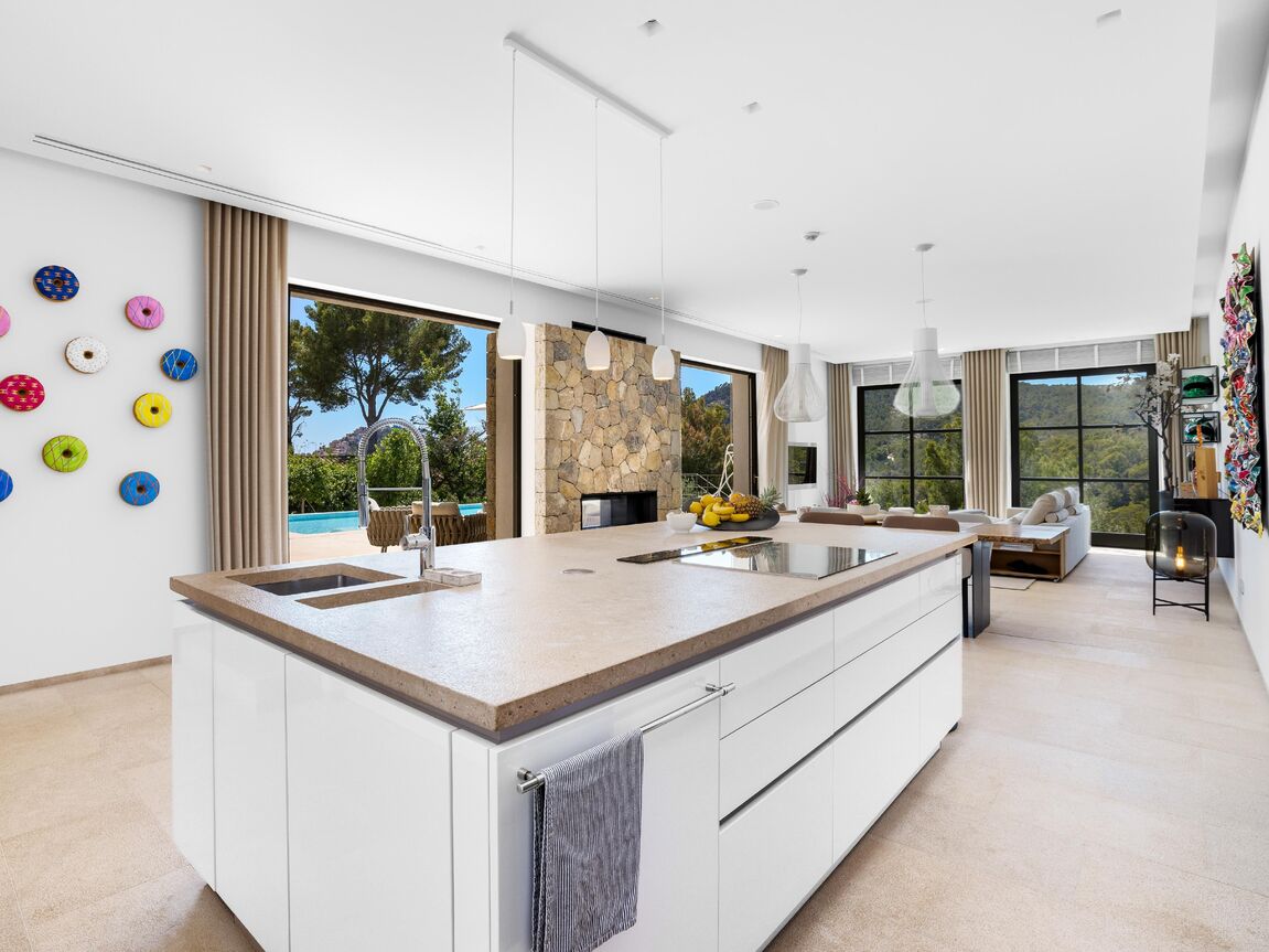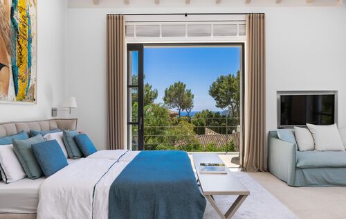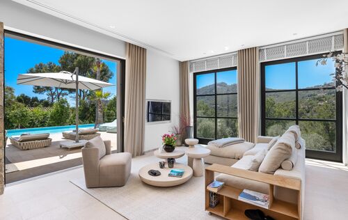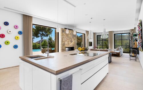 This stylish villa is situated in a peaceful and discreet location in Port Andratx, the renowned fishing and yachting harbor in Mallorca’s exclusive southwest. The south-facing plot not only offers partial sea views and a magnificent panoramic view of the surrounding green mountain landscape but also ensures a high level of privacy. The property impresses with a spacious living and dining area featuring an open-plan designer kitchen equipped with premium appliances (Gaggenau, Siemens, and Miele), four bedrooms, three elegant bathrooms, and a guest WC. The interior is further enhanced by a separate utility room, a decorative bodega wall, a private sauna, a modern fitness room, and an inviting courtyard that encourages relaxation. Generous terrace areas, a heated pool, and a lovingly landscaped Mediterranean garden create a perfect outdoor oasis. The high-quality features include underfloor heating (via heat pump), air conditioning (hot/cold), a Sonos sound system, a gas fireplace, premium stone flooring, outdoor heaters, an alarm system, smart home control, and two outdoor parking spaces. Thanks to the large plot size, there is also potential for further development, making this property especially attractive from a long-term investment perspective.