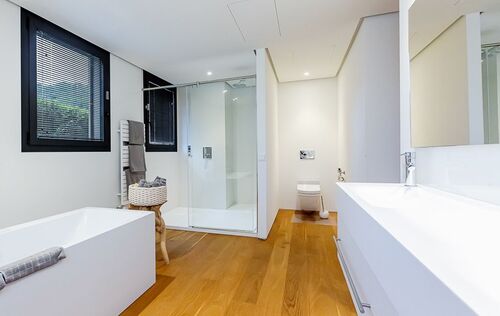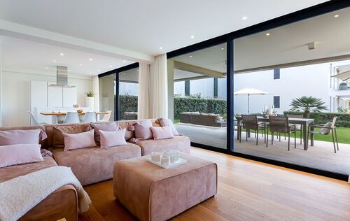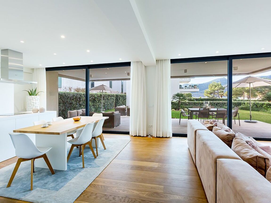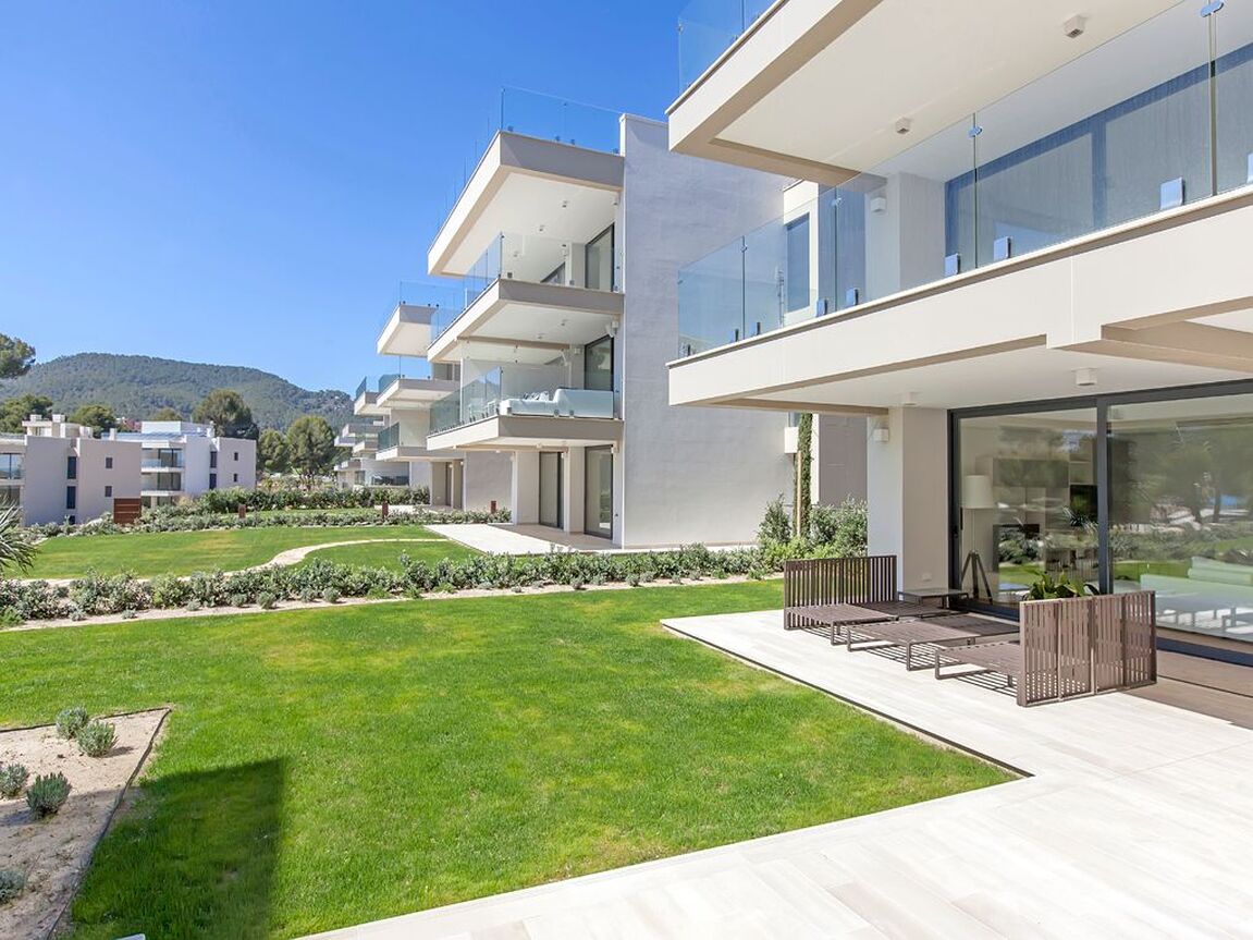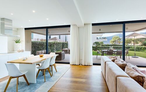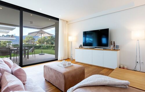 This modern apartment is located in a new first line complex between the sandy beach and the golf course of Camp de Mar. It has an unobstructed view of the beach and the open sea. The apartment has a fully equipped kitchen, underfloor heating, air conditioning h/c, bus system, two underground parking spaces as well as two storage rooms. The golf course and several restaurants, bars and shops are within walking distance. The well-kept garden with large lawn area and community areas, as well as the heated swimming pool and the gym, complete the exclusivity of this complex.