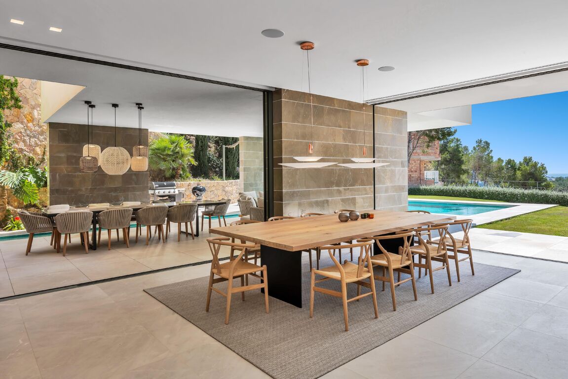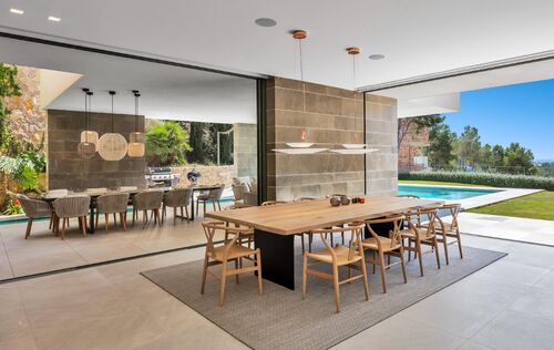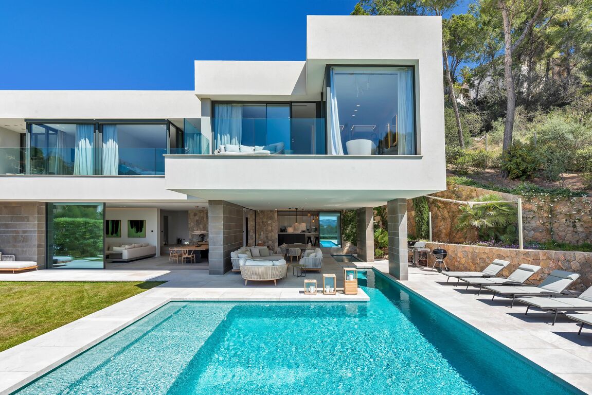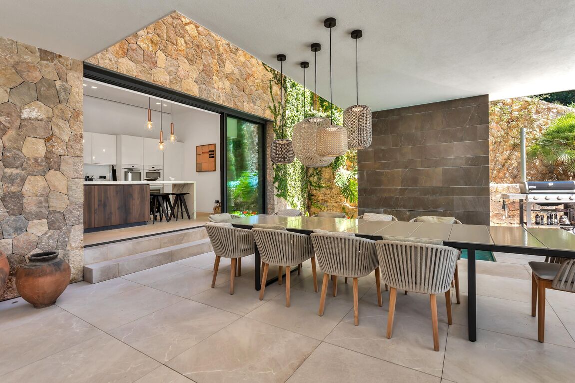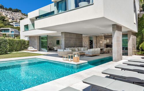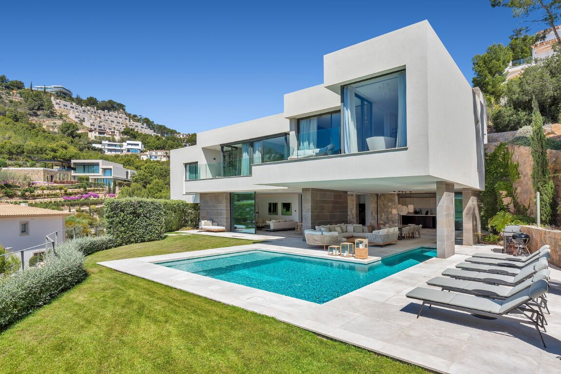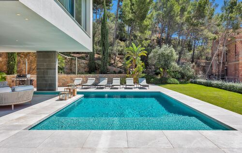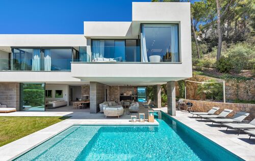 This modern family home is located in Port Andratx, just a few steps from the harbor promenade. An Otis elevator connects the large garage in the basement with the two floors of living space. On the first floor there is a bright and modern living room with an open and equipped kitchen and dining room. The spacious, partly covered terrace with swimming pool can be reached through the big glass sliding doors. On the upper floor there are 5 bedrooms, each with a bathroom en suite. The house has been built with high-quality materials and equipped with modern furniture. The high-quality Birgit Müller kitchen is equipped with Miele appliances. The house has camera surveillance and an alarm system. Further extras are: Gas fireplace, underfloor heating, a wine cellar, air conditioning h/c, pool, and much more.