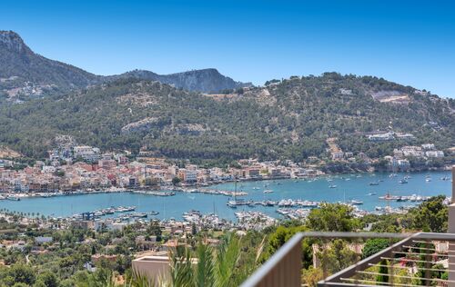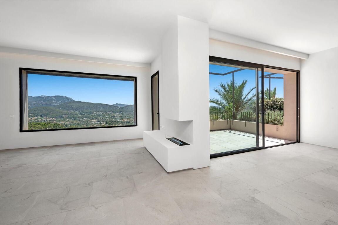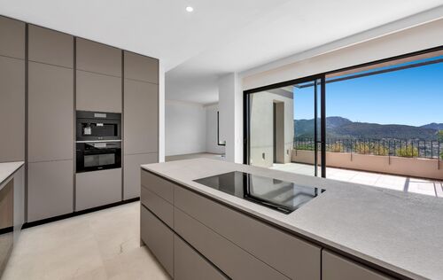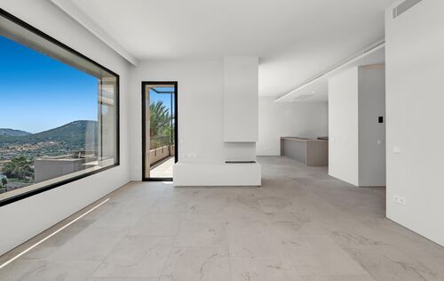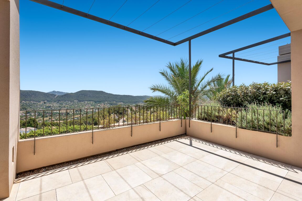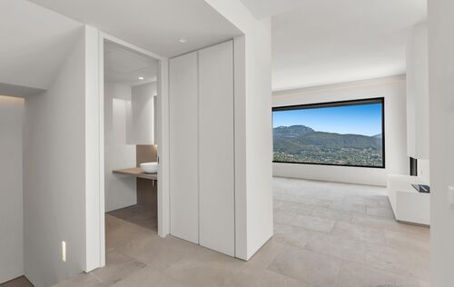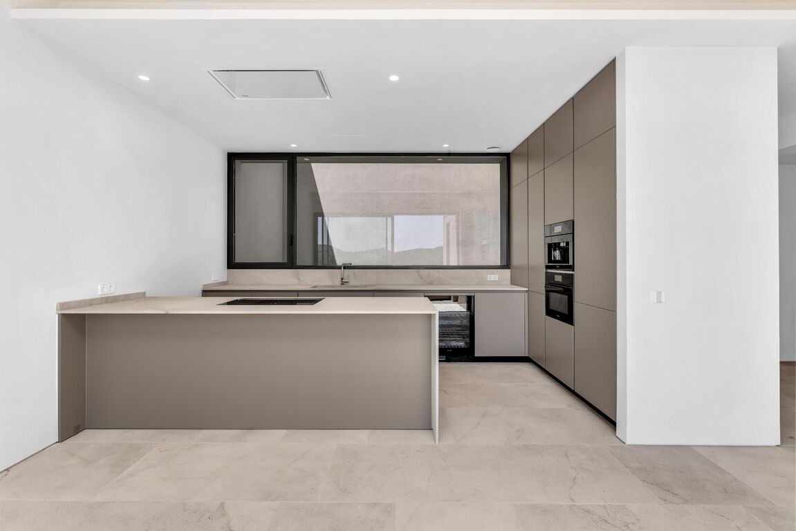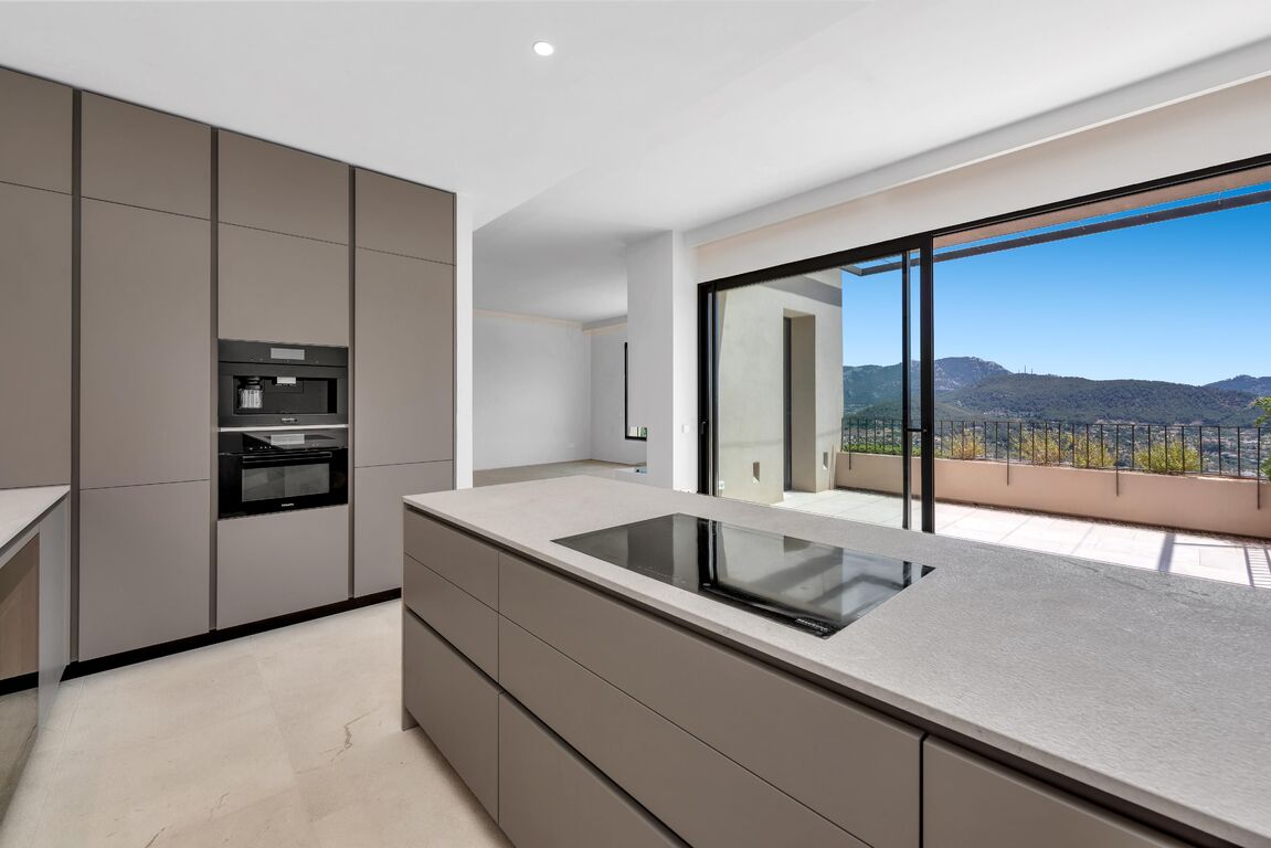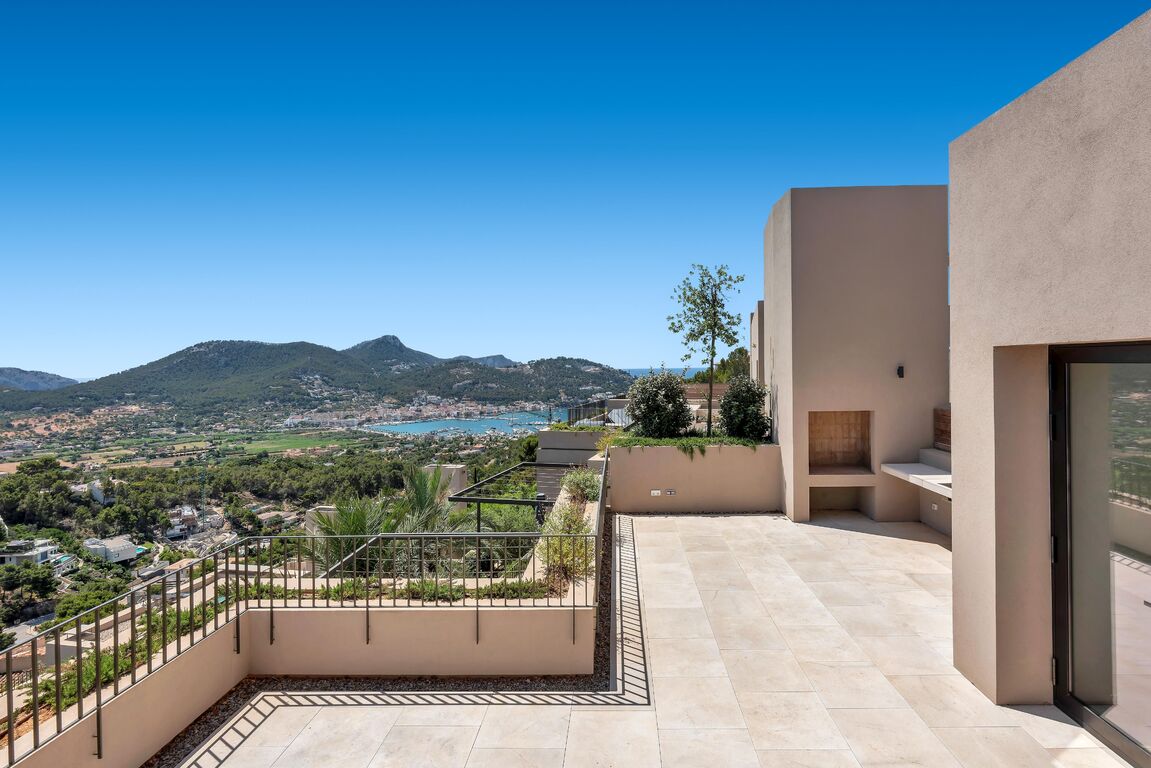 The new build property is situated above Port Andratx in the exclusive residential project of Amber Village, consisting of 24 modernly equipped houses in Mediterranean style. The house enjoys a magnificent open view of the harbour, the mountains all the way to the village of Andratx. On the first floor, the house offers a spacious living and dining area with an open kitchen. In addition to a huge panoramic window and a fireplace, the beautiful living space also provides access to a cozy terrace with panoramic views, as well as a guest toilet. On the ground floor, there is the master bedroom with a stunning ensuite bathroom, with plenty of natural light and views into the private patio, as well as two more double bedrooms and an additional bathroom. The bedrooms also lead to the private garden. Another highlight of this property is the spacious roof terrace with an outdoor kitchen, chill-out area, and a small private pool. Here, you can enjoy the Mallorcan sun to the fullest with an excellent view of the Tramuntana World Heritage Site and the beautiful harbour. An inviting infinity pool and Mediterranean gardens complete the communal areas of the closed residential complex of Amber Village. The house's additional features include: underfloor heating, air conditioning, natural stone and oak wood floors, high-quality modern open kitchen and built-in closets from the Poliform company with Miele household appliances, home automation, utility room, private elevator, and garage spaces for 2 cars.