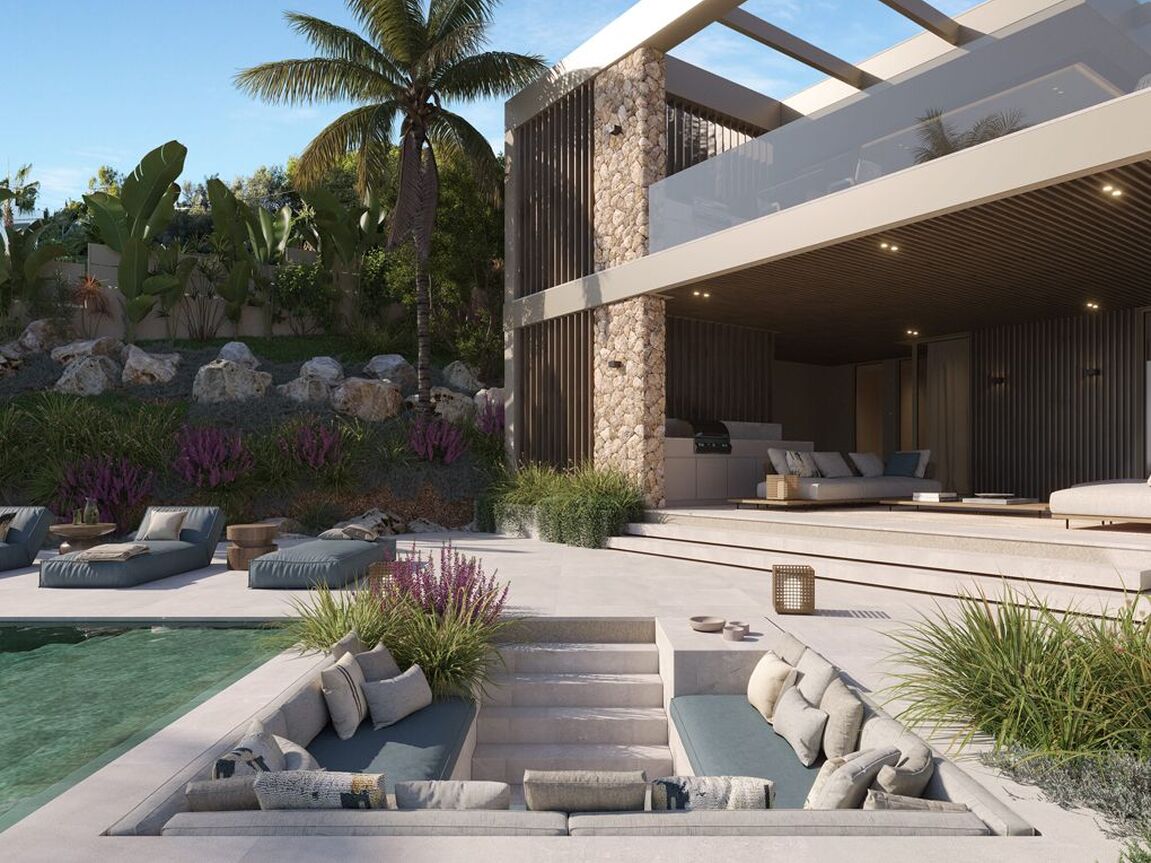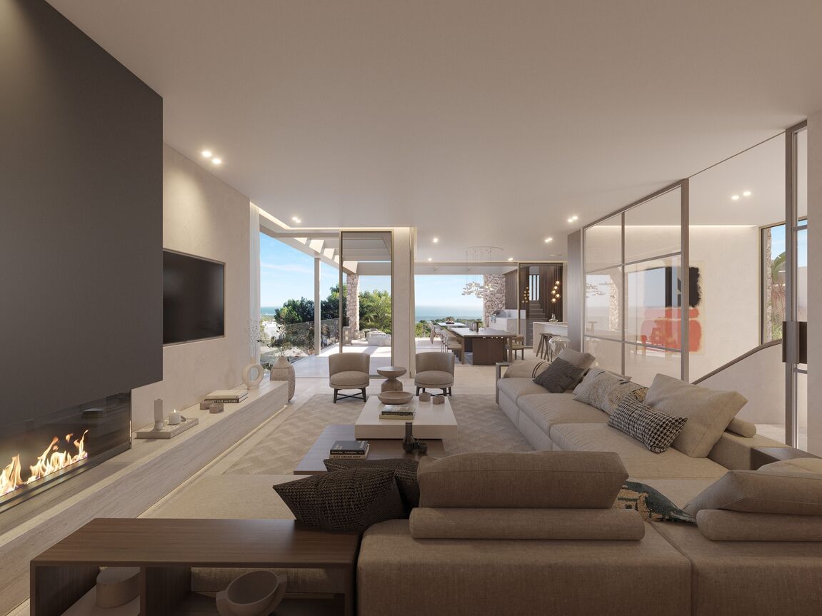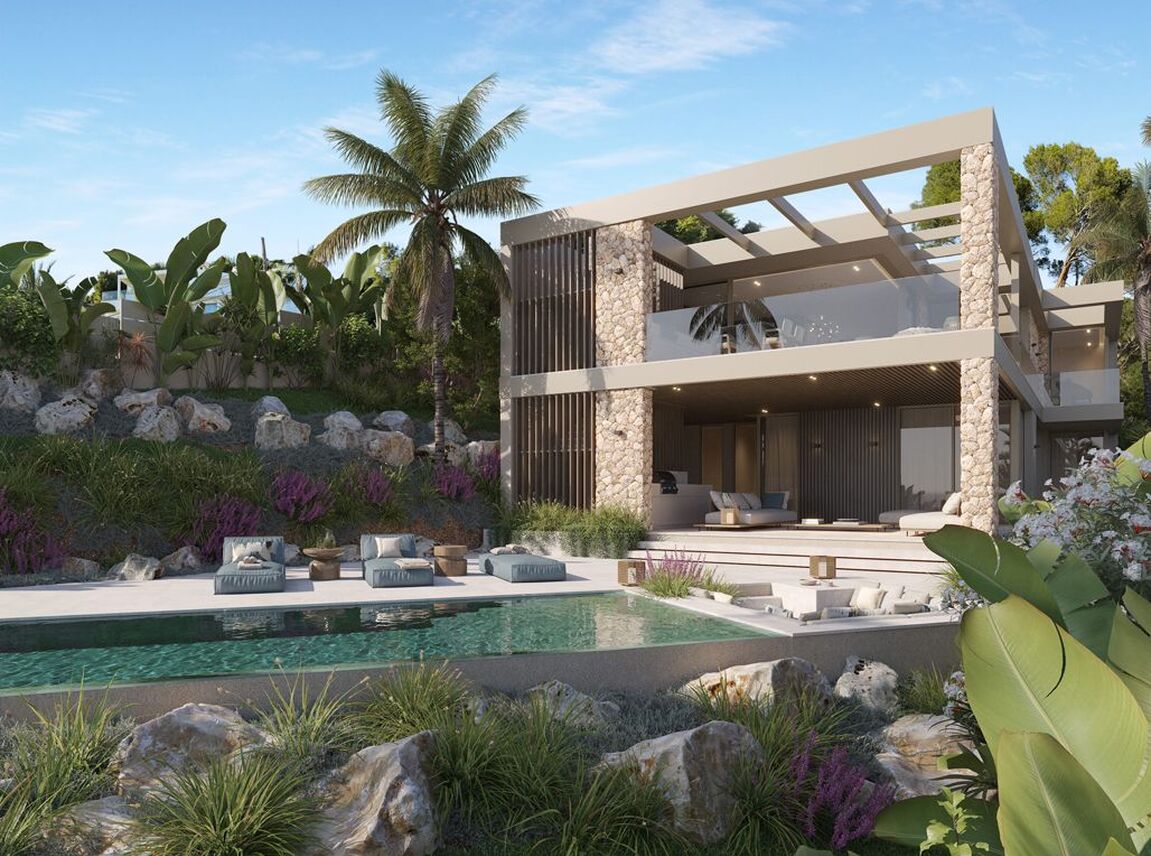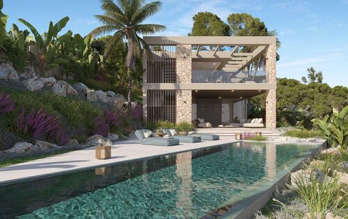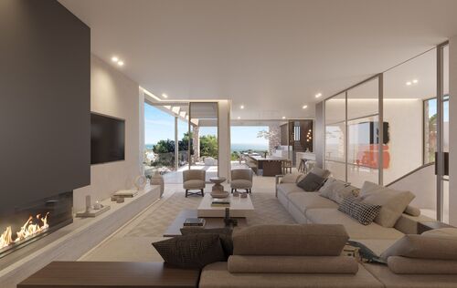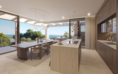 This exceptional villa, perched above the bay, is a masterclass in modern Mediterranean design, effortlessly blending timeless architecture with the latest in comfort, technology and sustainability. With a total constructed area of 590 m² on a generous 976 m² plot, this home offers space, privacy, and sweeping panoramic views of the sea from nearly every room. Upon entering the main level, you're welcomed into a bright, open-plan living area where the kitchen, dining, and lounge spaces flow seamlessly onto a large terrace. This level is designed to maximize light and views, with floor-to-ceiling windows framing the endless horizon. The master suite is a retreat of its own, featuring a walk-in closet, luxurious en-suite bathroom and private access to the terrace. The ground floor is dedicated to family and guests, with three spacious en-suite bedrooms, each opening directly onto the south-facing terrace and offering uninterrupted sea views. Every room is crafted to offer a sense of calm, space and connection to the outdoor space. The villa’s basement is fully equipped for modern living and leisure. It includes a cinema room, gym, bodega, laundry area and a large garage accommodating up to three vehicles. A lift connects all levels, ensuring both convenience and accessibility. Outside, a saltwater swimming pool is surrounded by beautifully landscaped gardens filled with Mediterranean flora including Ficus, Lavender, Rosemary, Palm, and Citrus trees. The two outdoor BBQ areas make entertaining effortless. Interiors are finished to the highest standard with elegant Gris Zarzi flooring and a bespoke kitchen outfitted with state-of-the-art Gaggenau and Bora appliances. The villa features advanced climate control with underfloor heating and comfort cooling. Sustainability plays a key role in this home's design. Solar thermal panels provide hot water, while photovoltaic panels contribute to overall energy efficiency, reducing environmental impact without compromising luxury. Scheduled for completion in the second quarter of 2026, this villa represents the finest in contemporary coastal living, a perfect harmony of architecture, innovation and nature in one of the Mediterranean’s most desirable settings.