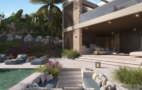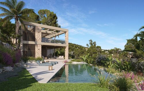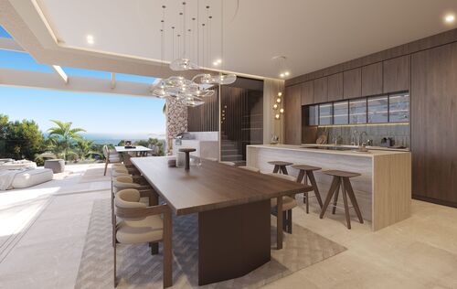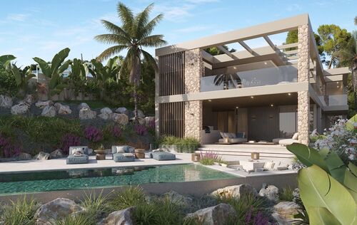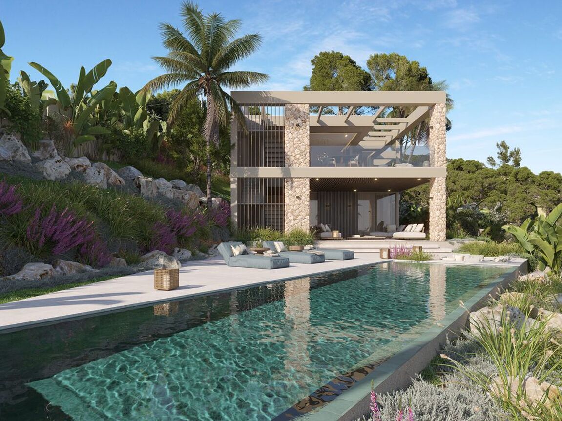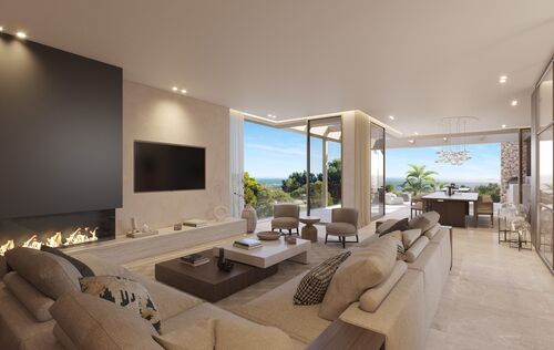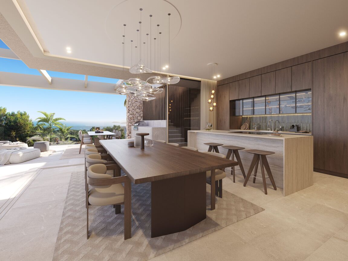 This exceptional villa, perched above the bay, is a masterclass in modern Mediterranean design, effortlessly blending timeless architecture with the latest in comfort, technology and sustainability. With a total constructed area of 590 m² on a generous 976 m² plot, this home offers space, privacy, and sweeping panoramic views of the sea from nearly every room. Upon entering the main level, you're welcomed into a bright, open-plan living area where the kitchen, dining, and lounge spaces flow seamlessly onto a large terrace. This level is designed to maximize light and views, with floor-to-ceiling windows framing the endless horizon. The master suite is a retreat of its own, featuring a walk-in closet, luxurious en-suite bathroom and private access to the terrace. The ground floor is dedicated to family and guests, with three spacious en-suite bedrooms, each opening directly onto the south-facing terrace and offering uninterrupted sea views. Every room is crafted to offer a sense of calm, space and connection to the outdoor space. The villa’s basement is fully equipped for modern living and leisure. It includes a cinema room, gym, bodega, laundry area and a large garage accommodating up to three vehicles. A lift connects all levels, ensuring both convenience and accessibility. Outside, a saltwater swimming pool is surrounded by beautifully landscaped gardens filled with Mediterranean flora including Ficus, Lavender, Rosemary, Palm, and Citrus trees. The two outdoor BBQ areas make entertaining effortless. Interiors are finished to the highest standard with elegant Gris Zarzi flooring and a bespoke kitchen outfitted with state-of-the-art Gaggenau and Bora appliances. The villa features advanced climate control with underfloor heating and comfort cooling. Sustainability plays a key role in this home's design. Solar thermal panels provide hot water, while photovoltaic panels contribute to overall energy efficiency, reducing environmental impact without compromising luxury. Scheduled for completion in the second quarter of 2026, this villa represents the finest in contemporary coastal living, a perfect harmony of architecture, innovation and nature in one of the Mediterranean’s most desirable settings.