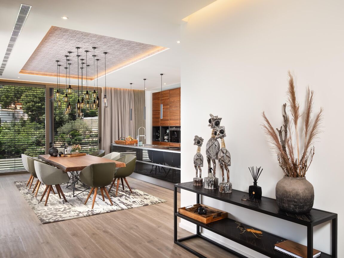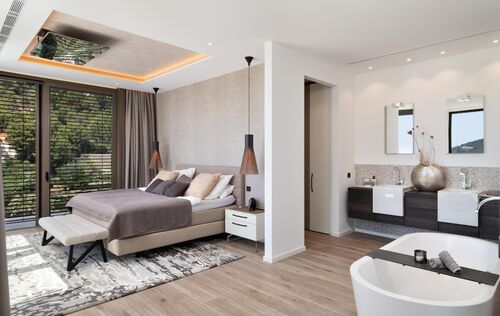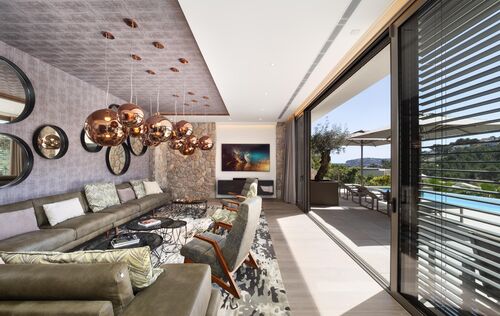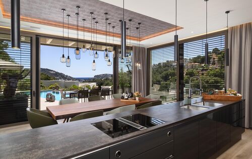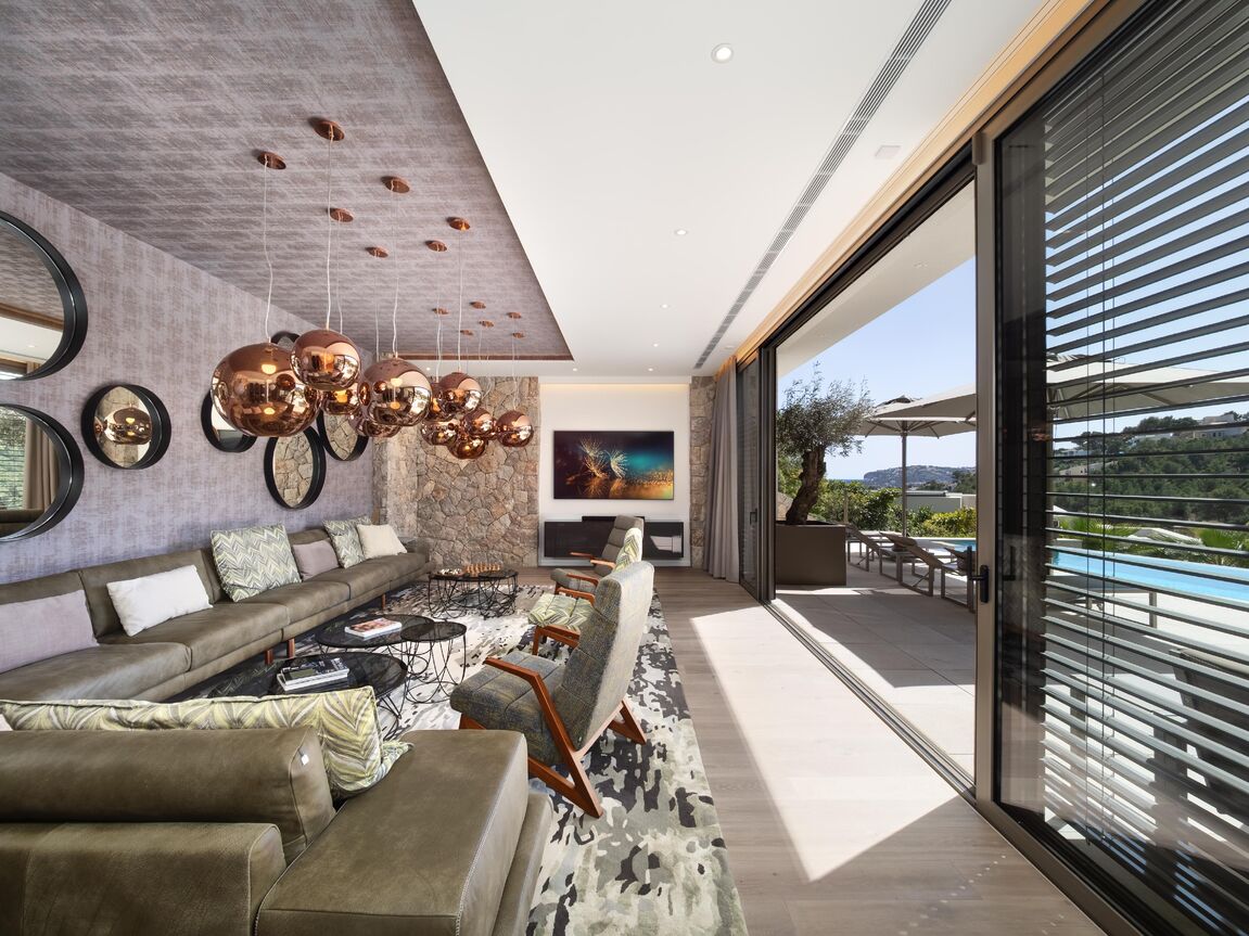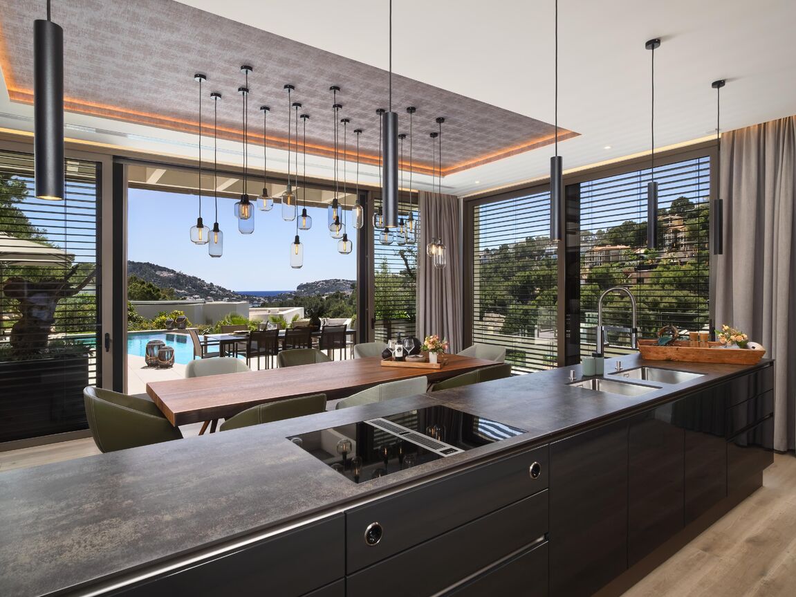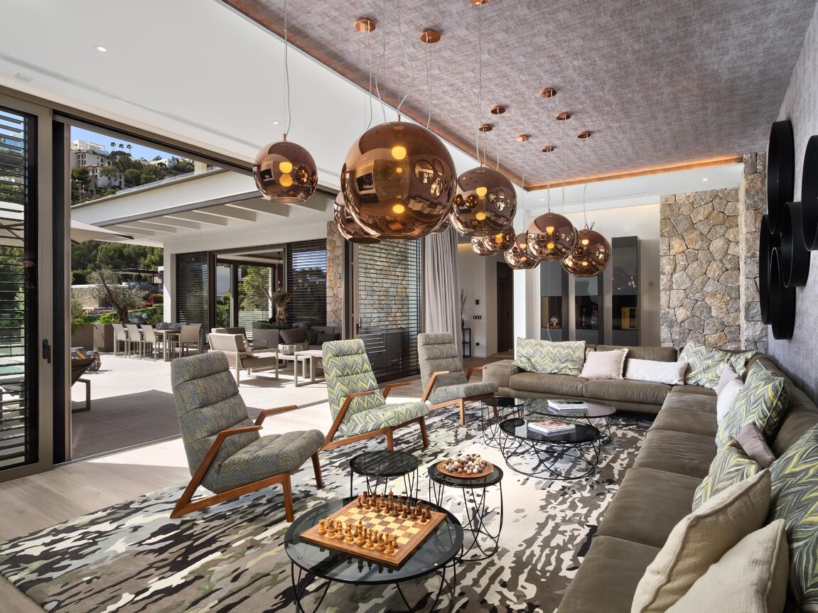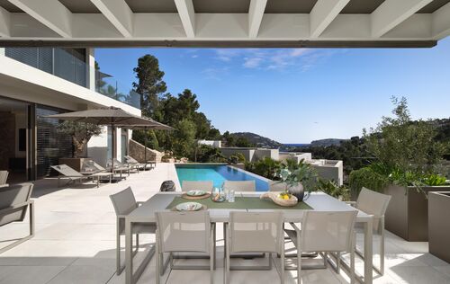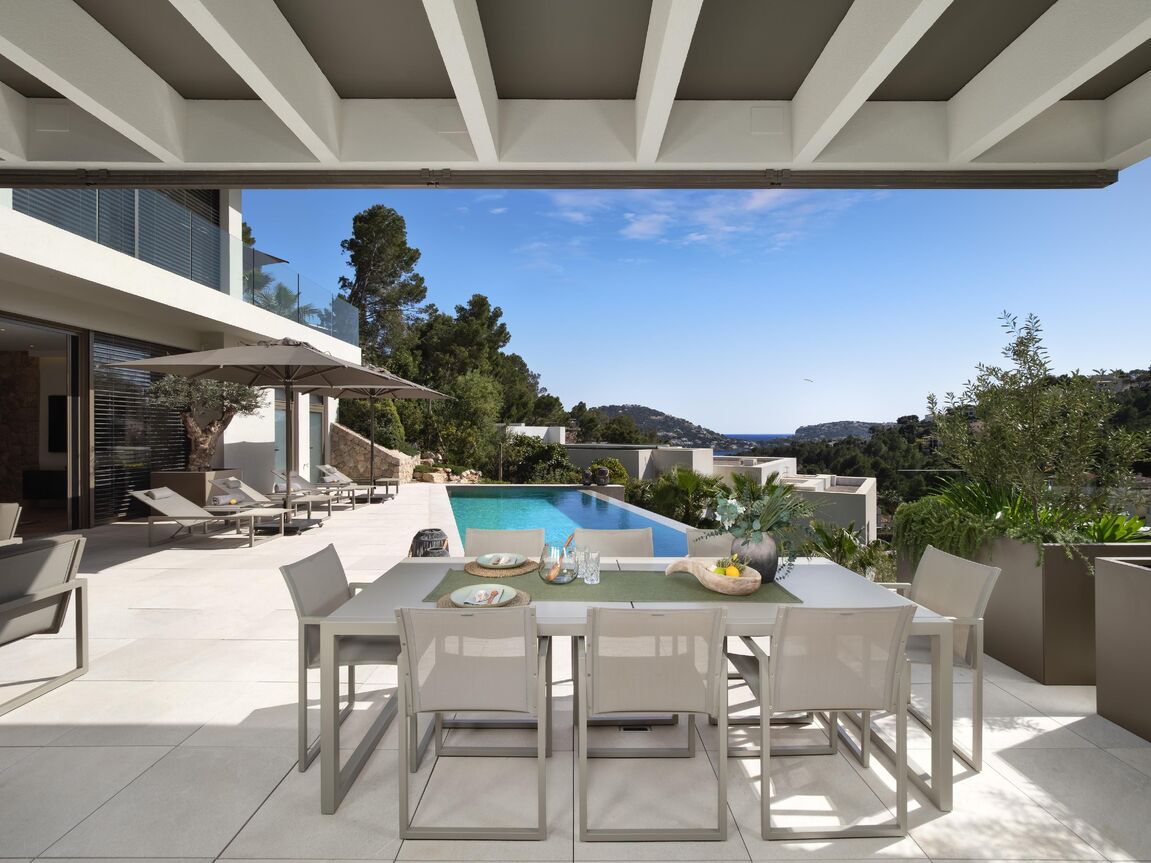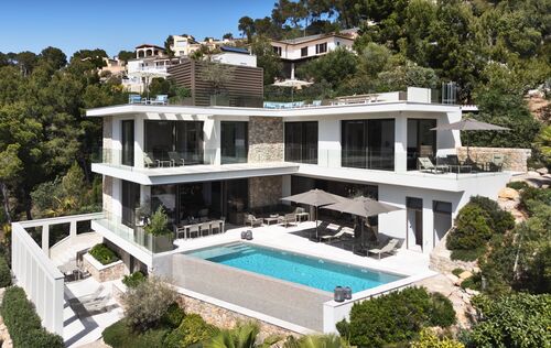 Nestled in the exclusive Can Borras urbanization of Port Andratx, this newly built luxury villa offers a perfect blend of timeless design, cutting-edge technology, and good sea and harbour views. Positioned on a generous 1,089 m² plot and spanning approximately 650 m² of built area, the home enjoys a coveted south-west orientation, bathing the interior in natural light and providing spectacular panoramic vistas. The architectural concept is both elegant and practical, with intelligent spatial planning that ensures fluid transitions between indoor and outdoor living. A private elevator connects all floors, from the spacious garage to the expansive rooftop terrace, where a built-in kitchenette makes it the ideal space for entertaining while overlooking the sea and mountains. The ground floor hosts the main living area, a luminous open-plan space that includes a designer kitchen fitted with premium Next125 cabinetry, Bora cook tops, Siemens appliances, and ceramic worktops. The living and dining areas extend seamlessly onto sun-soaked terraces, surrounding an infinity pool with an adjacent full bathroom. Additional spaces on this level include a guest WC, a utility room, and an outdoor dining area beneath a stylish pergola. On the upper floor, the master suite provides an exceptional retreat with its walk-in wardrobe, luxurious en-suite bathroom featuring a freestanding designer bathtub, and a private terrace. Two further bedroom suites on this level each offer their own bathrooms and ample natural light, maintaining the villa's consistent standard of comfort and style. The lower level is designed as a fully self-contained guest apartment, featuring two additional bedrooms with en-suite bathrooms, a modern kitchen, a living and dining area, a guest WC, and a utility room. This level also includes a well-equipped fitness room and direct access to private terraces and the landscaped Mediterranean garden. Throughout the villa, materials and finishes reflect an unwavering commitment to quality. Natural stone flooring, brushed oak real wood planks with UV-resistant finishes. Advanced technology further enhances the experience, with Schüco windows and sliding doors, integrated electric blinds, smart home controls for lighting, climate, and shading, and a comprehensive security system with surveillance cameras and access control. The bespoke furnishings from renowned brands such as Rolf Benz, Cattelan Italia, Hülsta, and Koinor define the interior and could be bought separately. This villa not only promises privacy and luxury, but also effortless functionality. Located just minutes from the Yacht Club, exclusive restaurants, and boutique shopping on the harbour promenade, it offers an exceptional lifestyle in one of Mallorca’s most prestigious coastal settings.