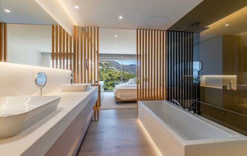 This modern semi-detached house is located in the exclusive New Folies residential complex in the popular fishing harbour and marina of Port Andratx in the southwest of Mallorca. The house is situated on a hill and offers impressive views of the bay and the open sea. It was built with high-quality materials and is equipped with state-of-the-art technology, leaving nothing to be desired. The semi-detached house has a large living and dining area with a fully equipped luxury kitchen, three bedrooms with en-suite bathrooms, a utility room, a cellar and many other amenities. These include underfloor heating, air conditioning with heat pump and solar energy, an underground parking space as well as an outdoor parking space, a private pool with a well-kept garden, a communal pool, a fitness room, a spa, a clubhouse, a concierge service, smart home technology and electric blinds.