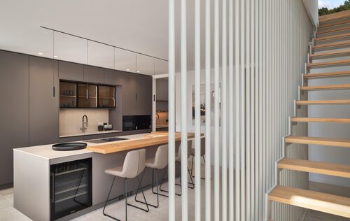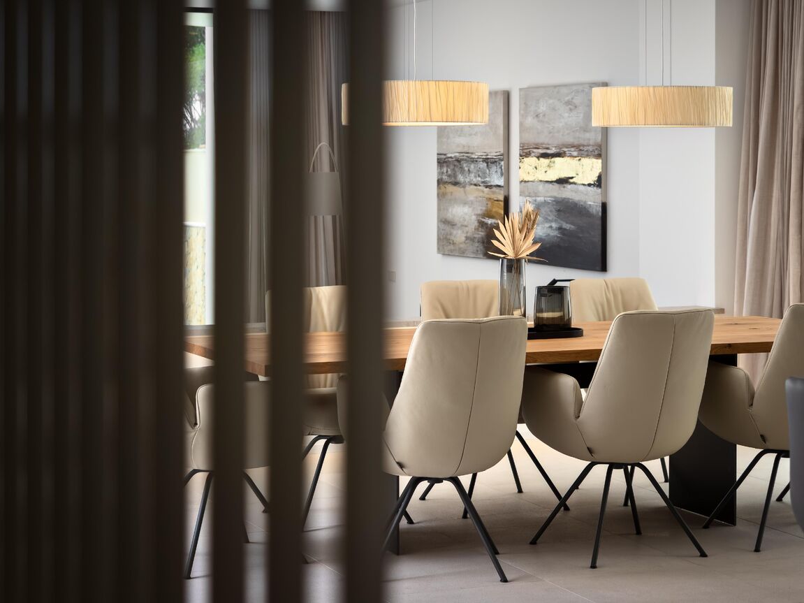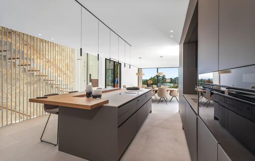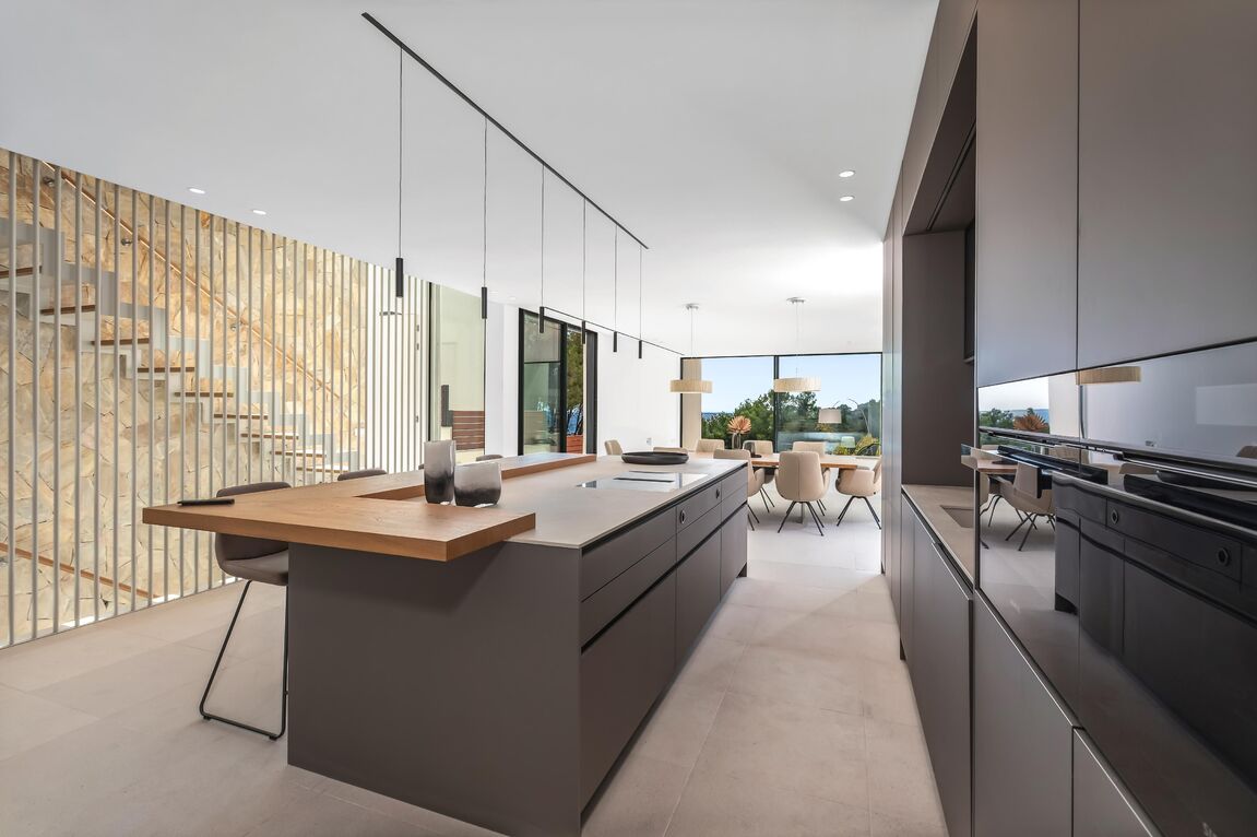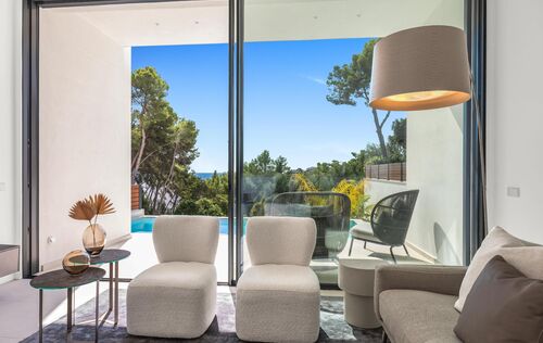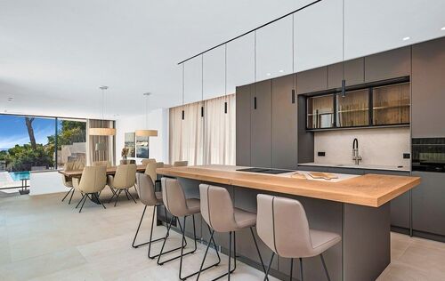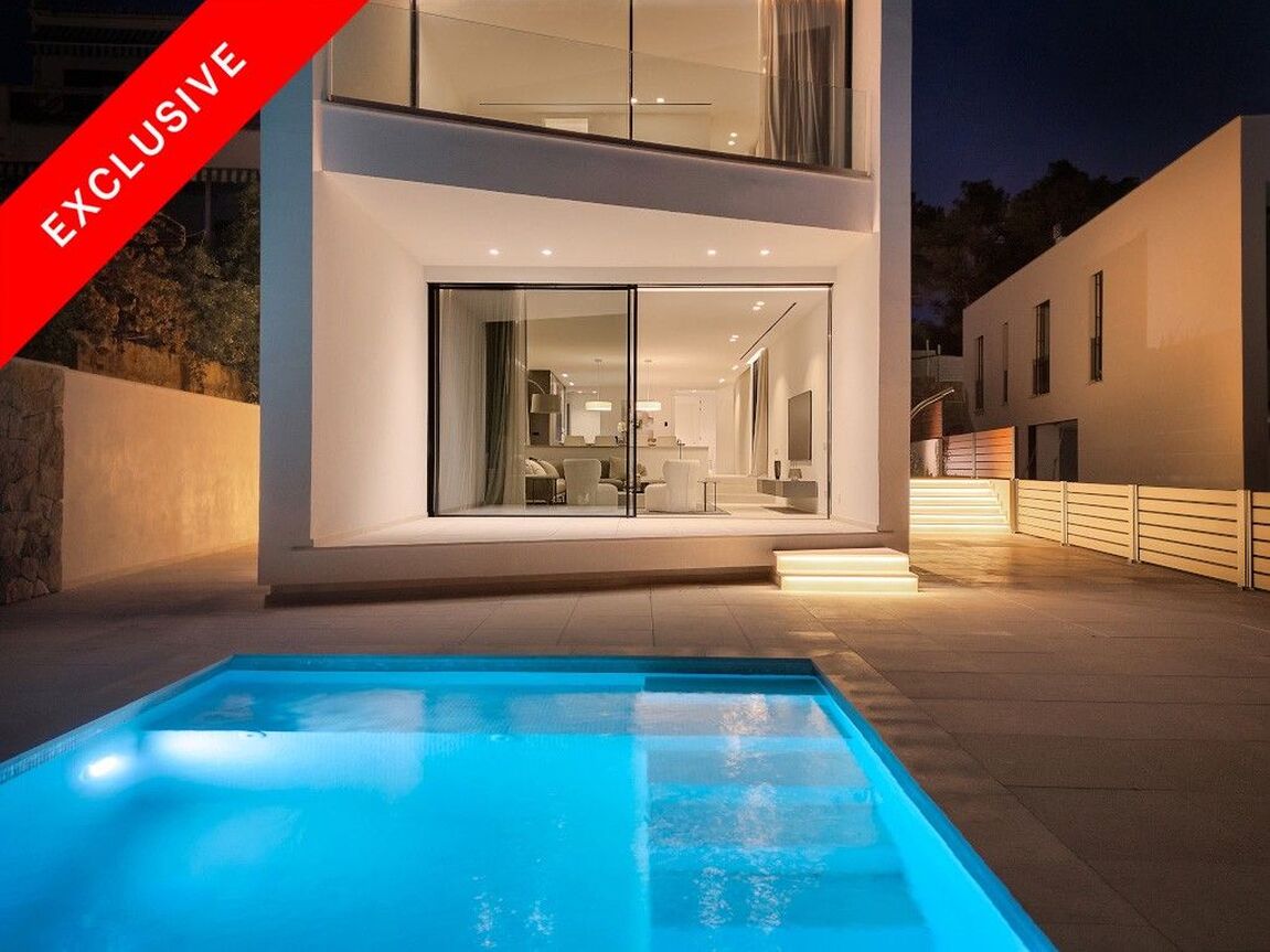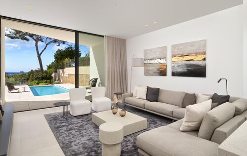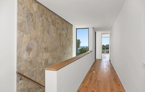 Located in a quiet area of the small coastal town of San Agustín, just a few minutes' drive from Palma's city centre, the new Urban Jungle development will be ready soon. The five villas in the project feature private pools and are southwest-facing. This villa with 4 bedrooms and 4 bathrooms offers not only a beautiful view of the greenery but also a partial sea view. The centrepiece of the modern property is the spacious living and dining area with an integrated kitchen featuring a cooking island and breakfast bar, which provides access to the expansive private pool terrace. Additionally, on the living level, there is a small secondary dirty kitchen, a guest toilet, and one of the 4 double bedrooms with an en suite bathroom. The other three spacious double bedrooms are located on the upper floor and also all have built-in wardrobes and their own en suite bathrooms. The basement includes a fully equipped laundry room, a storage room, and the house's technical facilities. The modern design and high-quality finishes — including LEICHT kitchens with Miele and Siemens appliances, natural stone flooring and oak parquet, floor-to-ceiling doors, air conditioning, underfloor heating with heat pump, KNX home automation, and a private garage — ensure a comfortable and high-end lifestyle. Within walking distance is the small Cala Nova marina, which offers a wide range of water sports, as well as several sandy coves, shops, and restaurants. Additionally, there are several international schools nearby, making this property the perfect home for families wishing to live year-round in Mallorca.