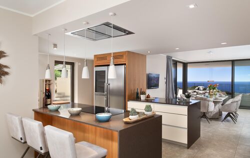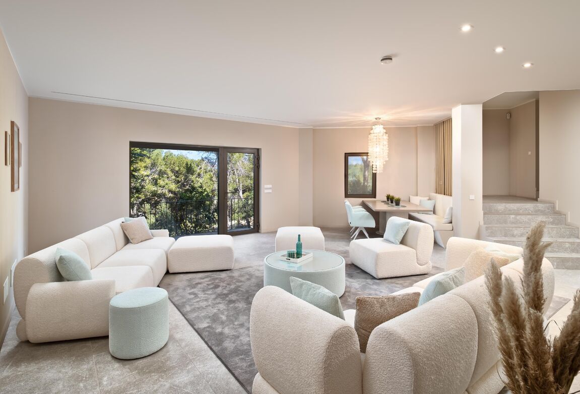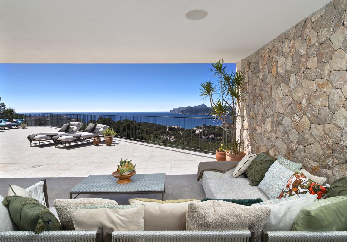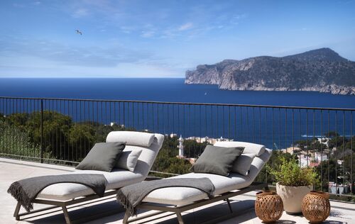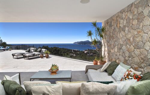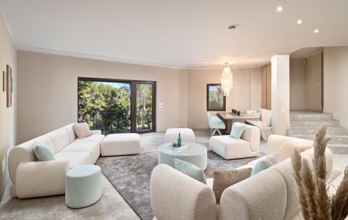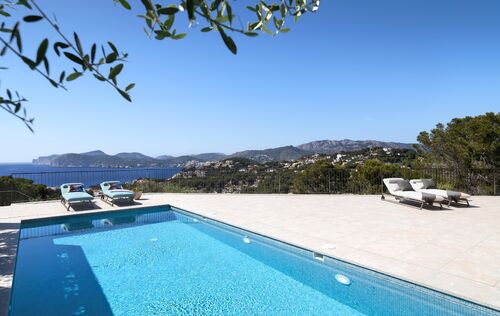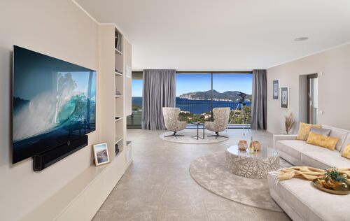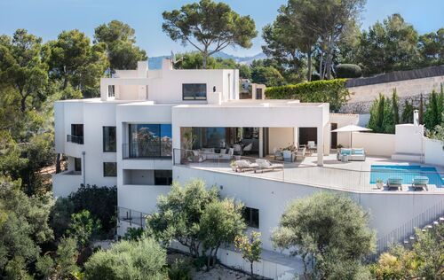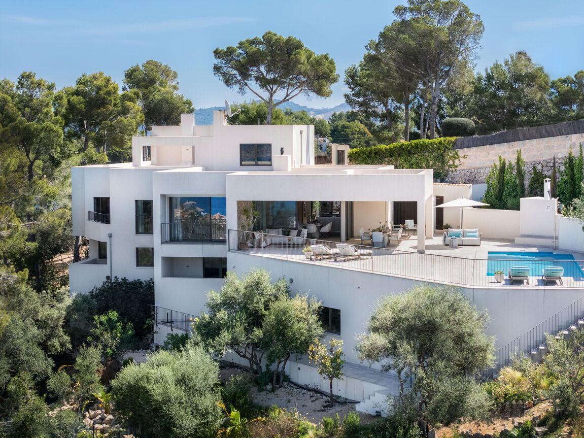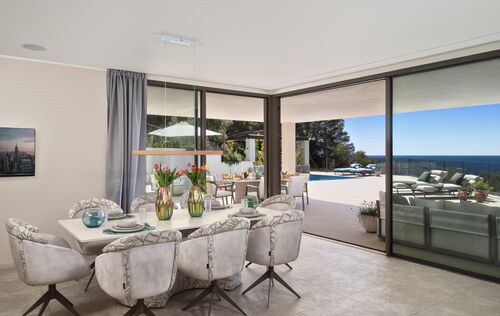 This villa, which was extensively modernised in 2023, is located on an elevated hillside in Costa de la Calma, a quiet residential area above the bay of Santa Ponsa. From here, there are sweeping views across the coastline to the open sea. The atmosphere is particularly impressive in the evening hours - the south-west facing location allows fascinating sunsets almost daily, which can be experienced from several areas of the villa. The property extends over three floors and impresses with its clear design, bright rooms and well thought-out room concept. The centrepiece is the open-plan living and dining area with a high-quality American kitchen. A fireplace provides pleasant warmth and a cosy atmosphere on cooler days. From this area, there is direct access to the spacious terrace with a covered dining area and an infinity saltwater pool - an ideal place for quiet moments or socialising. The villa offers a total of five bedrooms, each with its own bathroom. The master bedroom with dressing room and en suite bathroom is located on the main level. On the upper floor there is a further bedroom with bathroom and private terrace, which has a separate entrance so that it can be used as a guest appartment. The lower level of the house can be used for a variety of purposes: there is a fitness room with sauna and shower, a bedroom with en suite bathroom and a separately accessible guest flat with two bedrooms and pre-installed kitchen - an ideal solution for visitors or longer stays. The offer is complemented by a guest WC, a utility room, several storage rooms and a double garage with direct access to the house. A combination of underfloor heating and radiators ensures a pleasant indoor climate in all areas. The outdoor area has also been carefully designed - the saltwater pool and various seating and sunbathing areas blend harmoniously into the overall picture and offer plenty of space to relax. The elevated position creates a feeling of space, tranquillity and privacy. This villa combines modern living with a Mediterranean lifestyle in a quiet yet well-connected location - a home that is ideal both for everyday life and as a retreat.