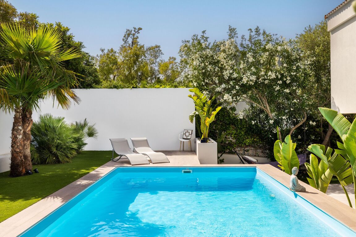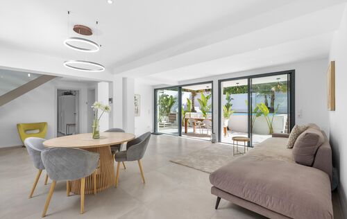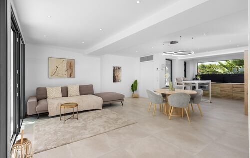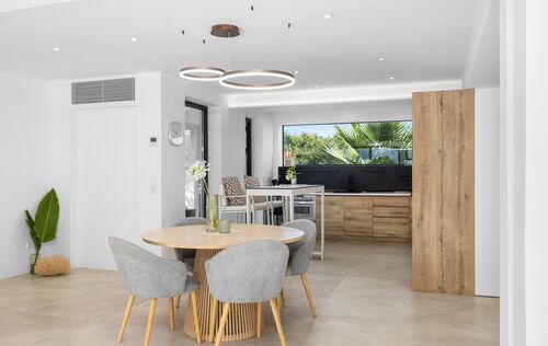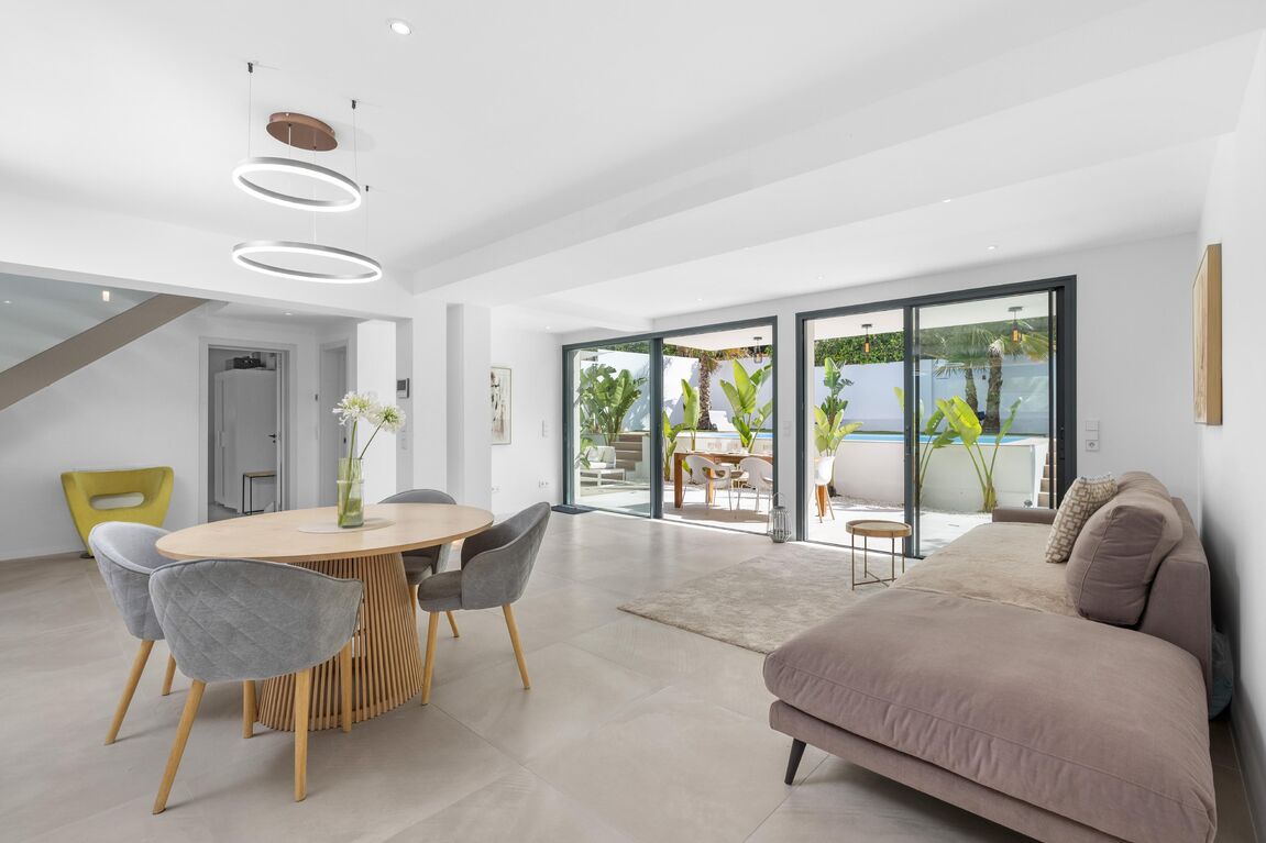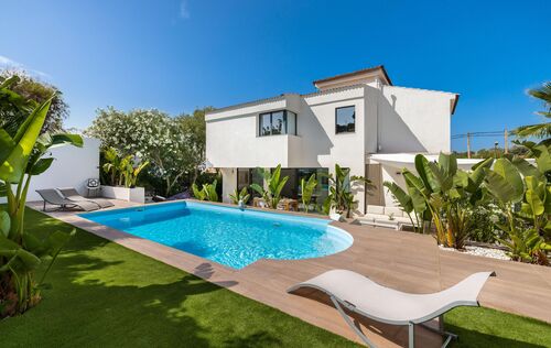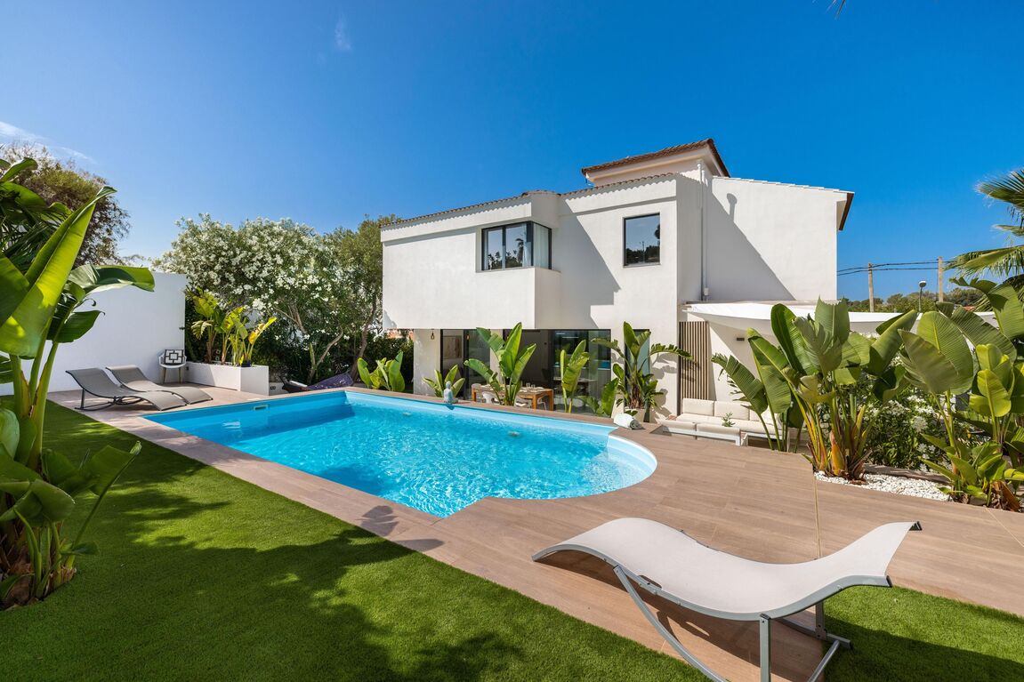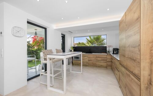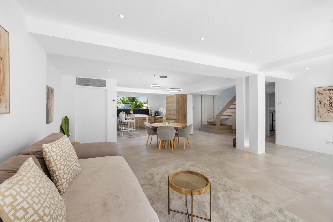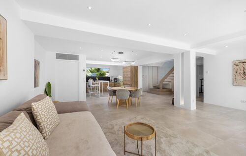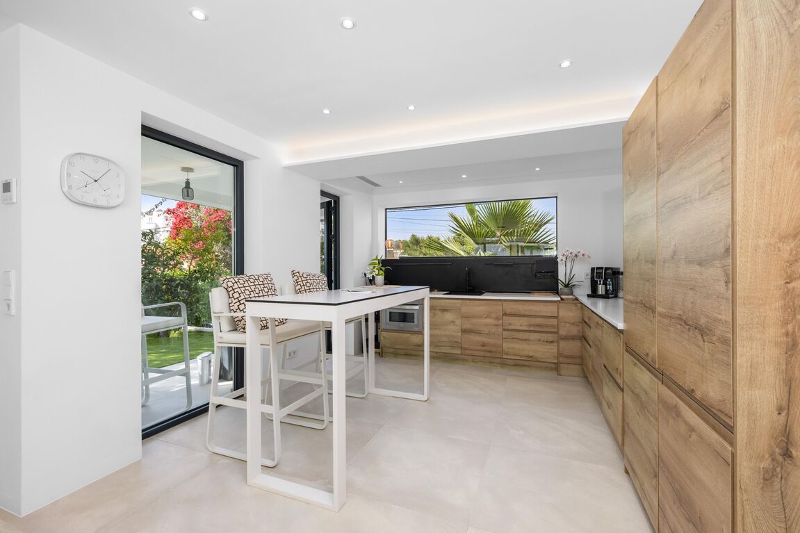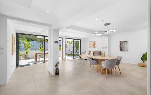 Tucked away in a quiet side street of Palmanova and just a short walk from the sandy beach, this stylish villa offers modern comfort in a prime location. Completed in 2022 (certificate of completion 2022) the property impresses with its solid construction, bright interiors, and well-designed layout. The two-storey home includes three bedrooms, three contemporary bathrooms, a spacious open-plan living and dining area, a fully equipped kitchen, and a utility room. The master bedroom has a size of approx. 40 m² and can be divided into two rooms if needed. Features such as air conditioning, underfloor heating, double-glazed windows, and large-format tiles ensure year-round comfort. Outside, the Mediterranean garden features generous terraces and a saltwater pool, ideal for enjoying Mallorca’s sunshine. Three outdoor parking spaces complete the offering.