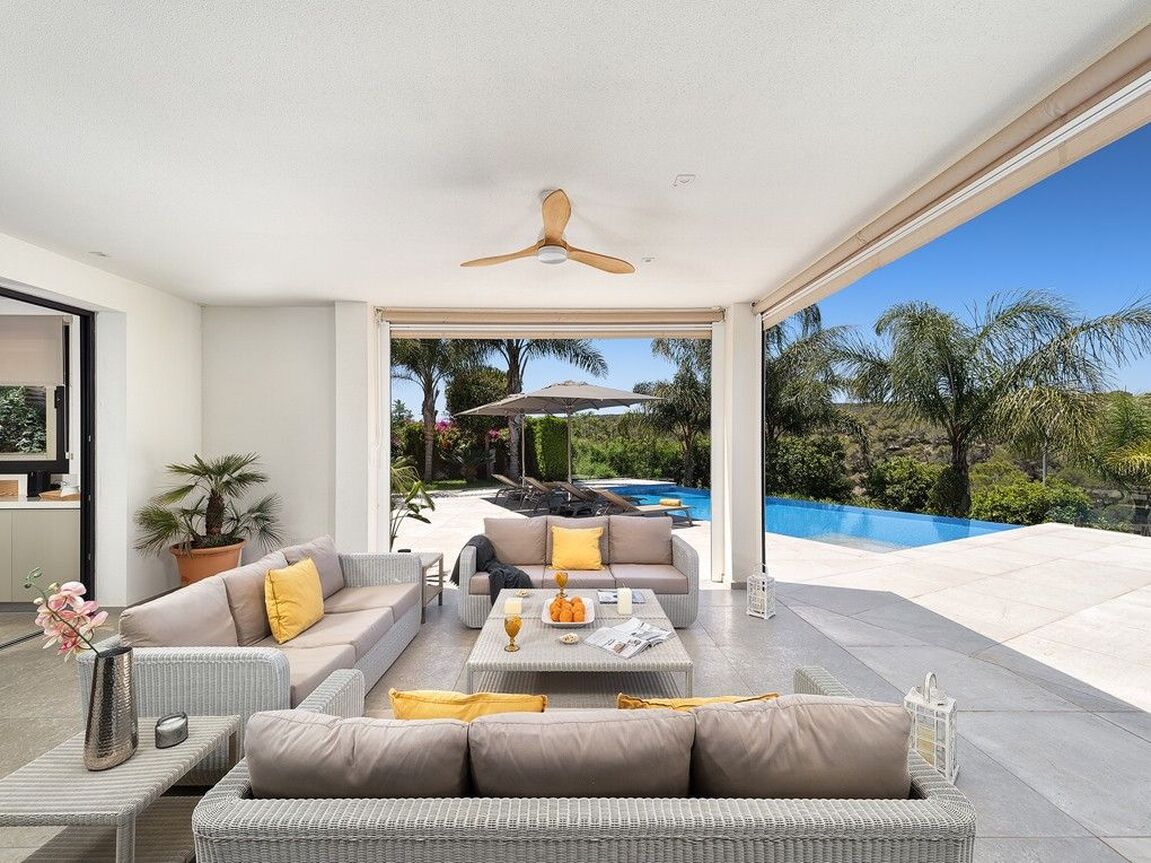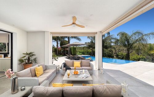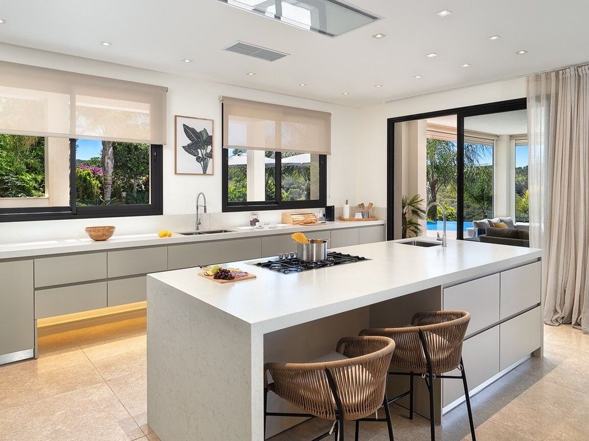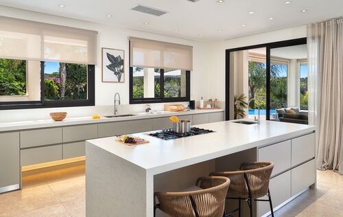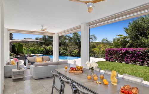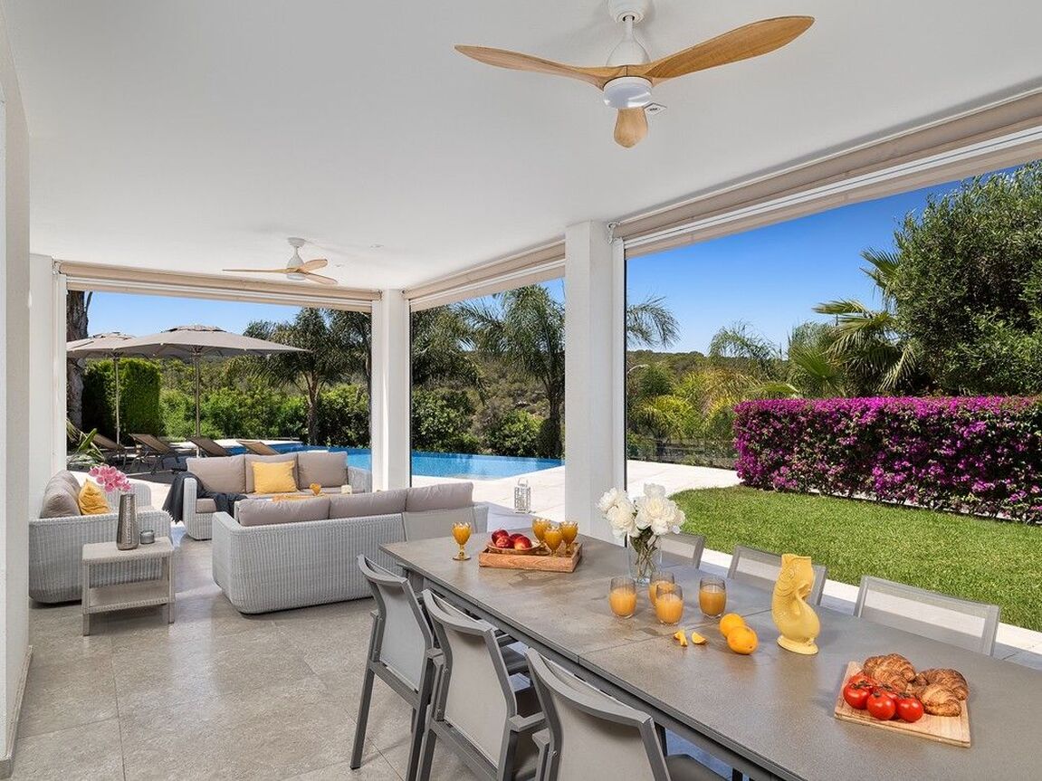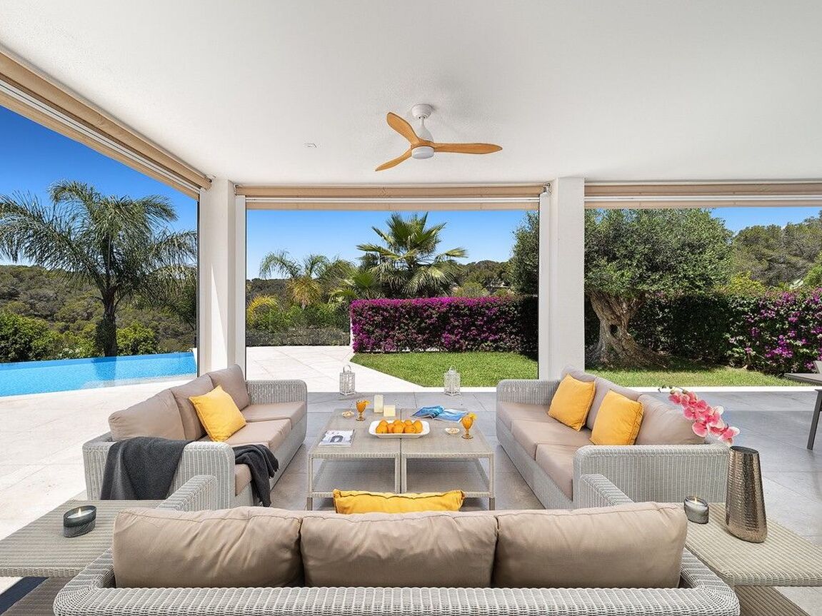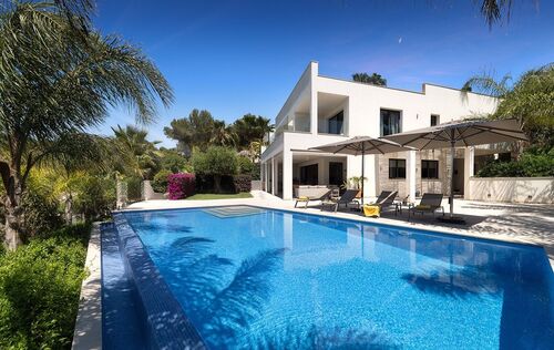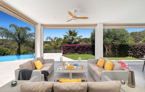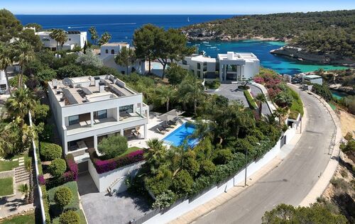 Situated close by the stunning Portals Vells Bay and within the quiet residential neighbourhood of Sol de Mallorca, this recently built villa offers exceptionally comfortable living with open plan spaces and generous terraces. On entering the property you find a foyer, a large living and dining area and kitchen with a central island. There is also a spacious guest bedroom suite, guest WC and laundry area. There are both covered and uncovered terraces on this level to fully enjoy the property all year round, a pool bathroom and a salt water swimming pool. The garden is mature and provides privacy to the neighbours. The first floor consists of two master bedroom suites and two additional bedroom suites, all with access to terraces. Features of the property consist of stone, ceramic and wood flooring, h/c air conditioning, under floor heating through oil, extensive solar panel system, double garage plus additional off-street parking and lift access from the garage to the first floor. There is also access to a roof terrace which offer sea views to Portals Vells Bay and the surrounding green areas. This is a perfect family home for both holidays and permanent living, just a few minutes walk from the beach and 20 minutes from Palma.