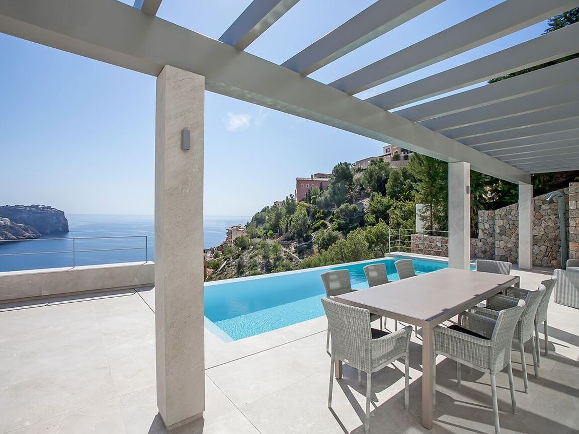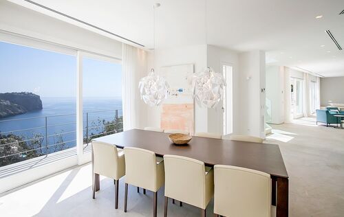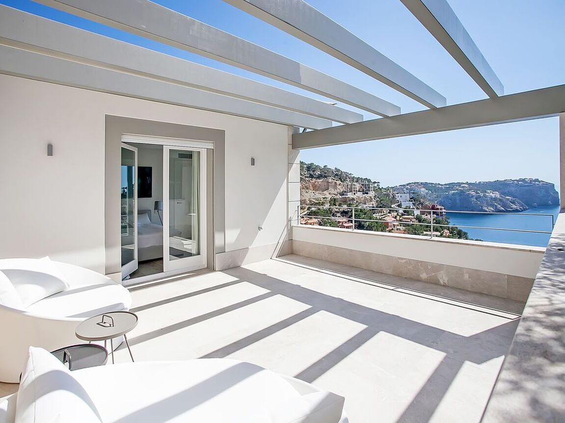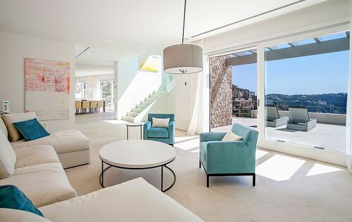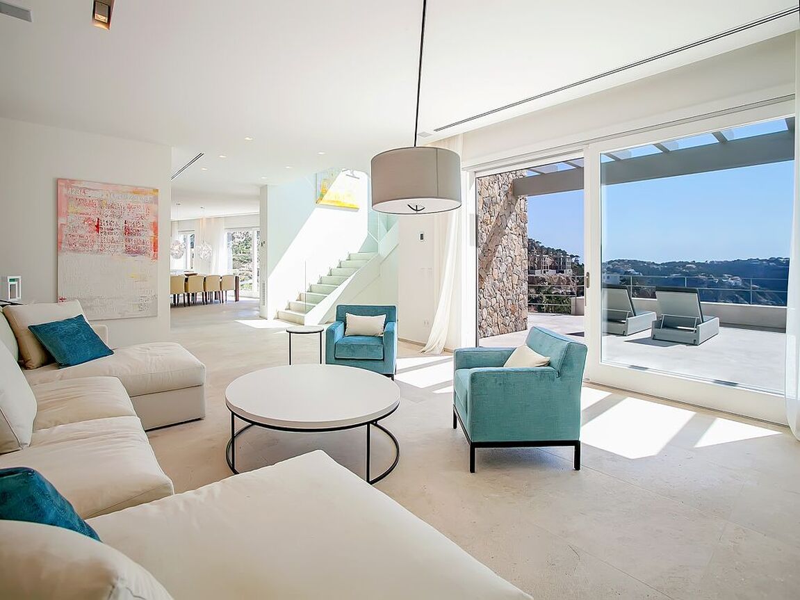 This exquisite villa in Port Andratx offers pure elegance and modern luxury. The exceptional property blends comfort and outstanding design in a unique, sought-after location. Spanning two stylish levels, the villa features four spacious bedrooms, each with its own en-suite bathroom, a guest WC, a large living room, and an open, high-quality kitchen with an adjacent dining area—ideal for social gatherings. The south-facing outdoor area, with an impressive pool and expansive terrace, provides breathtaking views of the sparkling sea and invites relaxation. The villa impresses not only with its dreamlike location but also with the use of the finest, light-filled materials and an interior that meets the highest standards. Among the many extras are an alarm system, air conditioning (heating and cooling), underfloor heating, a video intercom system, a stylish fireplace, and a high-quality sound system—ensuring every need is met and making this villa a true gem.
