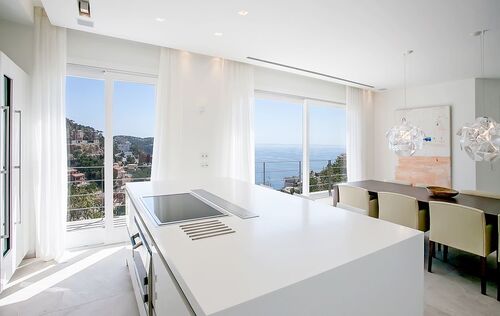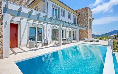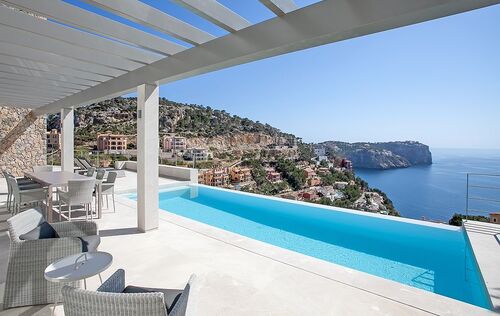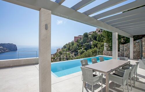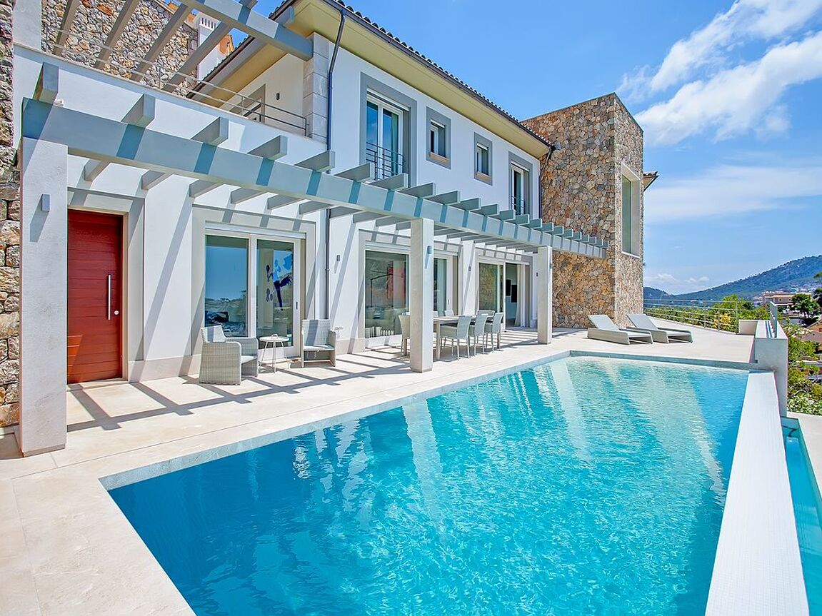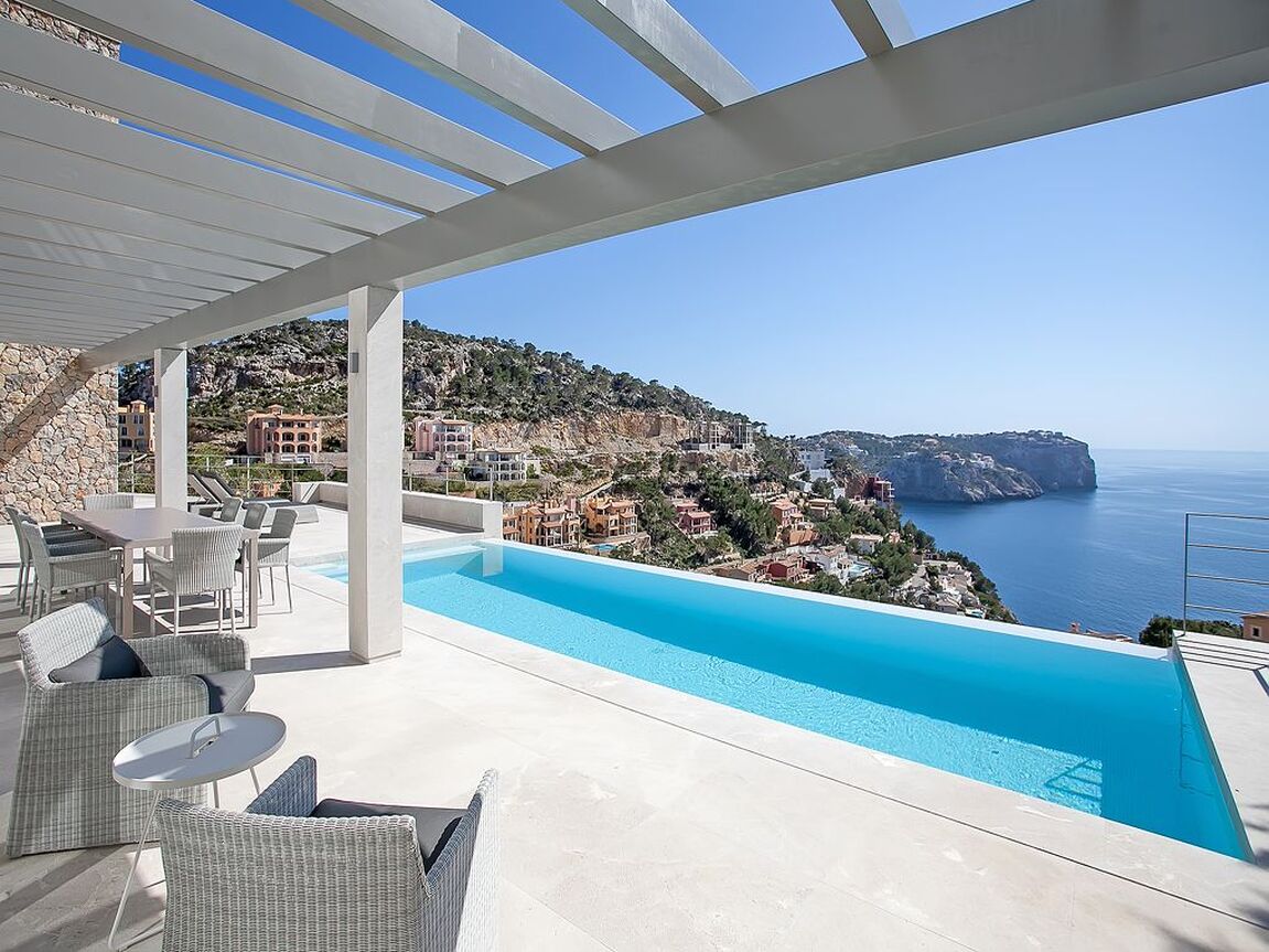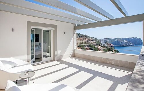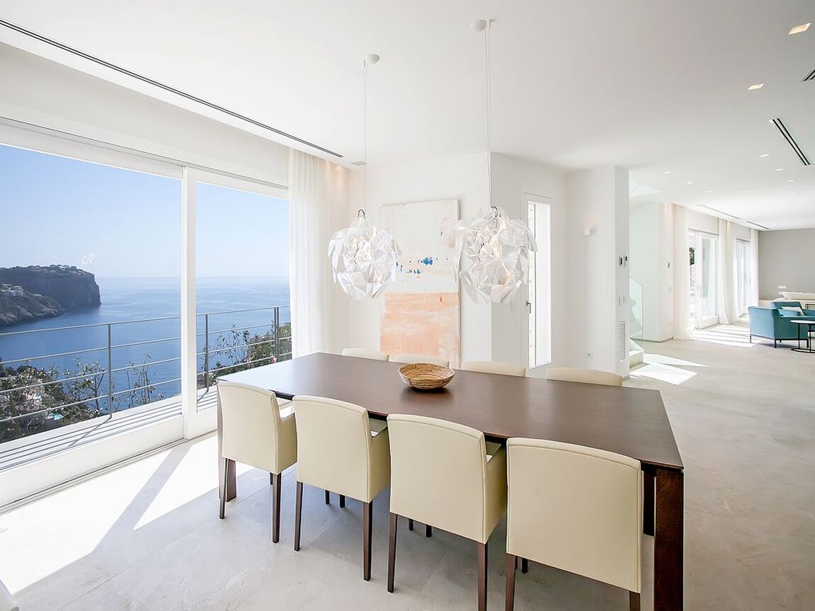 This exquisite villa in Port Andratx offers pure elegance and modern luxury. The exceptional property blends comfort and outstanding design in a unique, sought-after location. Spanning two stylish levels, the villa features four spacious bedrooms, each with its own en-suite bathroom, a guest WC, a large living room, and an open, high-quality kitchen with an adjacent dining area—ideal for social gatherings. The south-facing outdoor area, with an impressive pool and expansive terrace, provides breathtaking views of the sparkling sea and invites relaxation. The villa impresses not only with its dreamlike location but also with the use of the finest, light-filled materials and an interior that meets the highest standards. Among the many extras are an alarm system, air conditioning (heating and cooling), underfloor heating, a video intercom system, a stylish fireplace, and a high-quality sound system—ensuring every need is met and making this villa a true gem.
