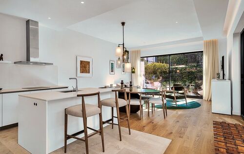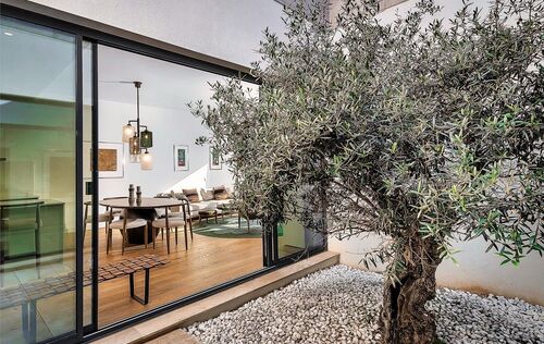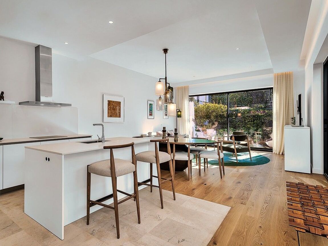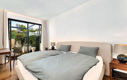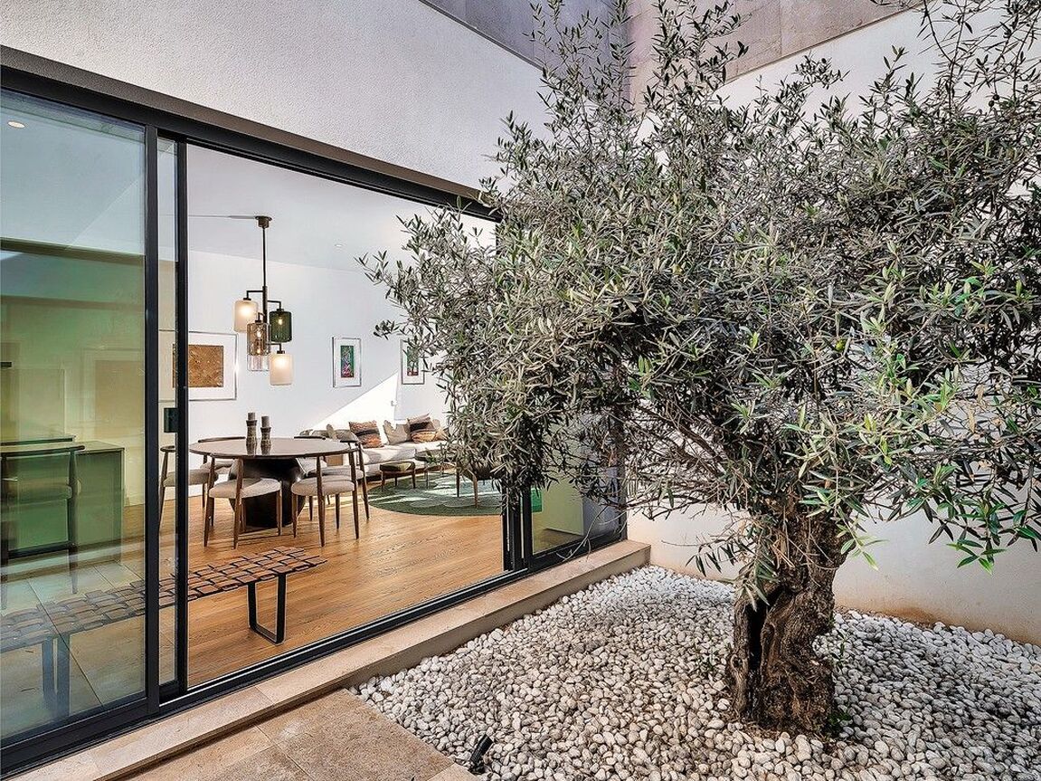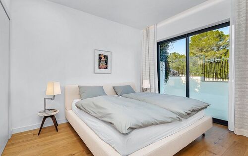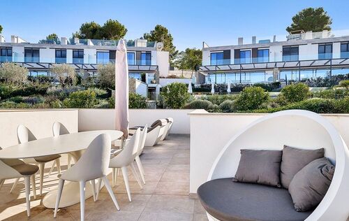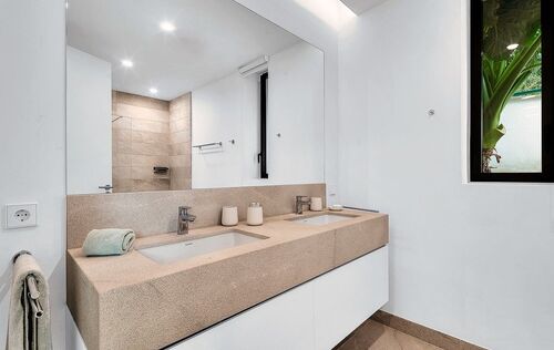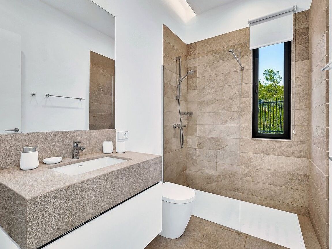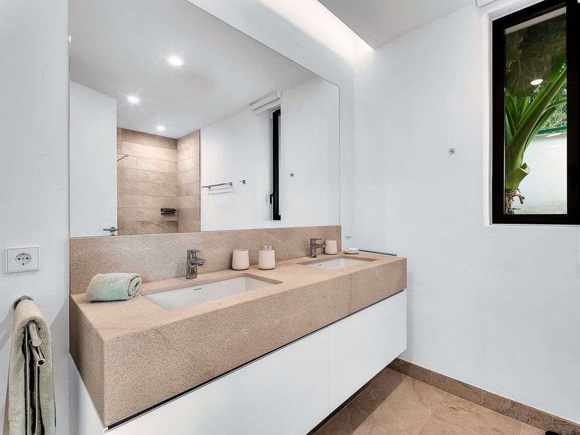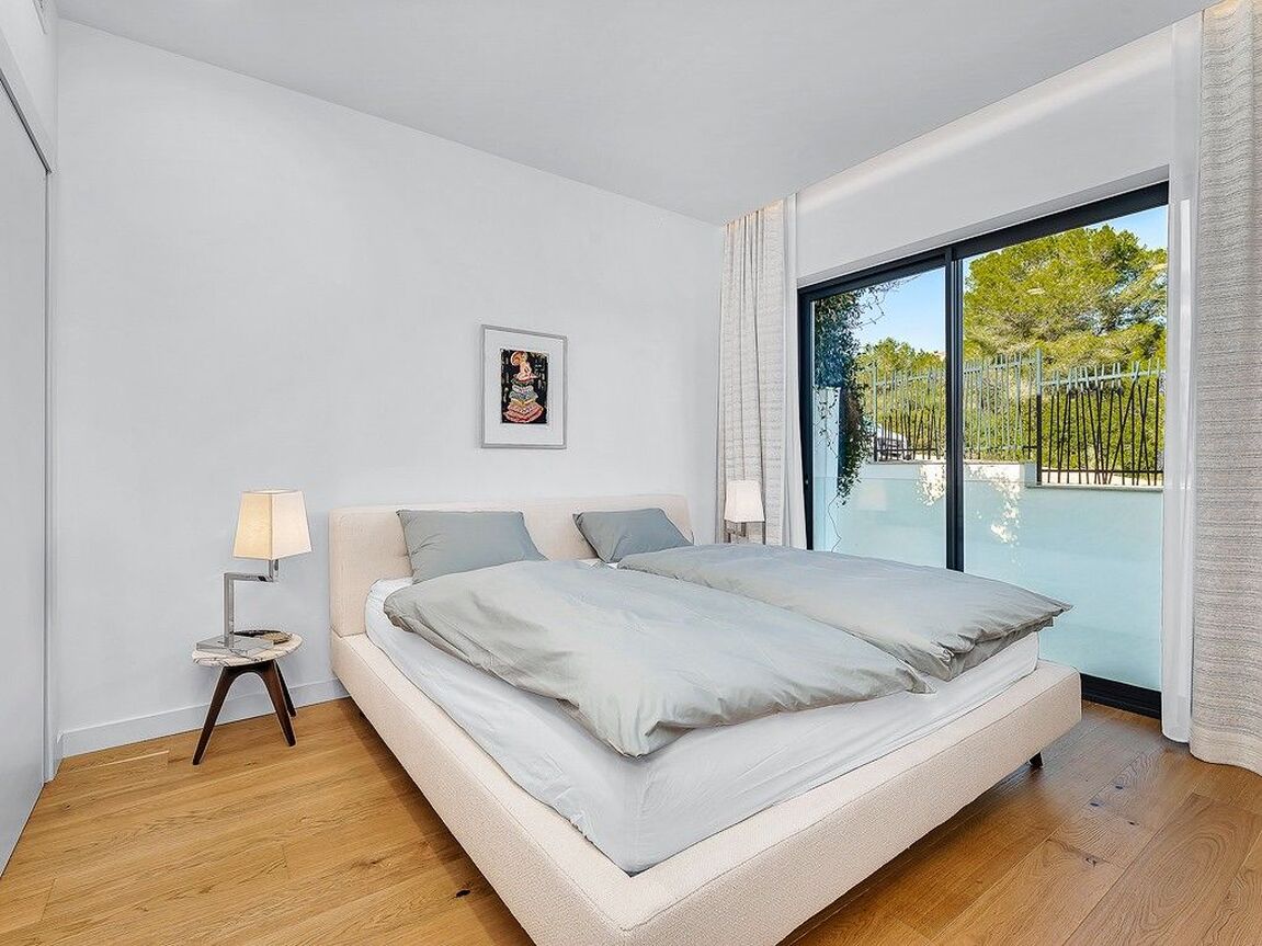 Discover luxury living in the newly built gated community at Cala Vinyas, a stunning residential development tailored for those seeking the perfect blend of a holiday retreat and a year-round residence. Nestled within walking distance to the picturesque Cala Vinyas beach, this exclusive property offers an unparalleled lifestyle experience. The allure of this residence lies in its thoughtful design, emphasizing both comfort and aesthetics. The living area, strategically placed on one level, boasts a seamless flow, ensuring convenience and accessibility. Two generously sized bedrooms share a lavish bathroom, while a master suite exudes opulence with a spacious walking closet and a bathroom en-suite. The heart of this residence is its fully equipped modern Bulthaup kitchen, a haven for culinary enthusiasts. The open layout of the kitchen extends to the living area, promoting a sense of togetherness and sociability. The Mediterranean sunlight floods the interior, courtesy of the magnificent glass patio adorned with a majestic olive tree. This unique feature not only enhances the aesthetic appeal but also creates a tranquil ambiance, connecting the indoor and outdoor spaces seamlessly. Step outside to the expansive garden, a verdant oasis that invites relaxation and outdoor entertainment. The focal point of this outdoor haven is the inviting pool, offering a refreshing escape during warm Mediterranean days. In addition, you can enjoy as well the spacious rooftop terrace with beautiful views to the community gardens and the green areas surrounding the neighborhood.