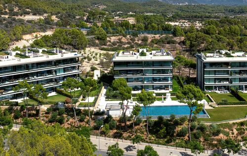 Contemporary luxury living, intelligent layouts and a dreamlike panoramic view over the Mediterranean landscape and the sea to the picturesque Malgrats Islands, all this is offered by this unique new development in the southwest of Mallorca. The project consists of 2 residential complexes: One complex with a total of 28 exclusive apartments in 3 buildings and an inviting communal pool with chill-out area and pool bar. Here you can enjoy a fantastic sea view even from the garden apartments. In the 6 buildings of the second complex, with 2 large community pools and a children’s playground, a further 42 luxury apartments are being built. In addition, both complexes have an underground car park. The main focus of the project was on integration into the original landscape. Lush Mediterranean plants give the community the special atmosphere of a Mediterranean oasis. Furthermore, it is characterized by a sophisticated architectural concept, developed by an international team of architects. All apartments have large window fronts, high ceilings and convince with a great combination of natural materials and modern elements. The overall concept is completed by a well thought-out and very high-quality interior: designer kitchen and built-in cabinets by Poliform, Fantini fittings, minimalist floor-to-ceiling windows by Panoramah, and much more. All garden apartments have large, lush gardens, and most of the penthouses have roof terraces with lounge areas and Jacuzzis. Several beaches as well as cafés and restaurants are within walking distance.