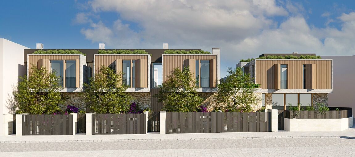 This modern new-build Property in Palma's popular Son Espanyolet district consists of four exclusive houses that stand out for their contemporary architecture, high-quality features, and beautiful private outdoor areas. The location is quiet yet very central. Within just a few minutes' walk, you can reach the vibrant Santa Catalina neighborhood with its numerous excellent restaurants and cafés, Palma’s historic city center, and the Paseo Marítimo, which invites you to linger with its wide pedestrian zones and charming squares. The four modern houses have been designed with great attention to detail and offer three spacious bedrooms and three bathrooms across three floors. Each home benefits from an open design concept that creates bright, light-filled spaces and seamlessly connects the interior with the outdoor areas. The large terraces and private outdoor spaces with a pool invite you to enjoy Mallorca’s mild Mediterranean climate all year round. The architecture features clean lines and a modern aesthetic that is both functional and visually appealing. Notable aspects of the houses include high-quality construction and the use of premium materials. The exterior walls are clad in Mallorcan natural stone, while the interiors feature elegant oak flooring and stylish terrazzo tiles. The spacious kitchen, equipped with Siemens built-in appliances, integrates perfectly into the open living concept. For year-round comfort, each home is equipped with an individually adjustable air conditioning system and underfloor heating. Additionally, the houses feature KNX smart home technology, allowing you to control essential household functions via your smartphone. Each house also comes with private covered or uncovered parking spaces. This real estate combines modern design and exclusive living quality in a prime location, offering a unique residential experience in Palma. The area is also well-suited for families living in Mallorca year-round, as several schools are located nearby.