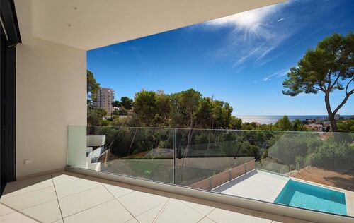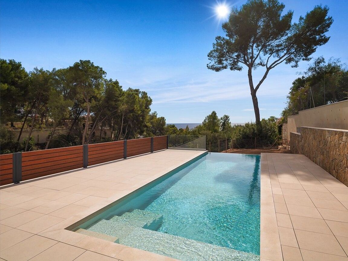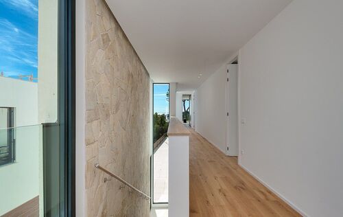 This independent 3-bedroom villa offers stunning sea views and is fully finished and furnished, making it ready to move in. The heart of the villa is the spacious living and dining area, which includes an integrated kitchen with an island and breakfast bar, leading out to the expansive private pool terrace. On the living level, in addition to the open kitchen, there is a small secondary kitchen, a guest restroom, a storage room, and a multipurpose room that can be used as a fitness area or a TV and game room. The three spacious double bedrooms are located on the upper floor and each has built-in wardrobes and en-suite bathrooms. In the basement, alongside the technical room, there is a fully equipped laundry room. The modern design and high-quality finishes — including LEICHT kitchens with Miele and Siemens appliances, natural stone flooring and oak parquet, floor-to-ceiling doors, air conditioning, underfloor heating with heat pump, KNX home automation, and a private garage — ensure a comfortable and high-end lifestyle. Within walking distance is the small Cala Nova marina, which offers a wide range of water sports, as well as several sandy coves, shops, and restaurants. Additionally, there are several international schools nearby, making this property the perfect home for families wishing to live year-round in Mallorca.