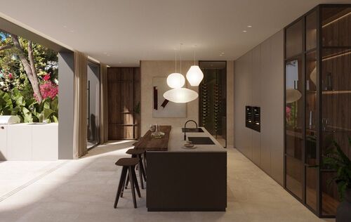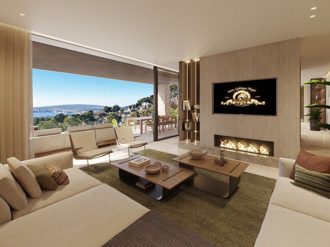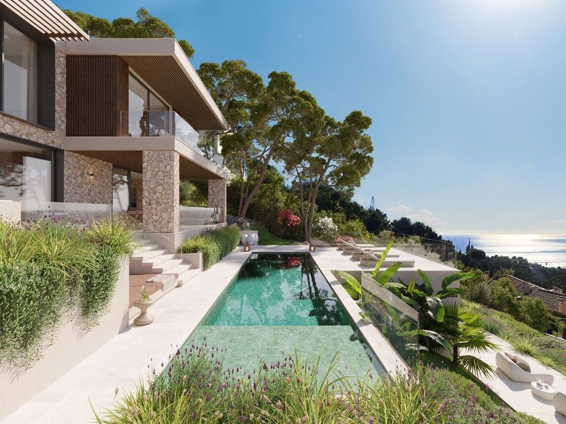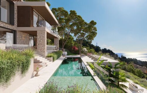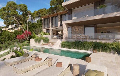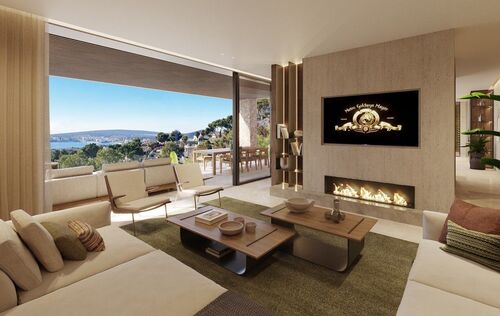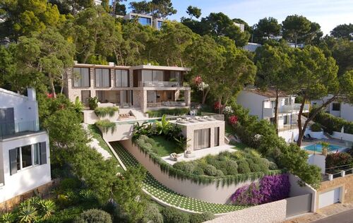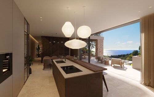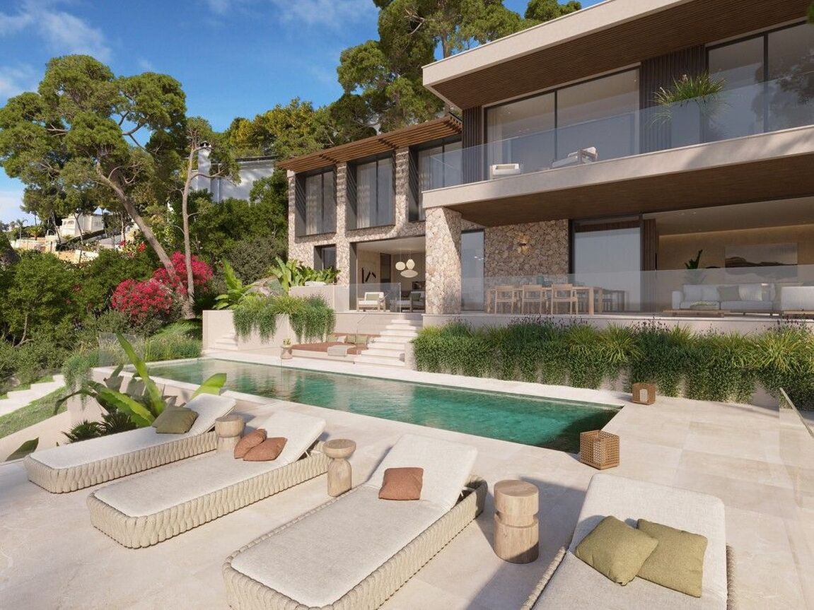 Casa Roca: This new villa currently in construction, will offer a luxury standard of living. Private and yet close to all amenities, it will be a timeless home to gather family together for special moments. Generous living spaces filled with light which will greet you the moment you enter. Wherever you are, whether inside, or out on the superb pool terrace, your eye will constantly be drawn to the beautiful, panoramic sea views over the Bay of Palmanova. On the living level, you will enjoy a fully equipped kitchen with high end appliances, together with the open living dining area which has a natural flow out to the covered and open terrace, summer kitchen, chill-out lounge, and swimming pool. Stairs or the lift will take you to the first floor where you will find a large master suite with its own walk-in closet, bathroom and private terrace, as well as 3 comfortable bedroom suites. For those guests who appreciate a little more privacy, an independent guest suite can be accessed from the lush garden via the pool terrace. The basement level includes a gym, cinema and a 2-car garage. Further extras include underfloor heating, a/c, fireplace and bodega. Completion summer 2025. To fully appreciate the layout and quality materials please contact us to arrange a visit..