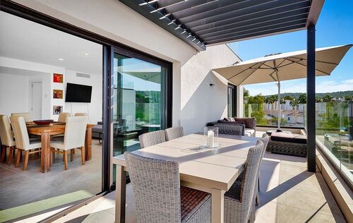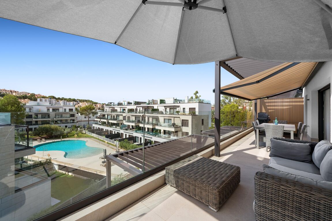 Discover luxurious living in Santa Ponsa’s exquisite penthouse, nestled within a charming community. This meticulously designed residence exudes elegance, inviting you into a world of sophistication where every detail has been crafted to perfection. Enjoy generous outdoor spaces with a 30 m² terrace adjoining the living area and an impressive 90 m² rooftop terrace, the crown jewel of this exceptional home. This private oasis features a refreshing plunge pool and breathtaking views – the perfect place to soak up the Mallorcan sun in complete serenity.