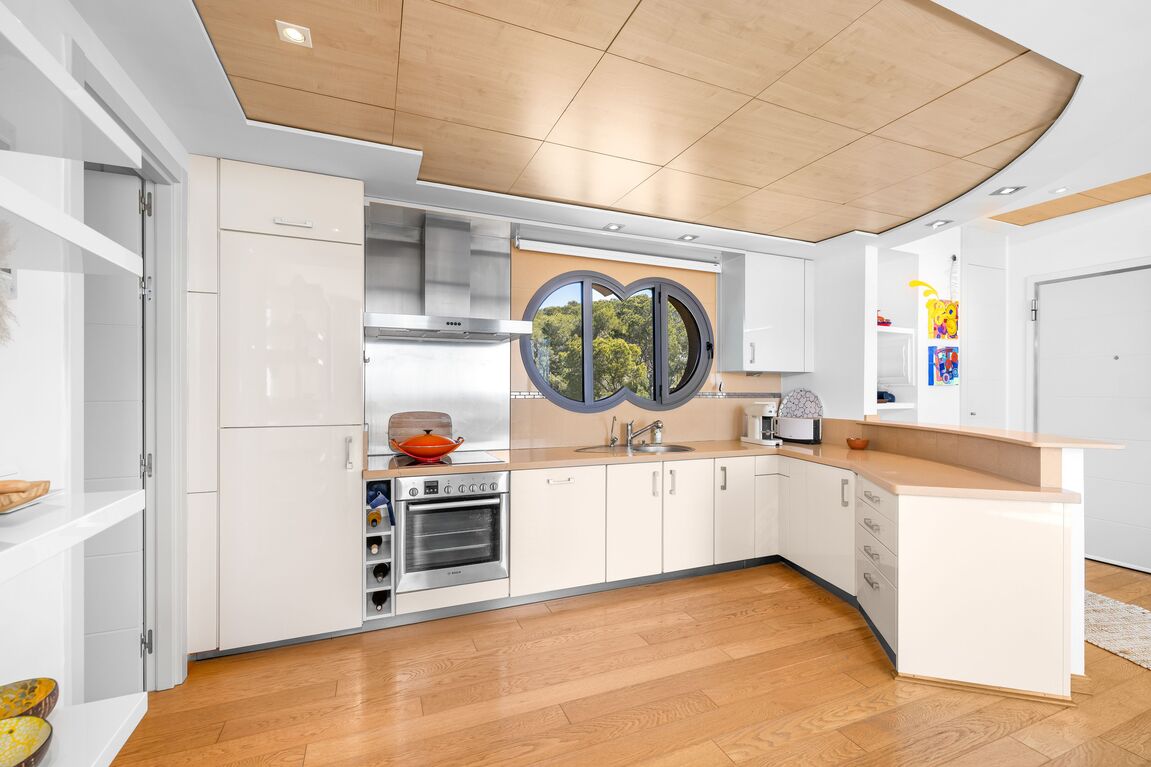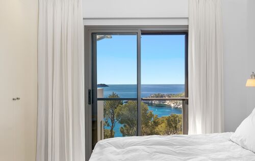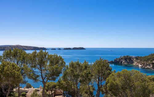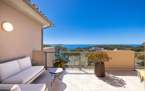 Situated in an elevated and exceptionally quiet location in Cala Fornells, this light-filled penthouse is located within the well-maintained residential complex Las Olas III—an exceptional property distinguished by its ideal south-facing orientation, breathtaking panoramic sea views, and a high degree of privacy. From the moment you enter, it becomes clear that the layout has been thoughtfully designed: the living area as well as both bedrooms are fully oriented towards the sea. Large windows allow natural light to flood the interiors throughout the day, creating a bright and open atmosphere. The views stretch far along the coastline, framed by the surrounding mountains, offering a rare combination of space and tranquility. The apartment offers a living area of approximately 99 m², complemented by an open sun terrace of around 27 m², resulting in a total area of about 126 m². The terrace naturally extends the living space, creating a seamless transition between indoor and outdoor living. Thanks to its elevated position, you can enjoy unobstructed views and a true holiday-like ambiance. The living and dining area flows seamlessly into the kitchen, creating a spacious and cohesive feel. Light color tones and warm parquet flooring lend the apartment a timeless, welcoming atmosphere with a subtle Mediterranean character. The two bedrooms are harmoniously proportioned and oriented towards the sea. The master bedroom features an en-suite bathroom, complemented by a second, separate bathroom. Both bathrooms are well-maintained and designed in a neutral, functional style. Year-round comfort is ensured by air conditioning with both heating and cooling functions, as well as an elevator providing convenient access to the apartment. The property features a spacious laundry/storage room, as well as a parking space. The residential complex stands out for its clear architectural structure, generous pool areas, and excellent overall condition. The international community of owners is quality-conscious and long-term oriented—an important factor for the sustained value stability of the property. The communal areas, including the pool with sea views, are harmoniously integrated into the natural surroundings with Mediterranean gardens, creating a relaxed atmosphere. Cala Fornells is one of the southwest of Mallorca’s most characterful locations, defined by nature, tranquility, and an established setting. A small, idyllic bay with crystal-clear water is just minutes away. Coastal hiking trails start directly from the complex, while Peguera’s beaches, restaurants, and shops are within easy walking distance. The property combines prime location, orientation, and quality of living. A penthouse for buyers who value peace, views, and a harmonious environment—and who recognize the exceptional in the quality of details.